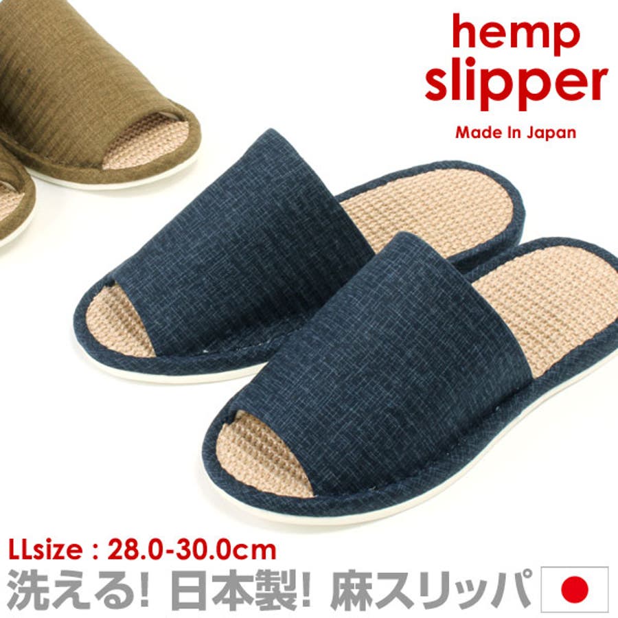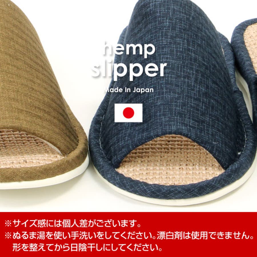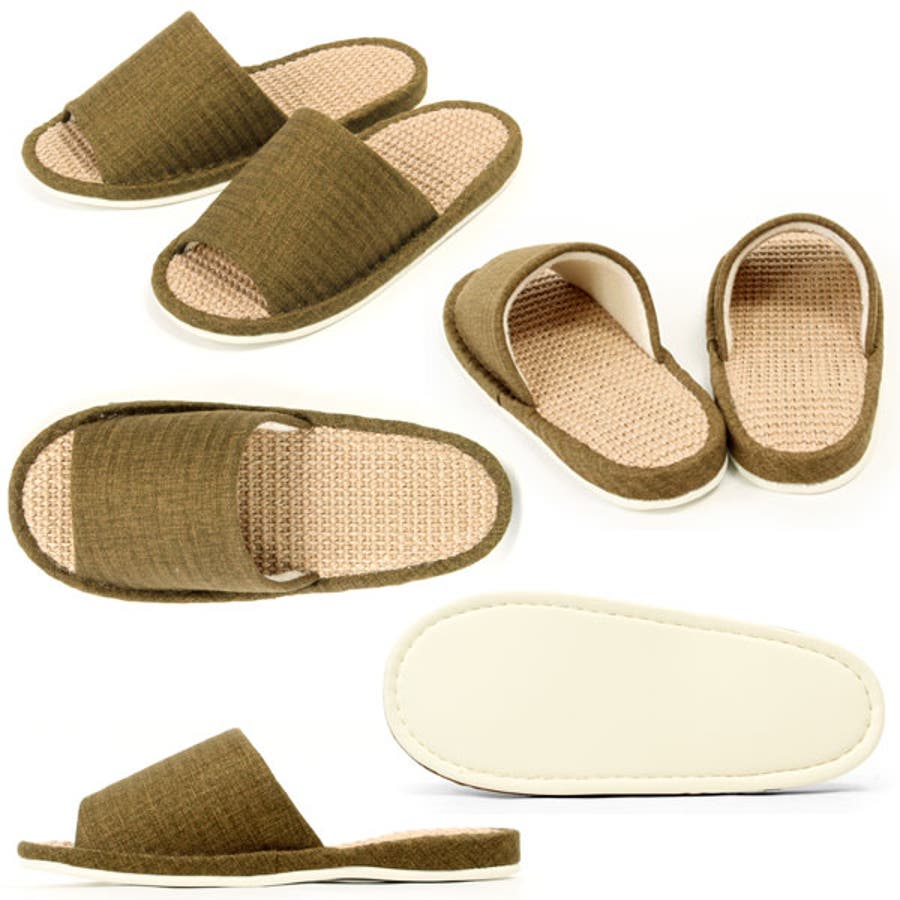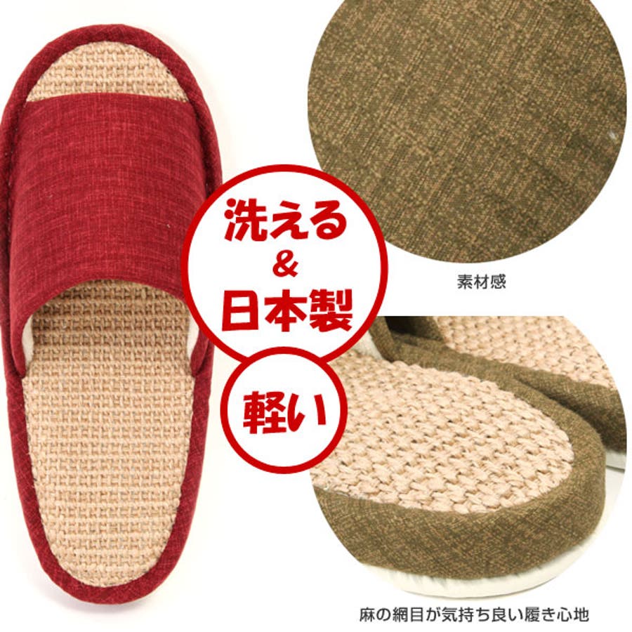 麻素材スリッパ。インソールには麻素材が敷き詰めてあり、通気性も抜群。暑い時期にも蒸れにくく快適。足の甲にあたる部分はパイル地のような柔らか素材でソフトな履き心地。安心の日本製で、ぬるま湯で手洗いもできるので快適さも長持ち♪
