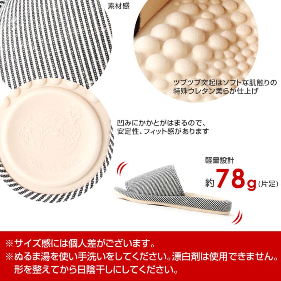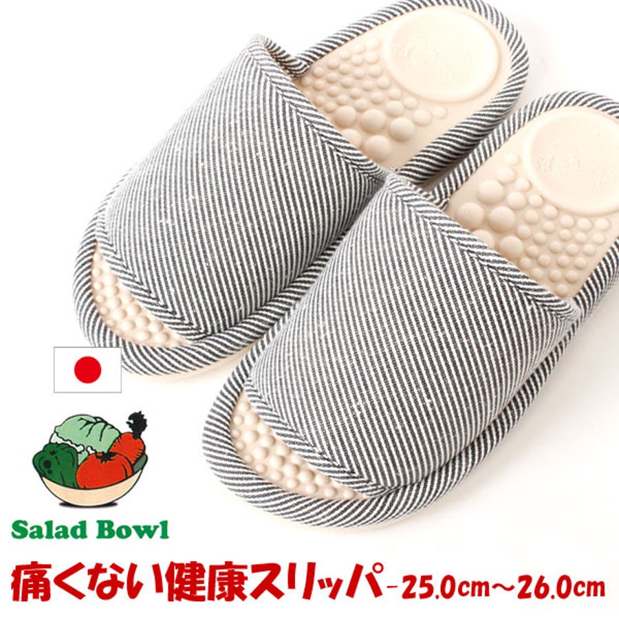 サラダボウルは、痛くなりにくい健康スリッパ。踵部分の丸い凹みは「サラダボール(意匠登録)」で、凹みにかかとがはまるので、安定性、フィット感があります。インソールのツブツブ突起はソフトな肌触りの特殊ウレタン柔らか仕上げ。足裏を程よく刺激し長時間履いても痛くならないよう設計。冬は暖かく、夏は快適に履いていただけます。そして軽量仕様。