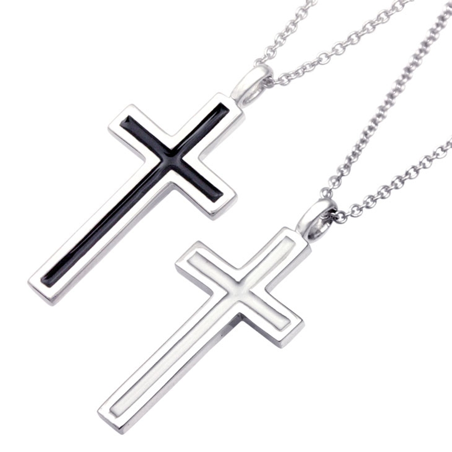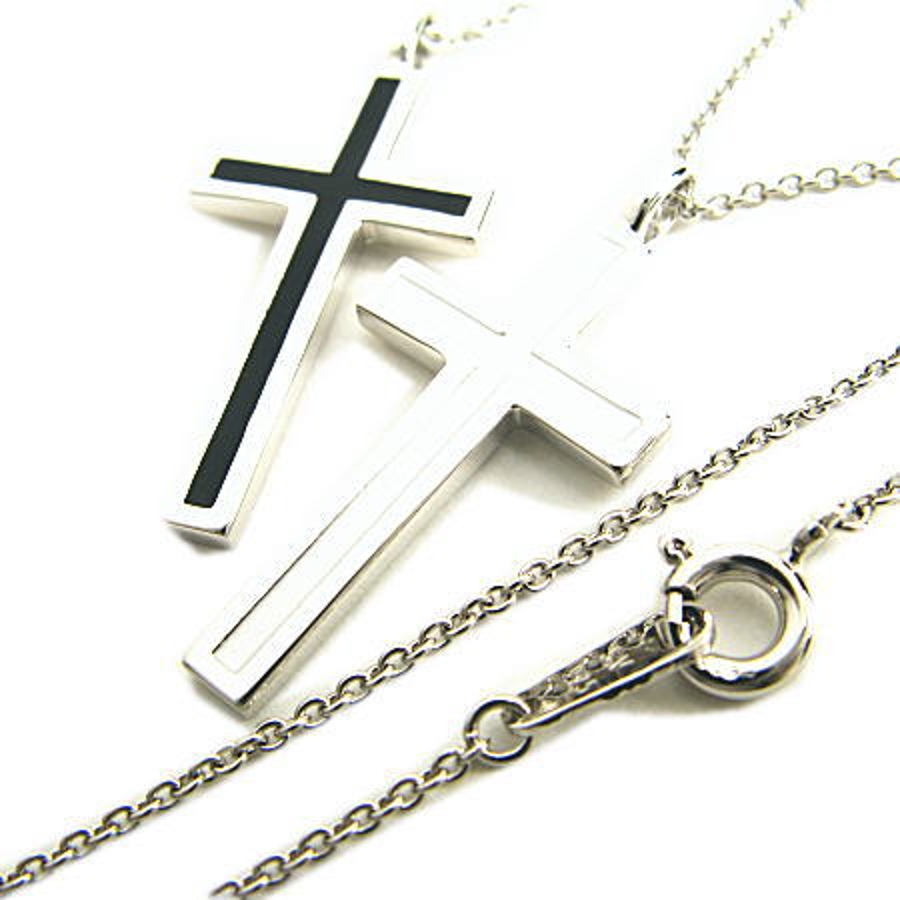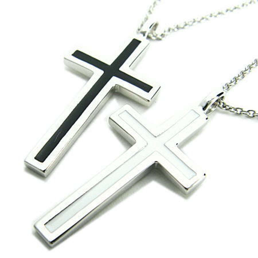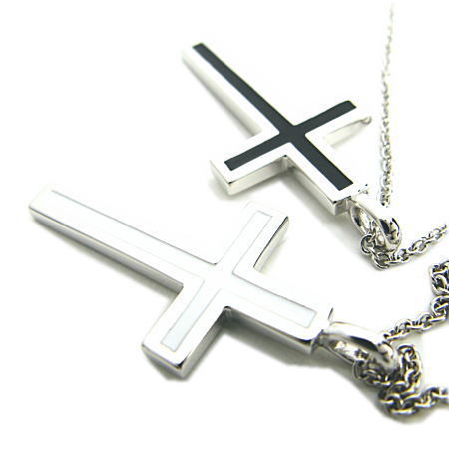 ホワイトとブラックのコントラストがスタイリッシュなペアネックレス。シンプルクロスなのにエナメルの斬新さが引き立ちます。