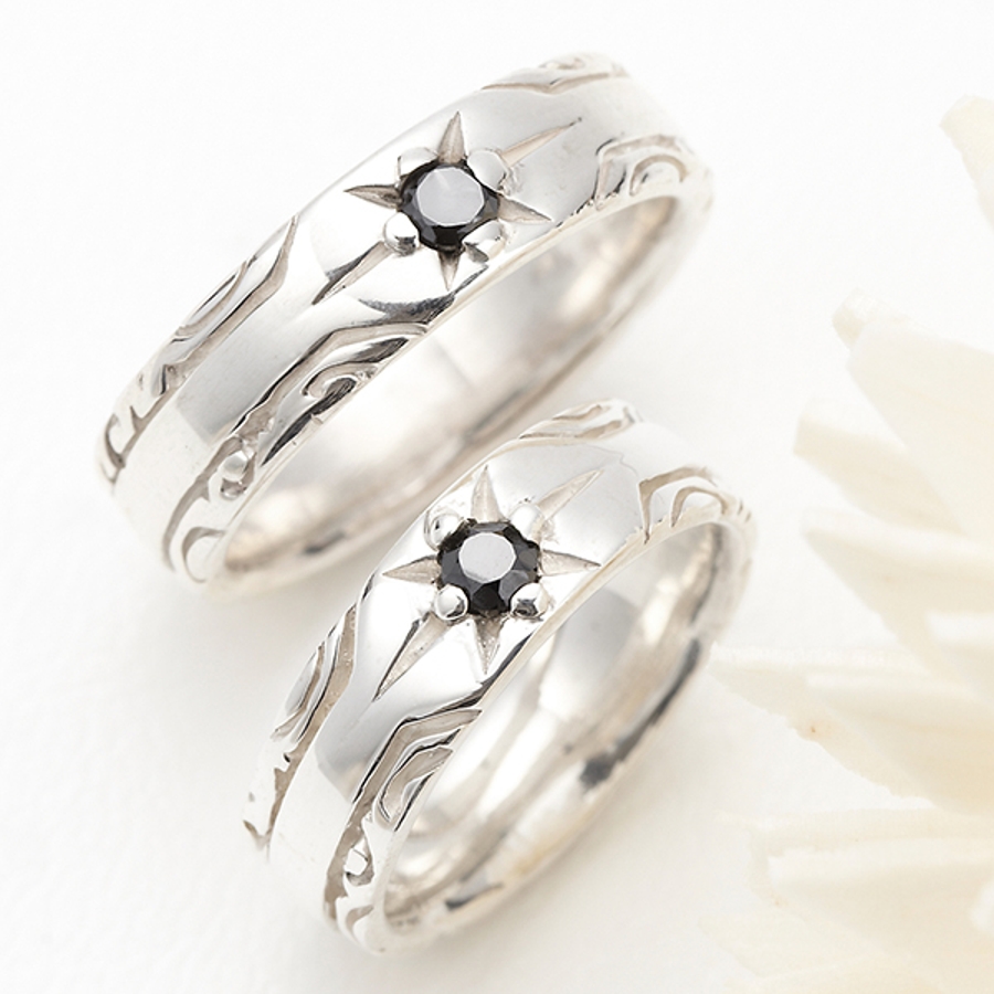 ブラックジルコニアを1粒中央にセットし、太陽モチーフの彫柄を施しました。