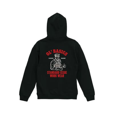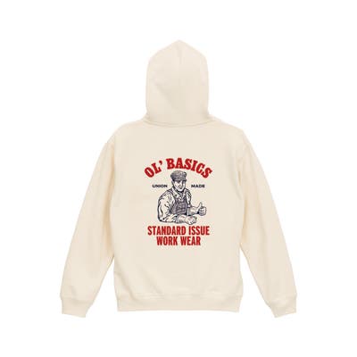 ・バックにアメカジライクなワーカーイラストをプリントしたスエットパーカー