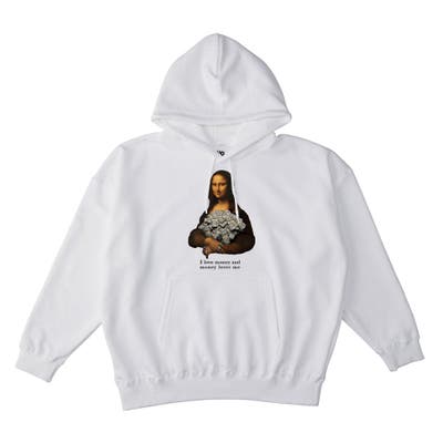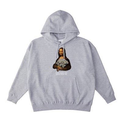 ・パロディのモナリザとメッセージロゴが映えるオーバーサイズのスエットパーカー