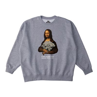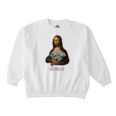 ・パロディのモナリザとメッセージロゴが映えるオーバーサイズのスエットトレーナー