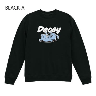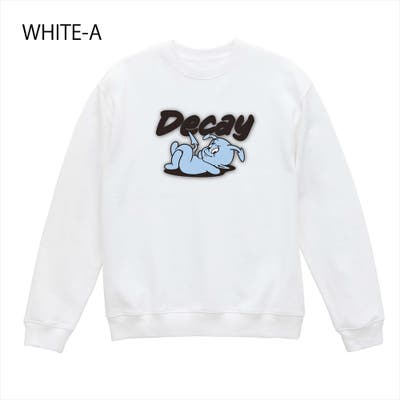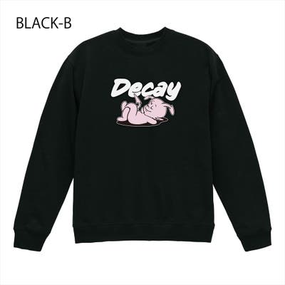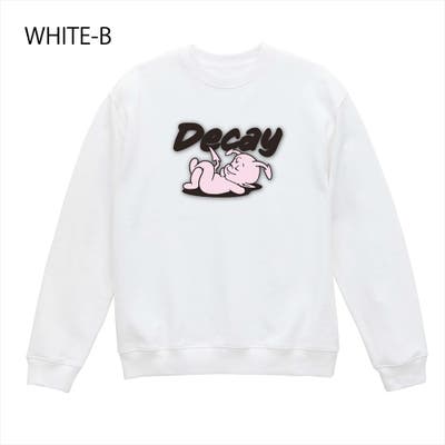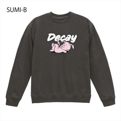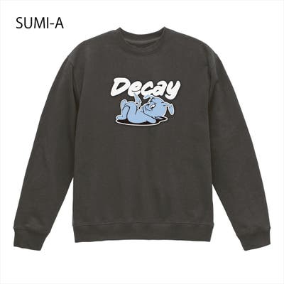 ・「減衰」などの意味のロゴと、怠惰なデビルイラストが映えるプリントデザインのスエットトレーナー