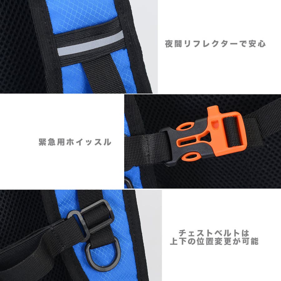 上下に位置変更可能なチェストベルトのバックルにはホイッスルを一体化。緊急時に素早く使えます