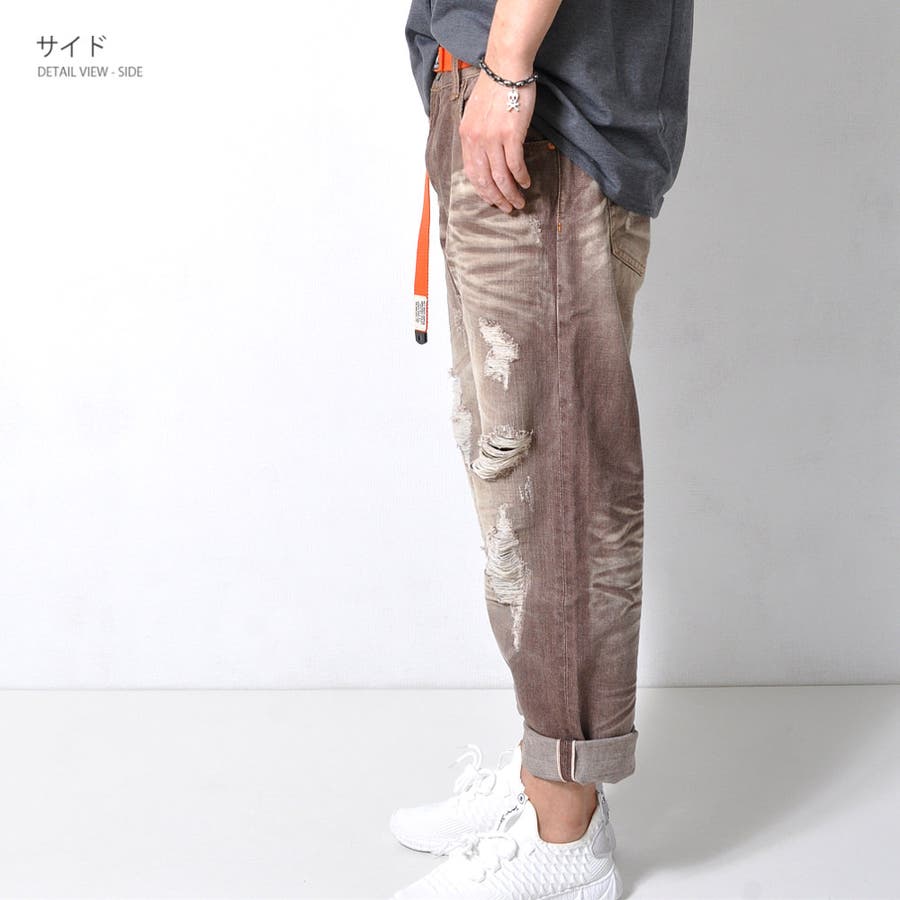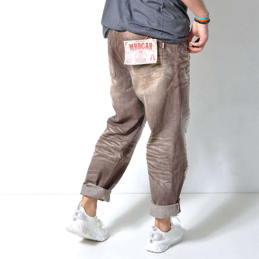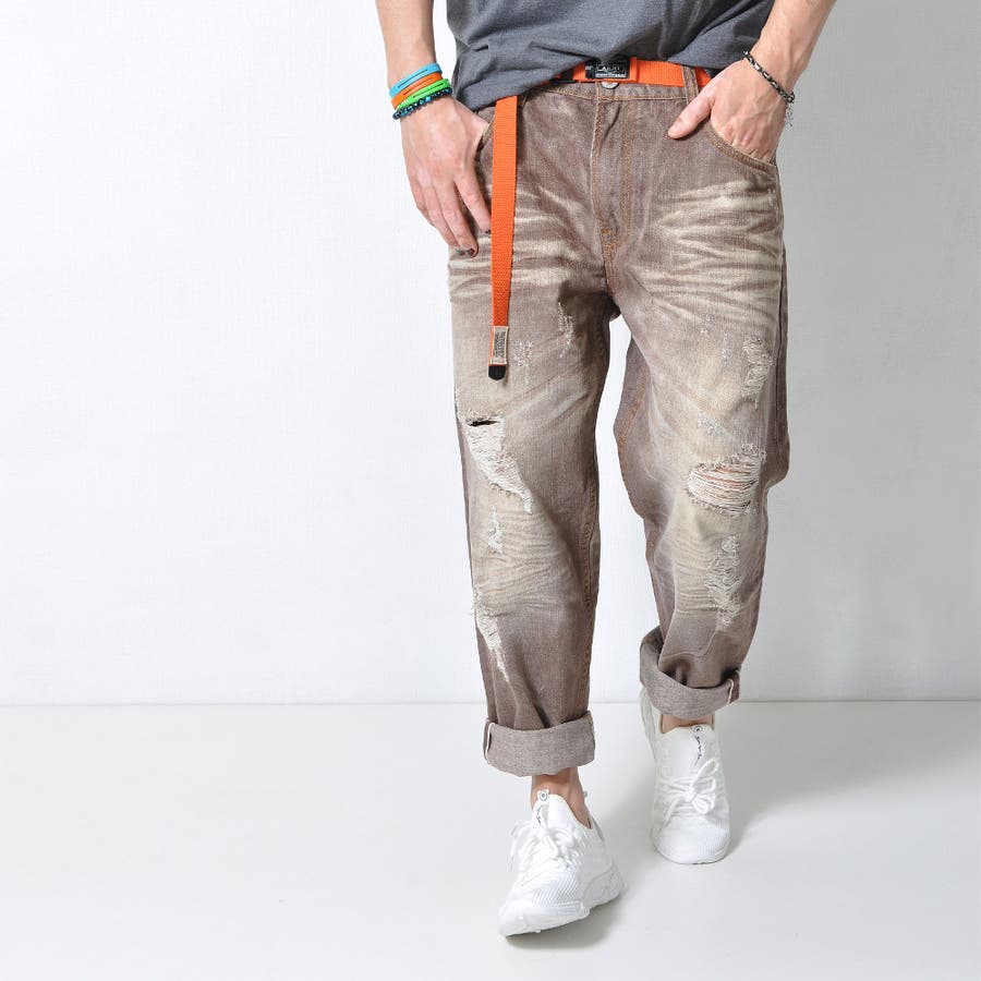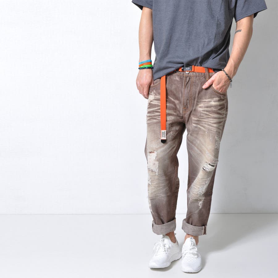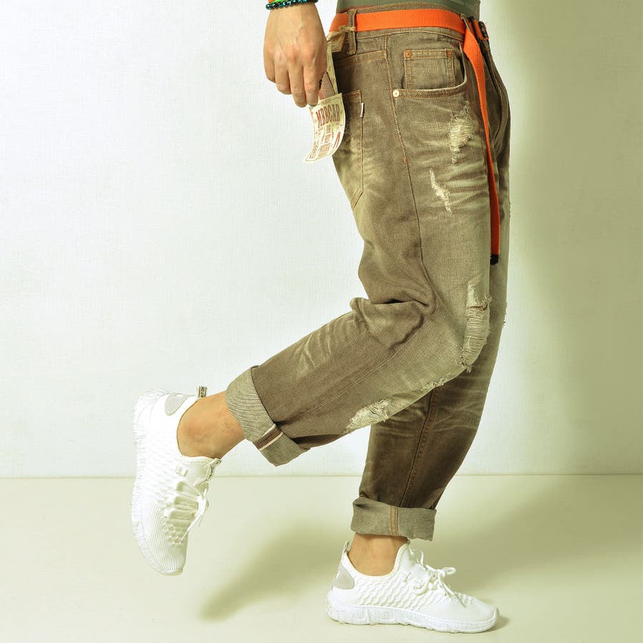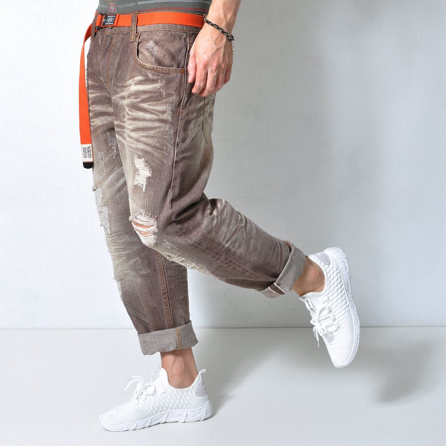ブラウンのシルエットとクラッシュ・ダメージ加工が施されたデニムパンツ
