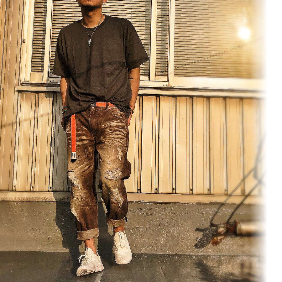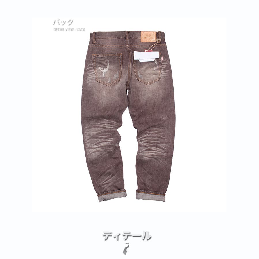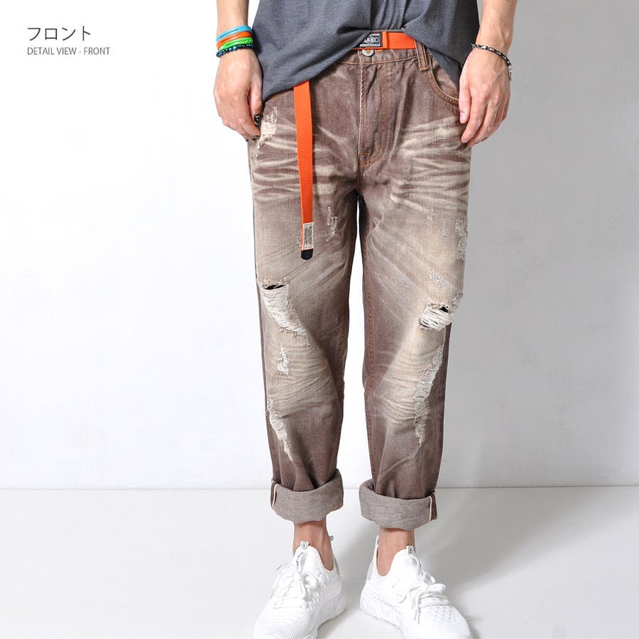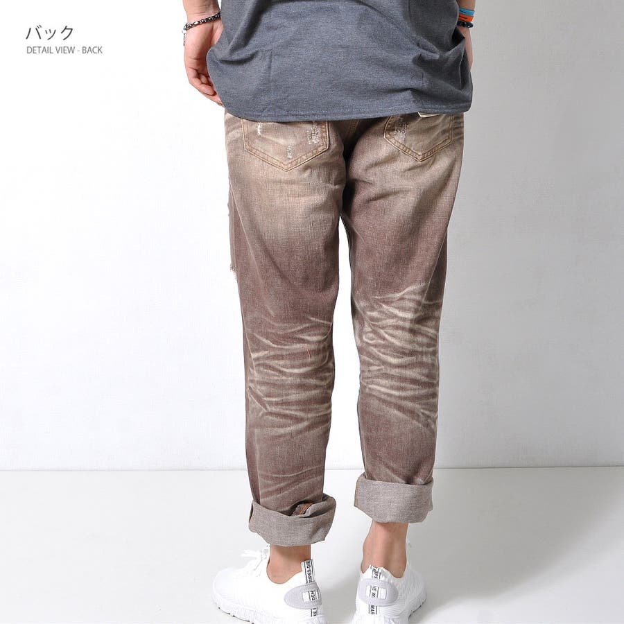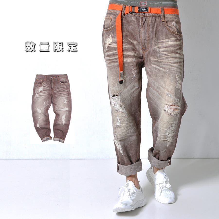 ブラウンのシルエットとクラッシュ・ダメージ加工が施されたデニムパンツ