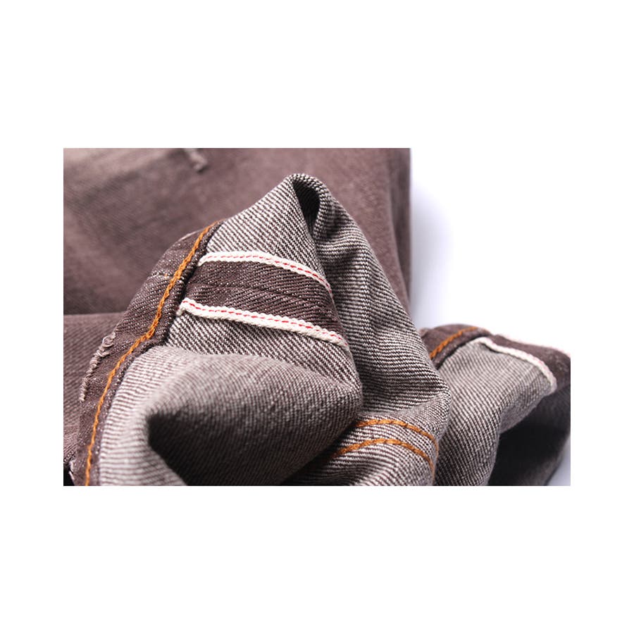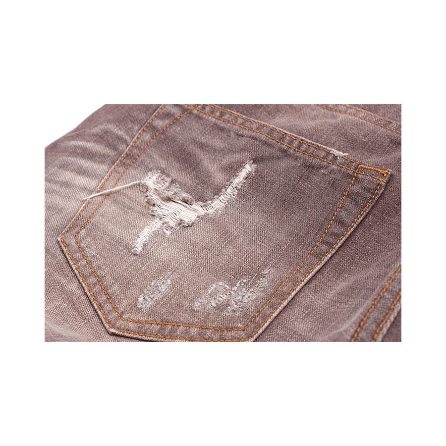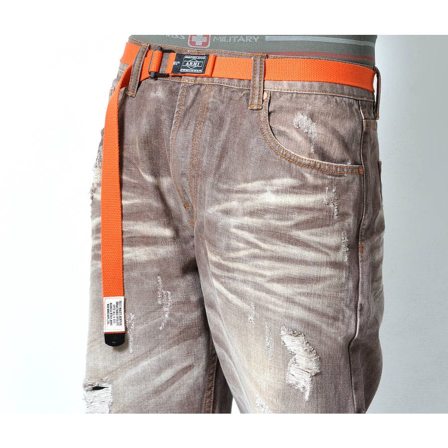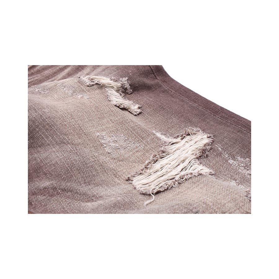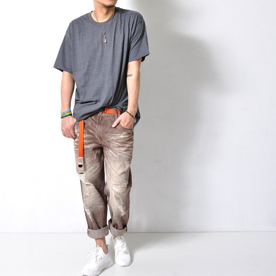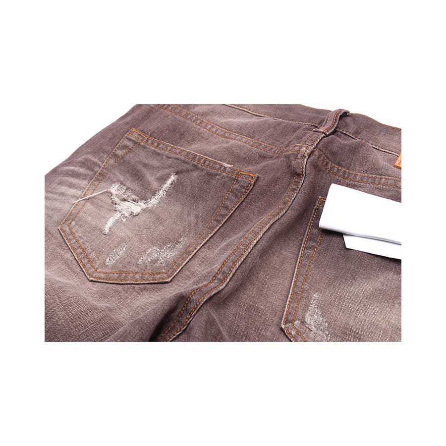 ブラウンのシルエットとクラッシュ・ダメージ加工が施されたデニムパンツ