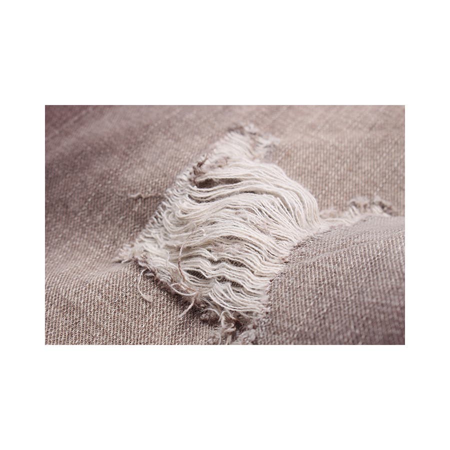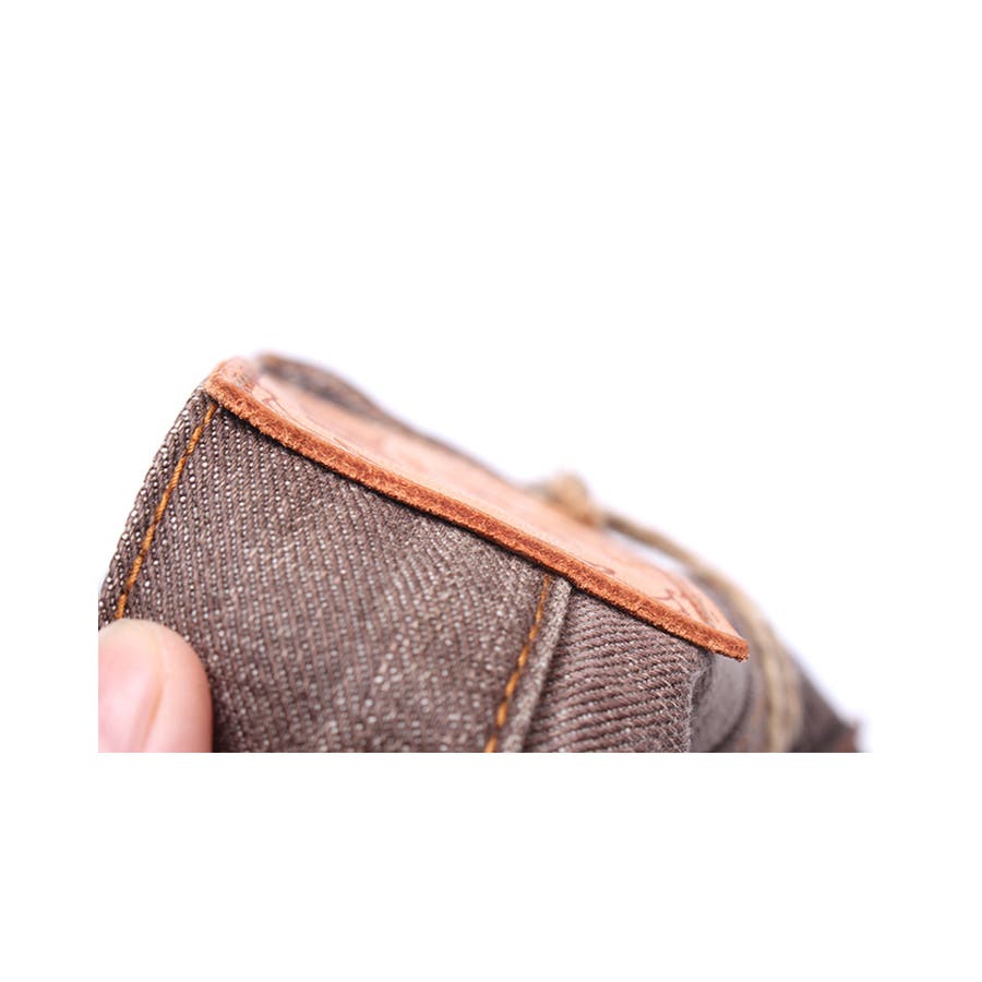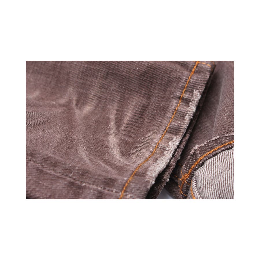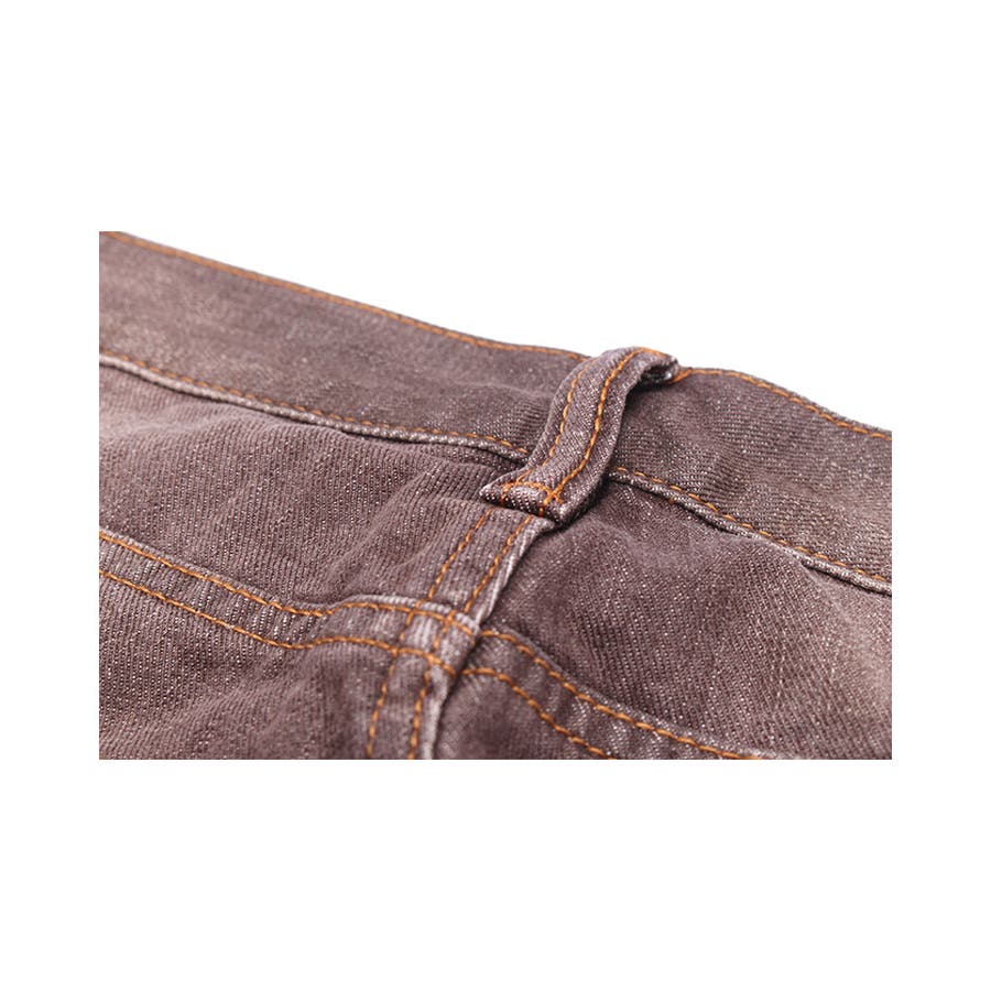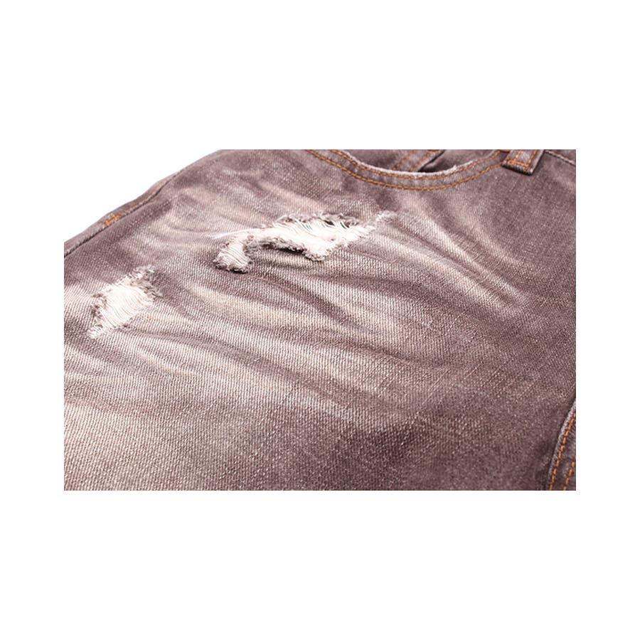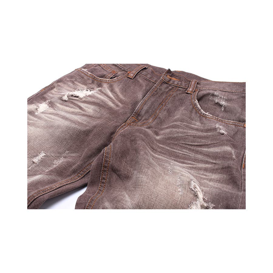 ブラウンのシルエットとクラッシュ・ダメージ加工が施されたデニムパンツ