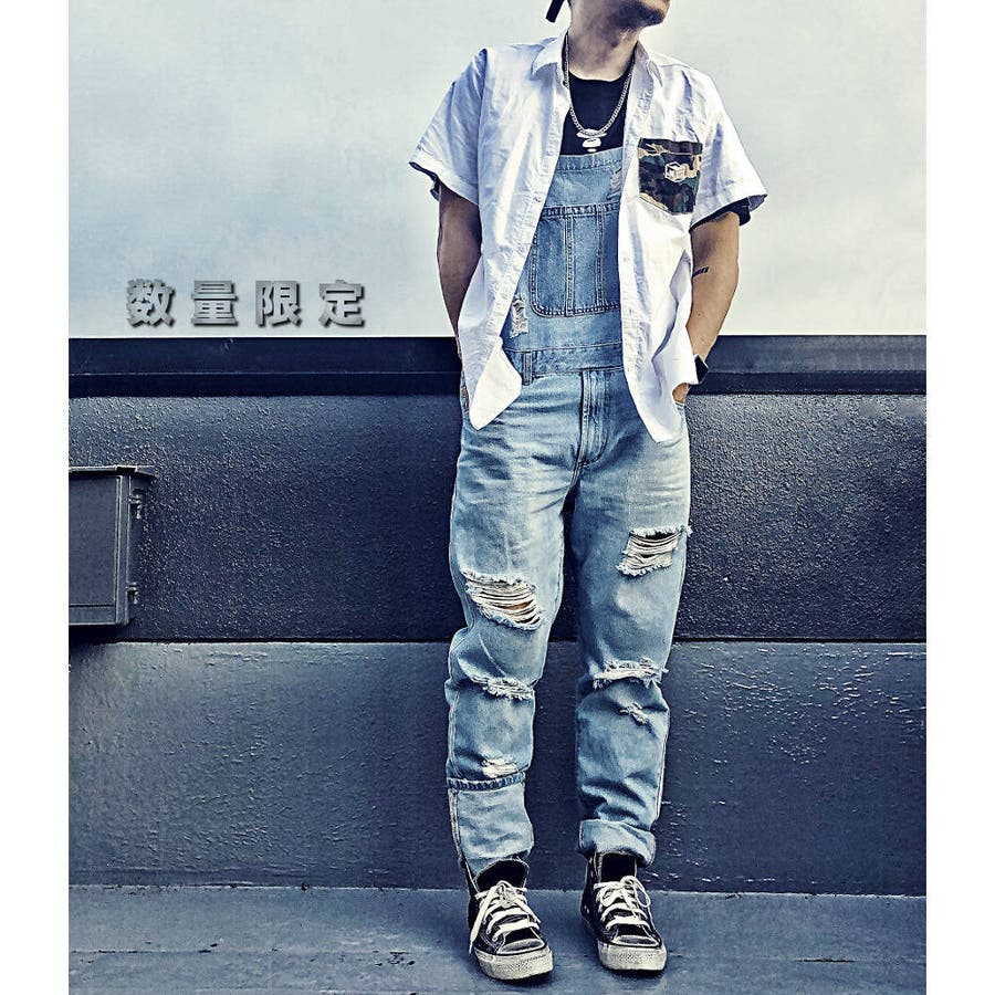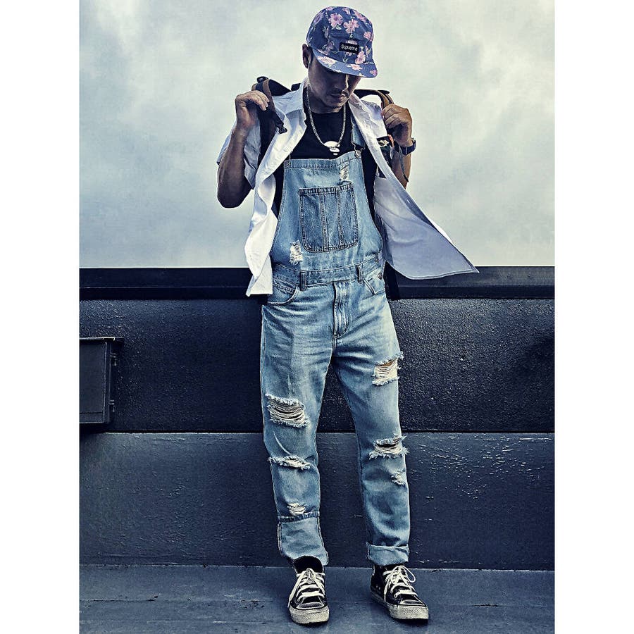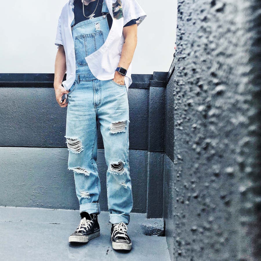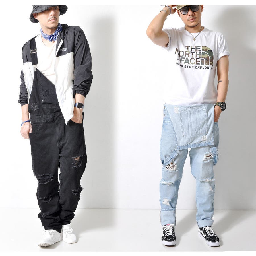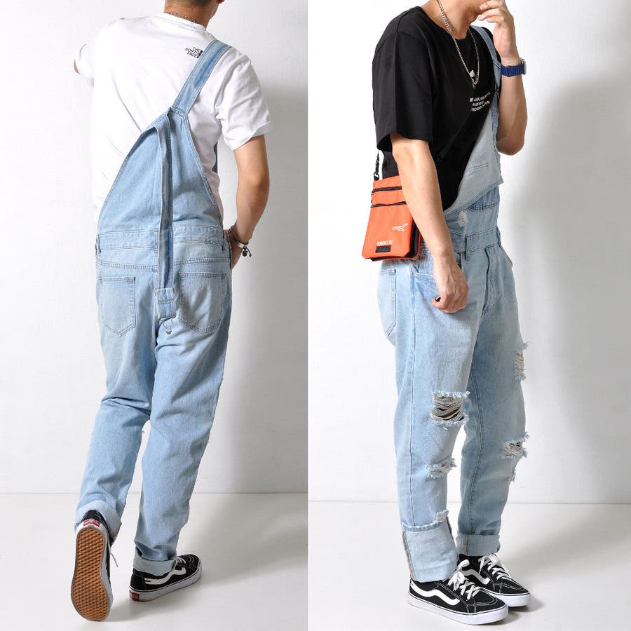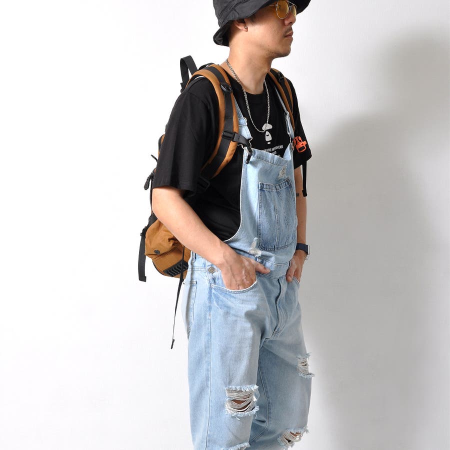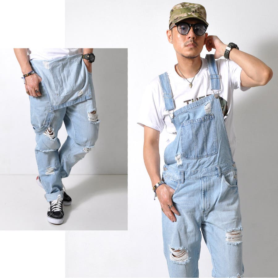 ダメージ加工がさりげなくクールな印象を放つデニムオーバーオール。