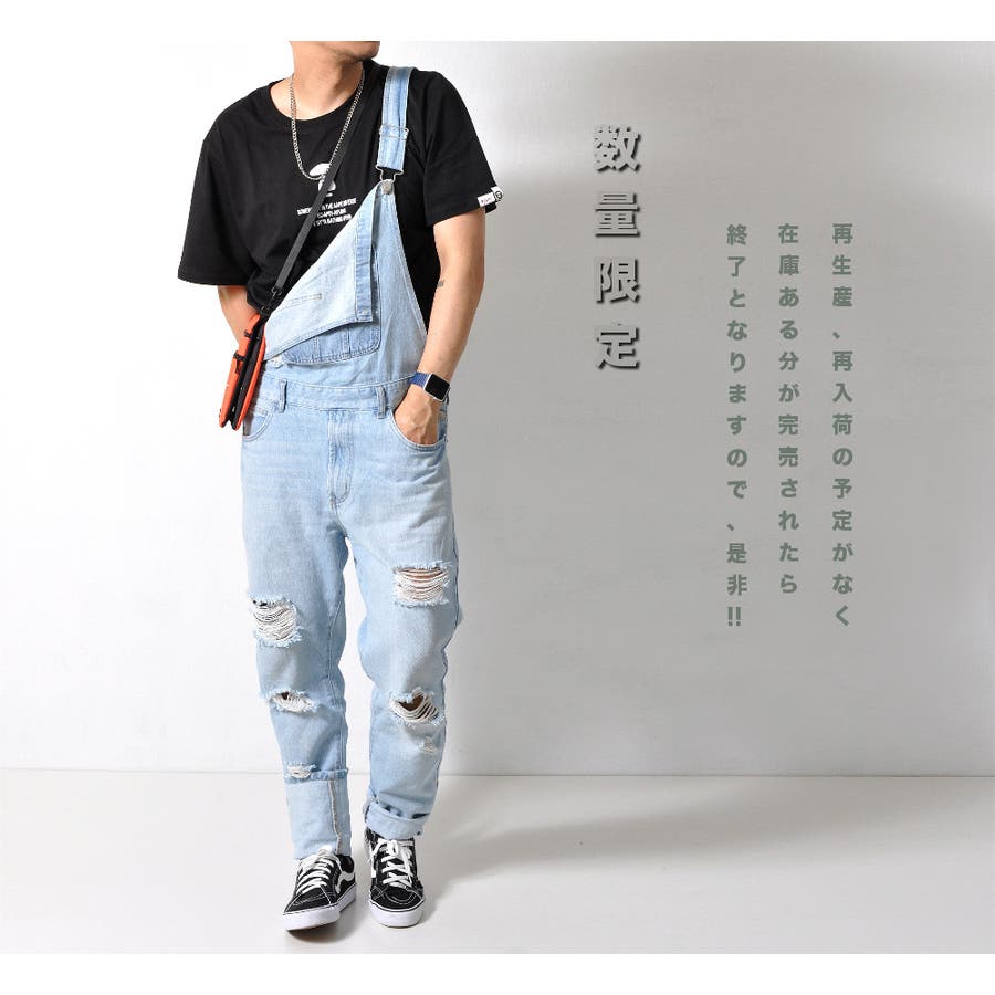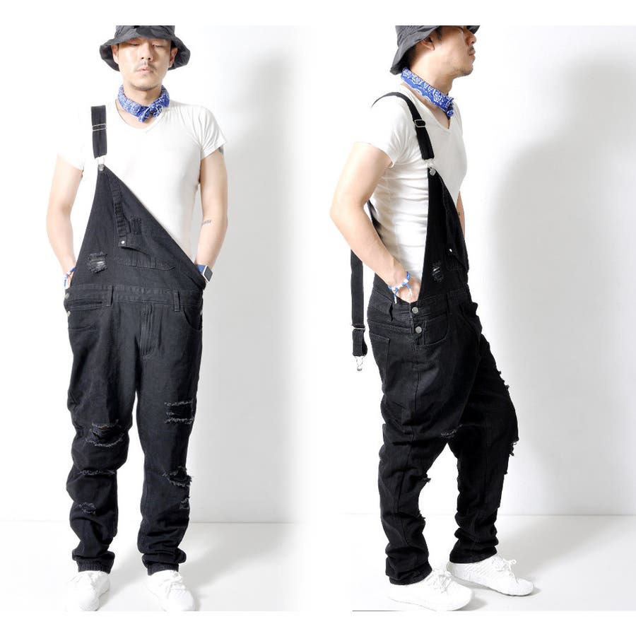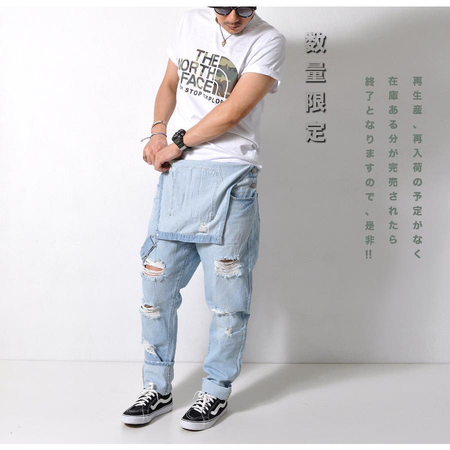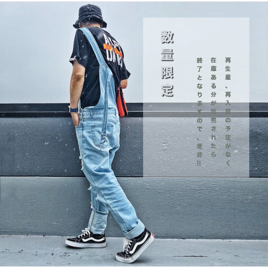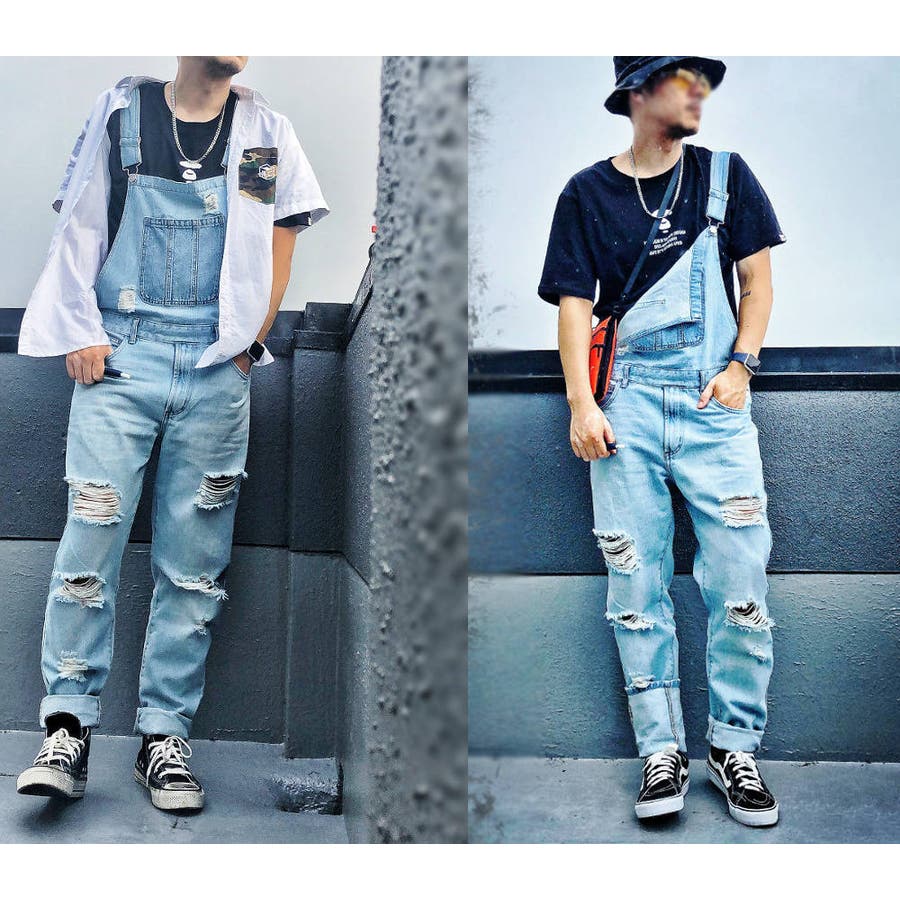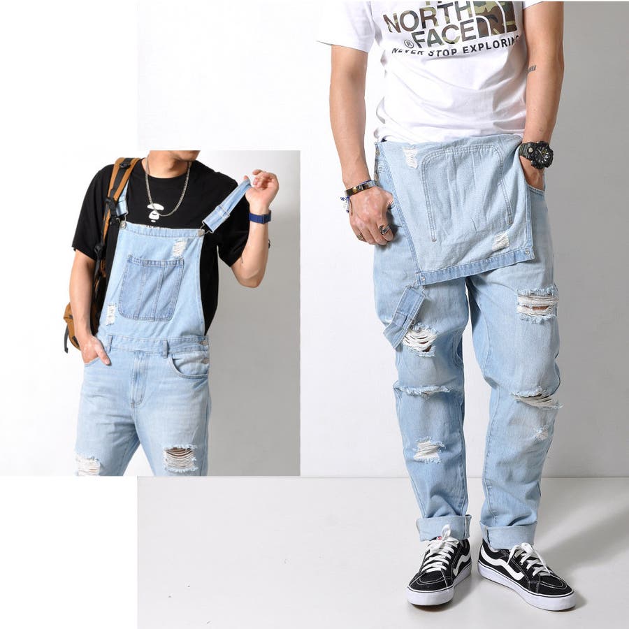 ダメージ加工がさりげなくクールな印象を放つデニムオーバーオール。