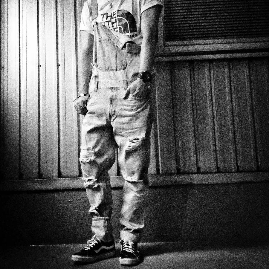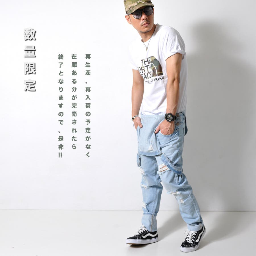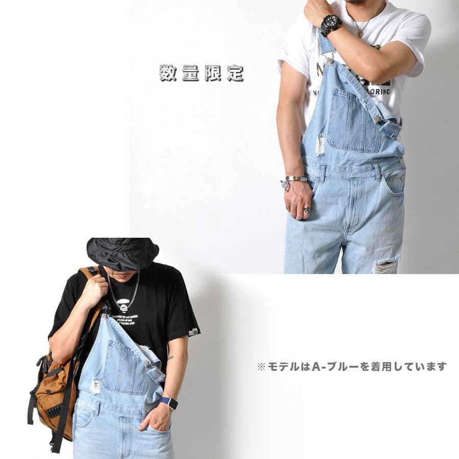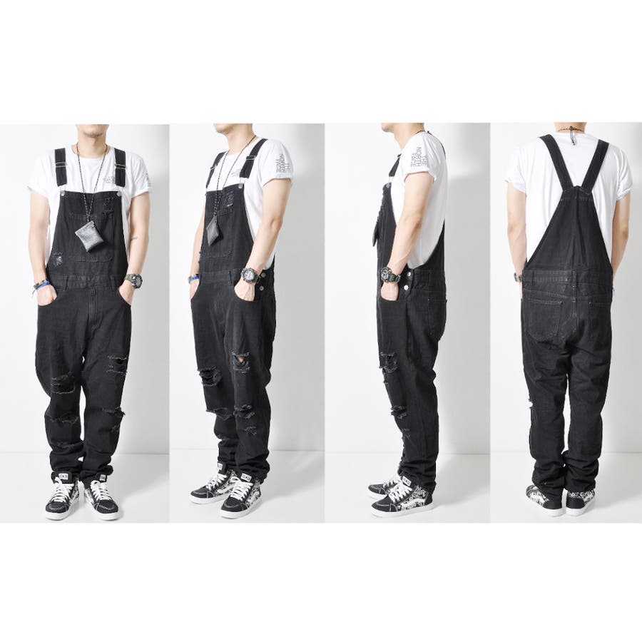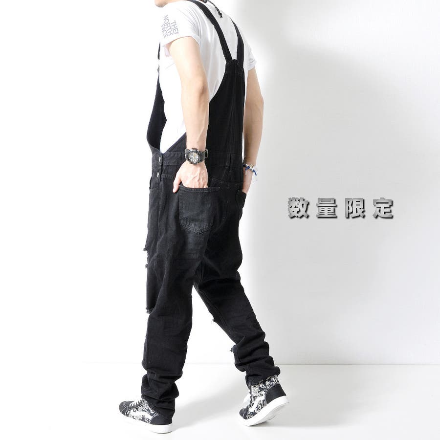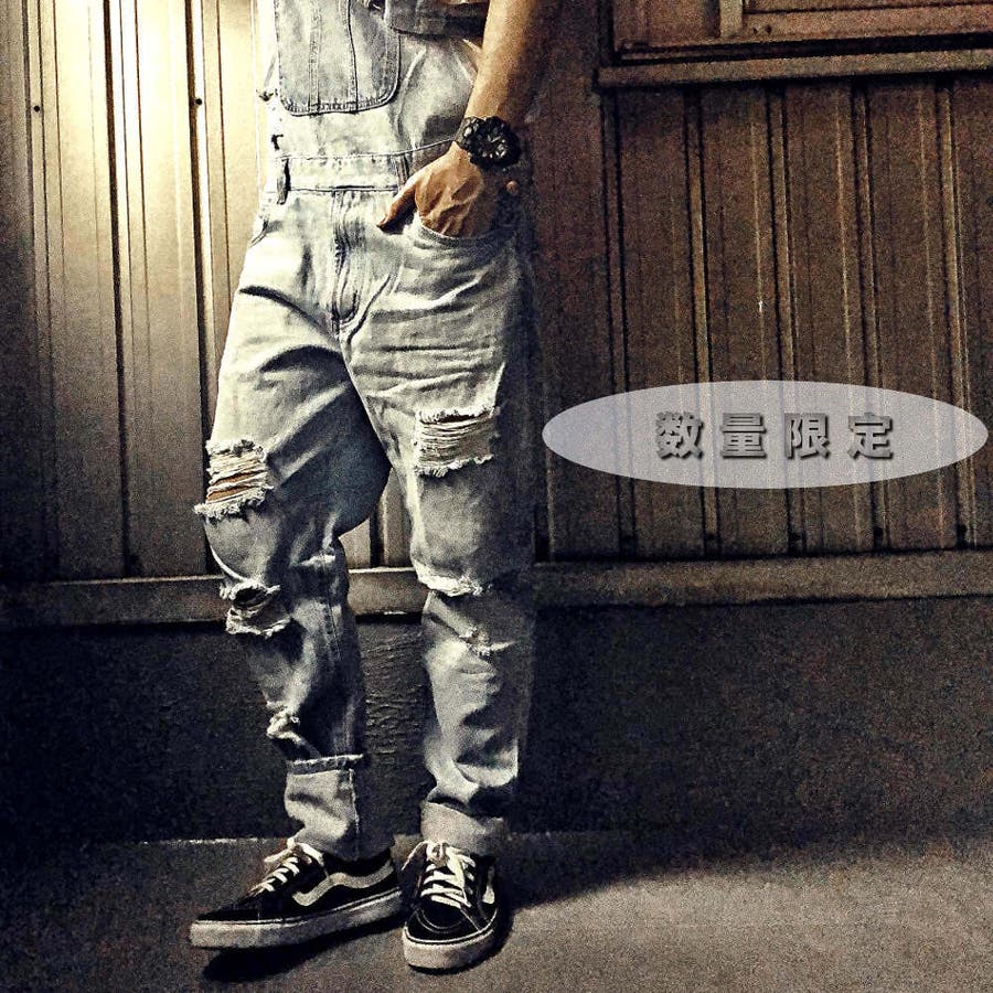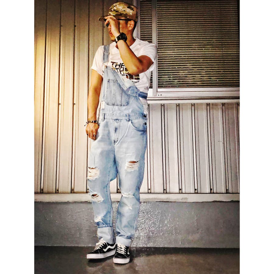 ダメージ加工がさりげなくクールな印象を放つデニムオーバーオール。