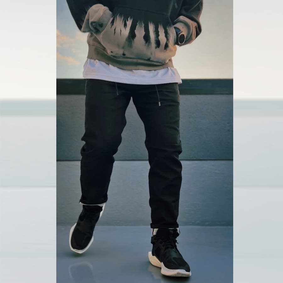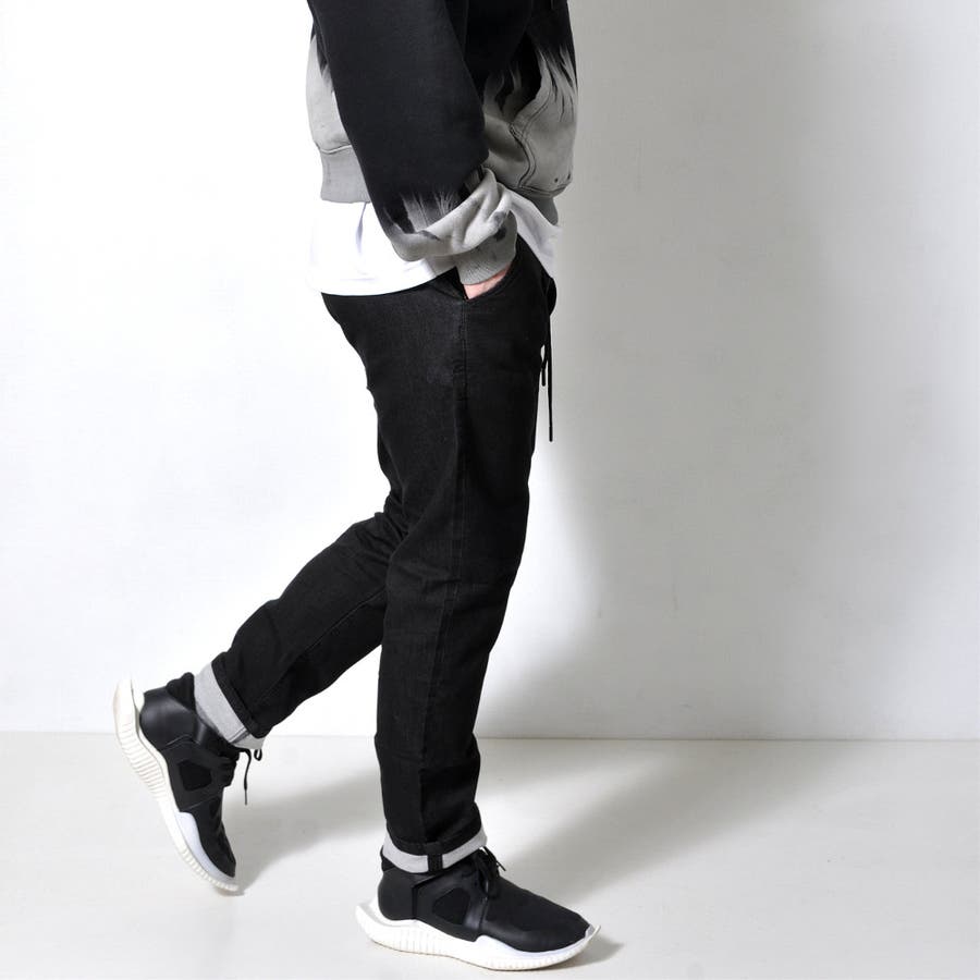 カットデニム素材のスリムシルエットのテーパードパンツ