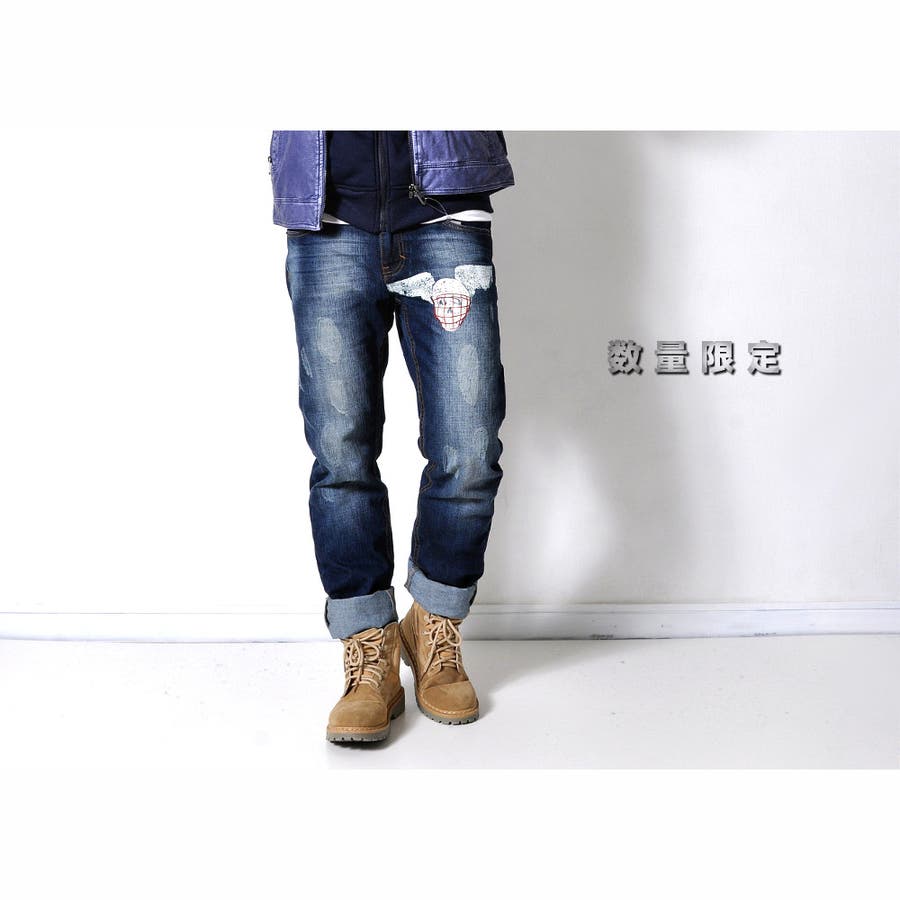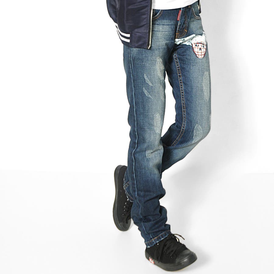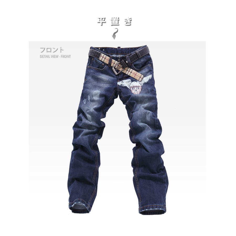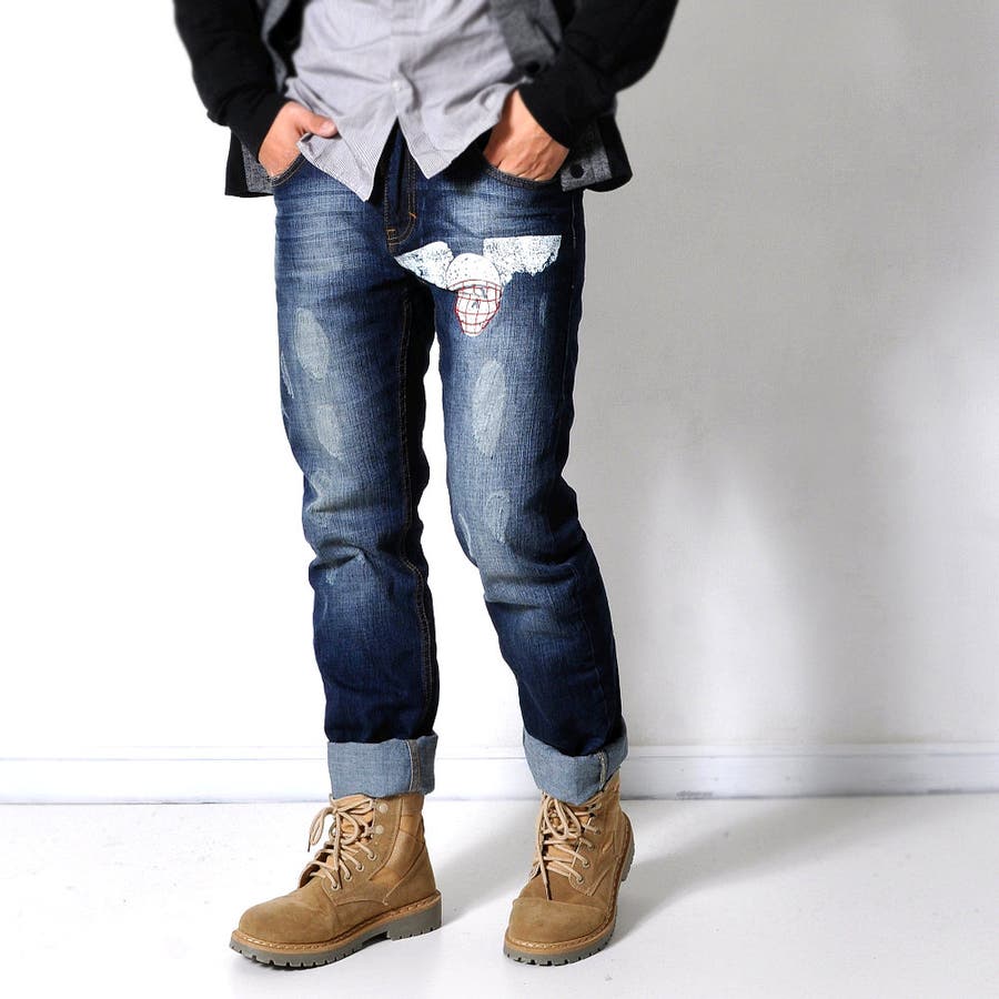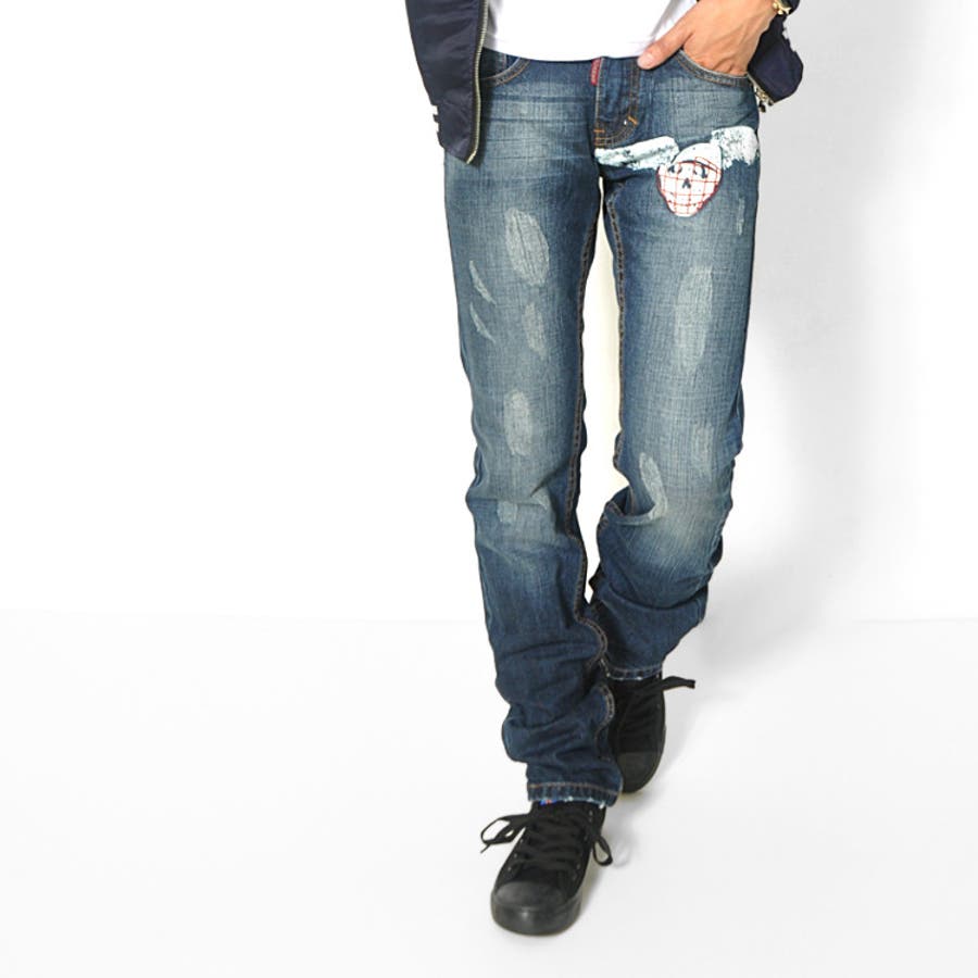 ストレートデニム ウォッシュ加工 スカルデザイン ジーンズ#Jeapk75