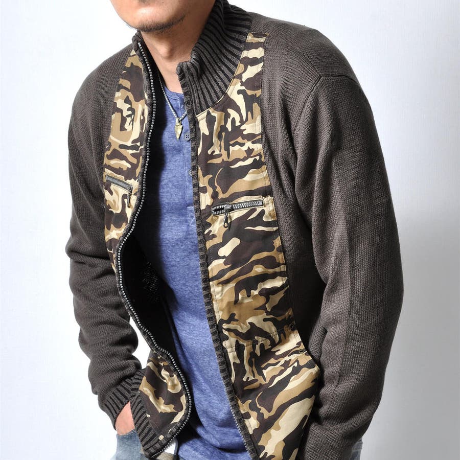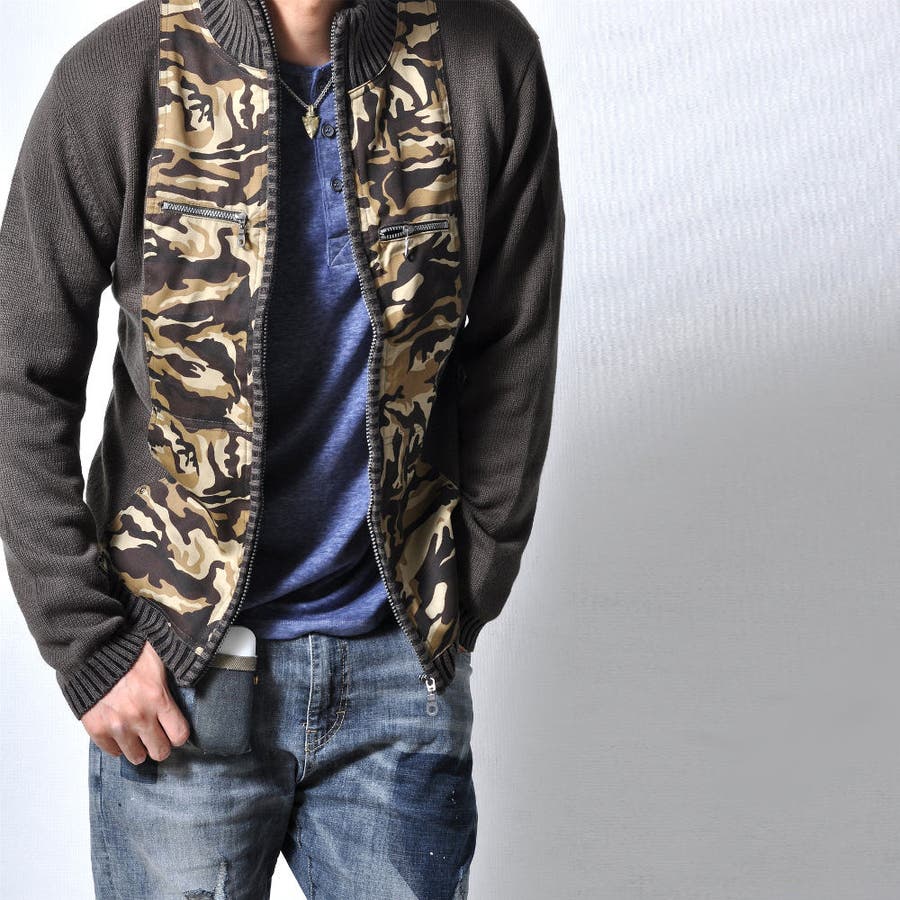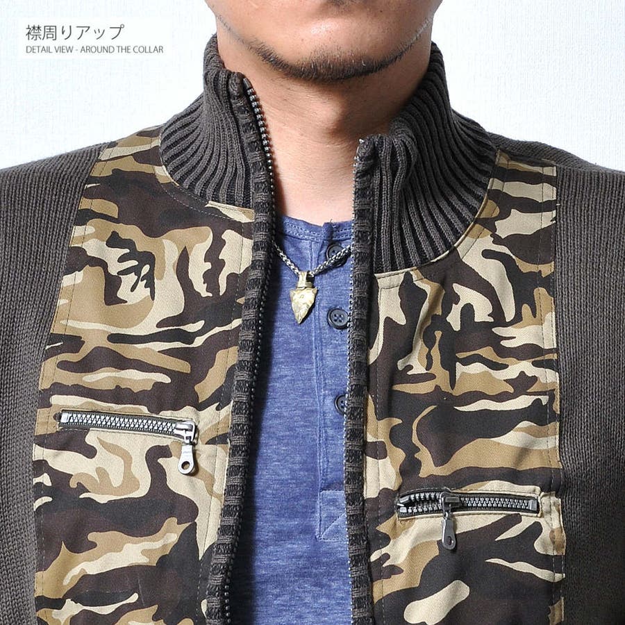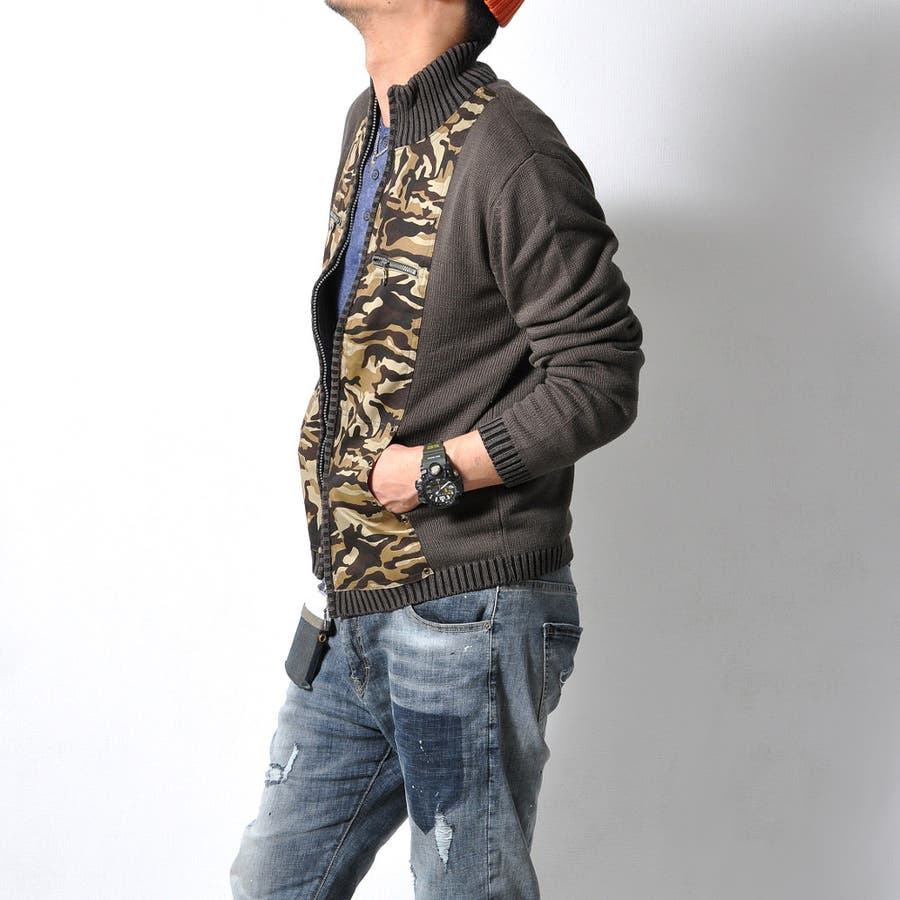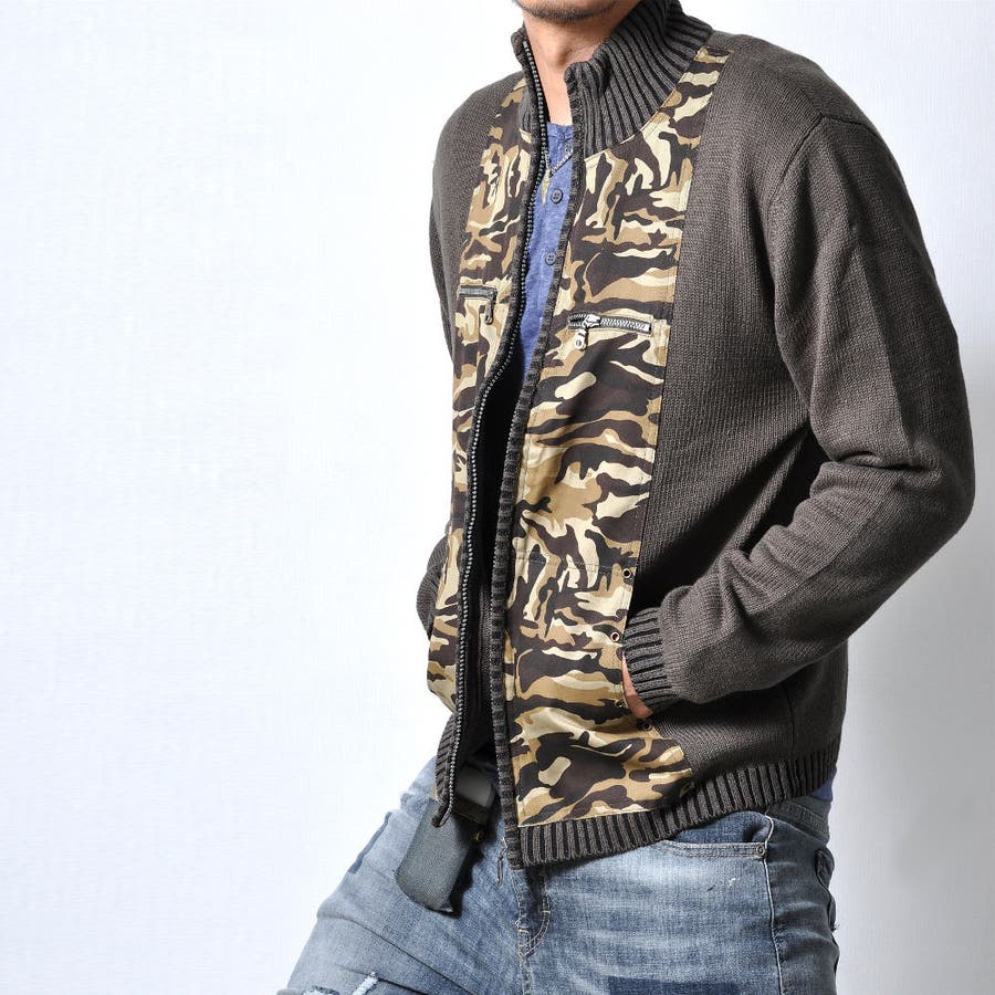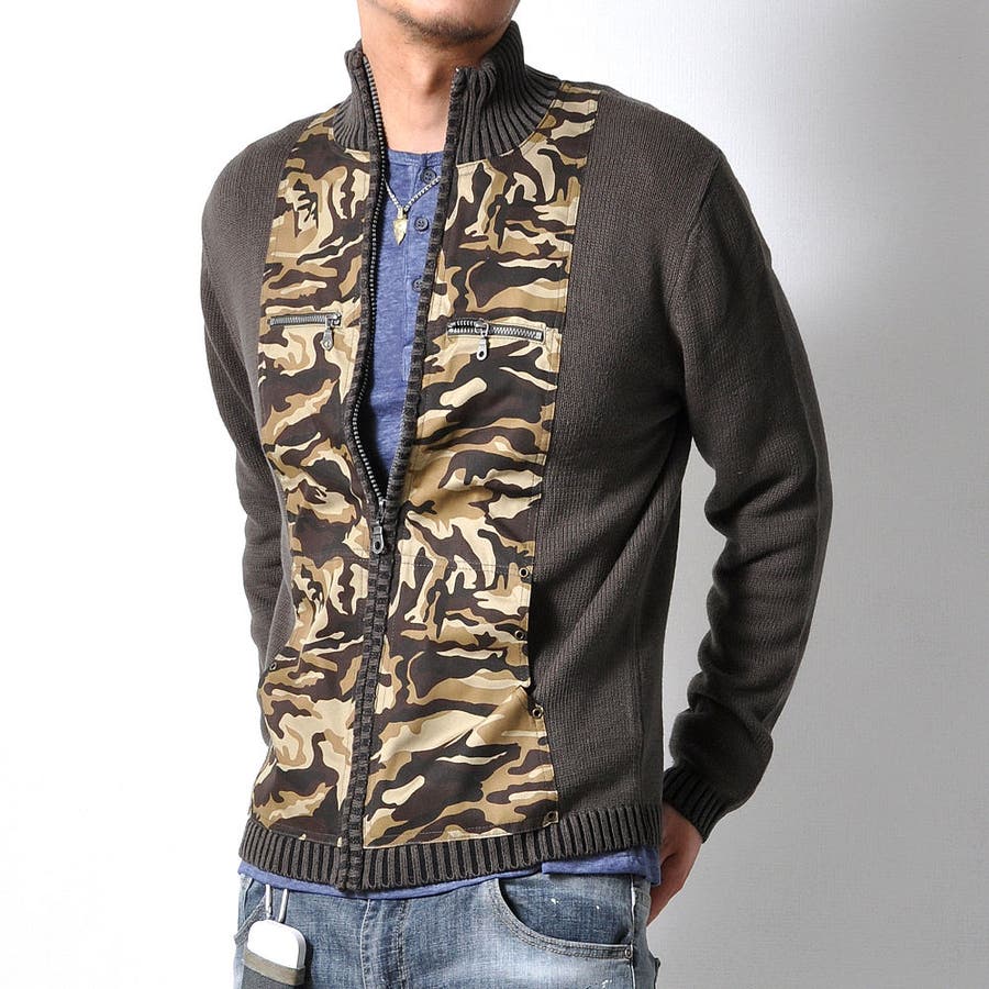 フロント部分がカモフラ柄のパネル切り替えデザインのジップアップ・ニット