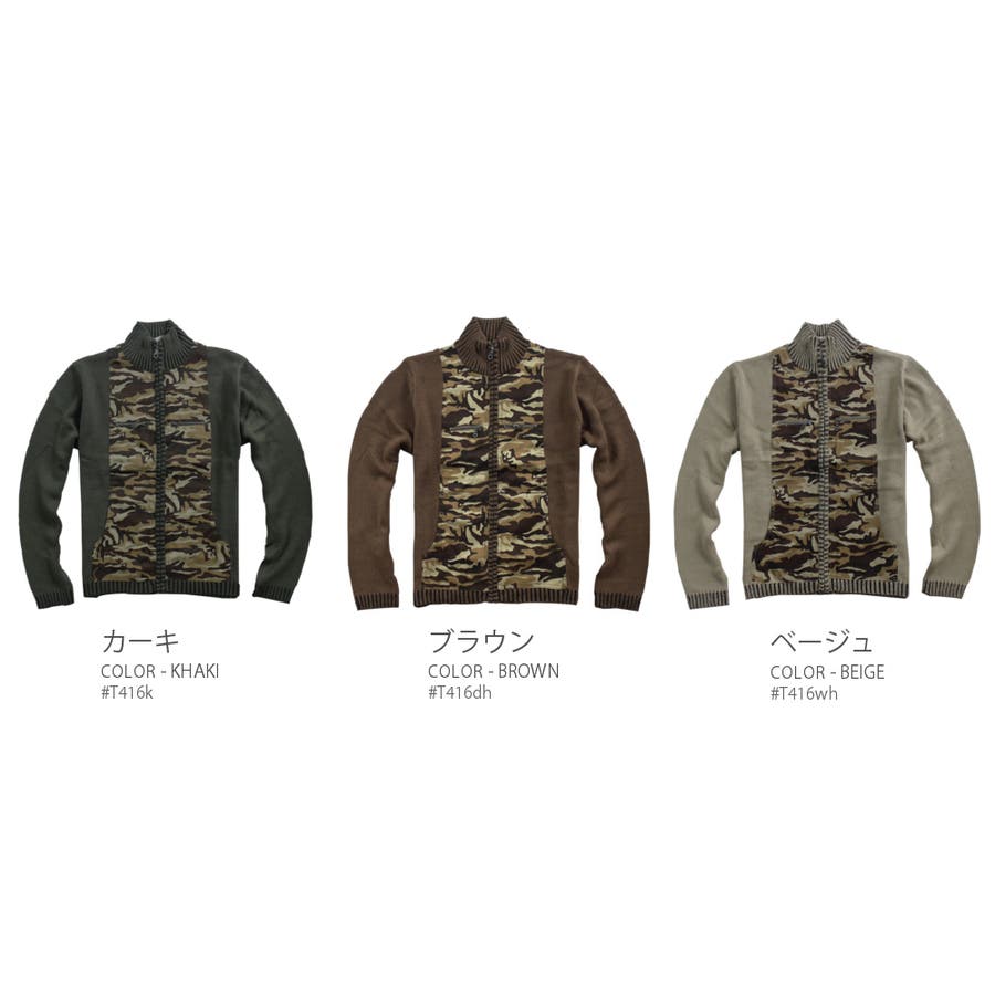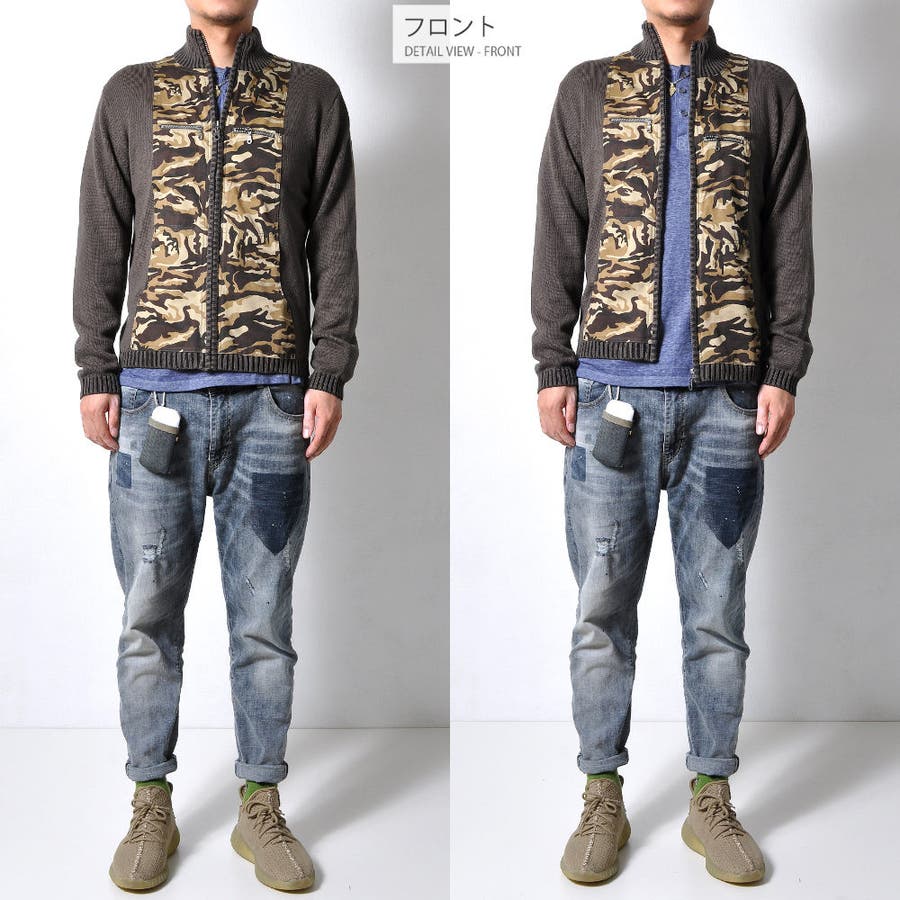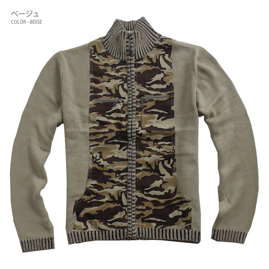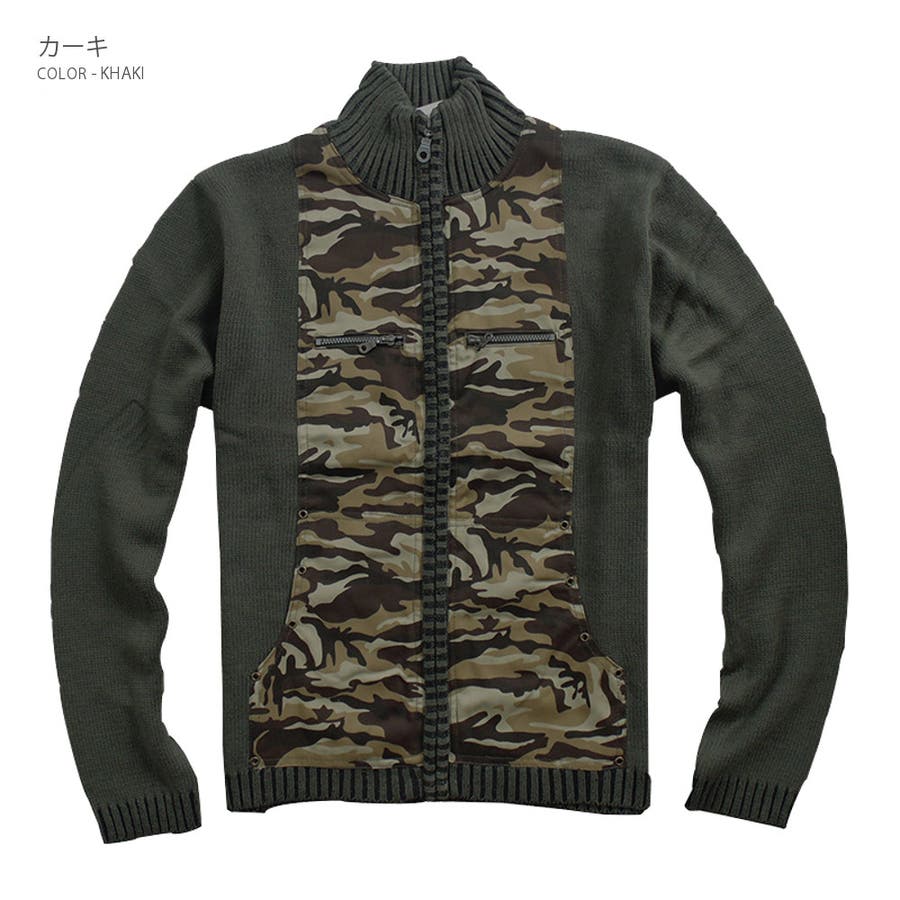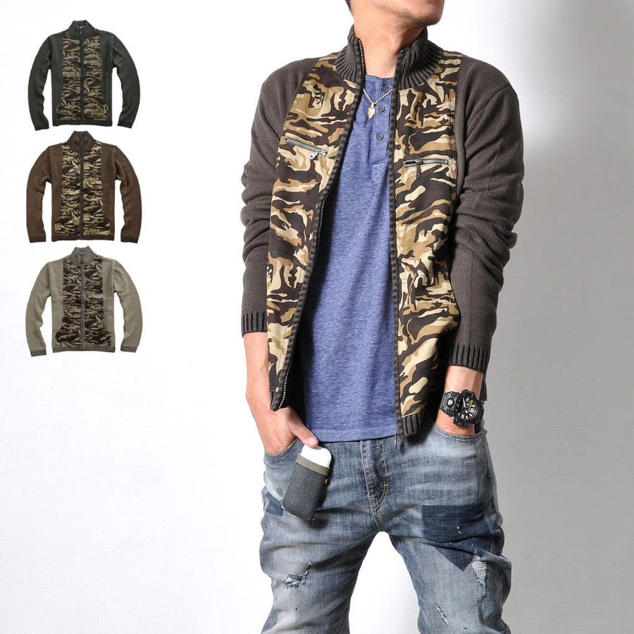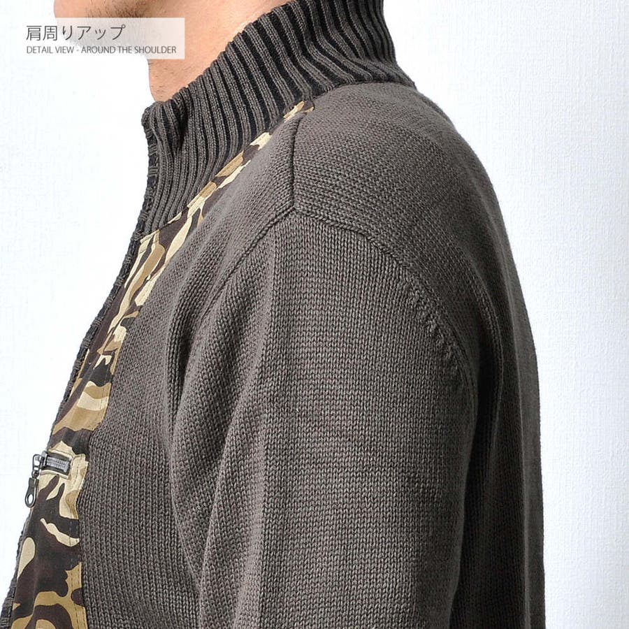 フロント部分がカモフラ柄のパネル切り替えデザインのジップアップ・ニット