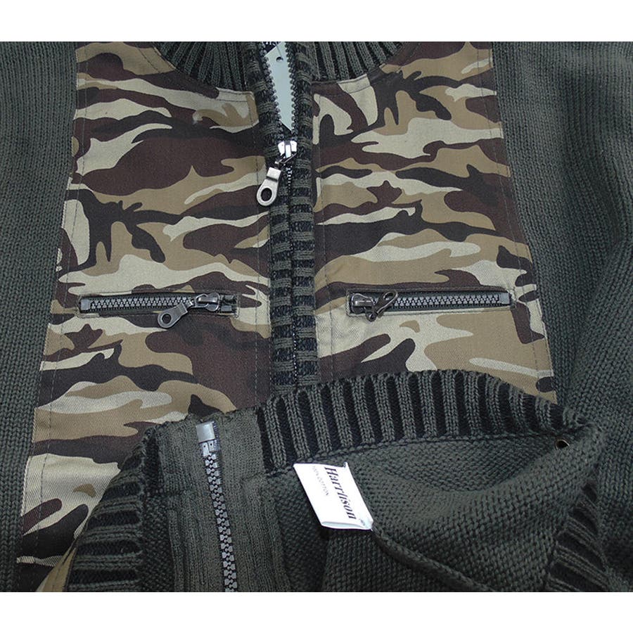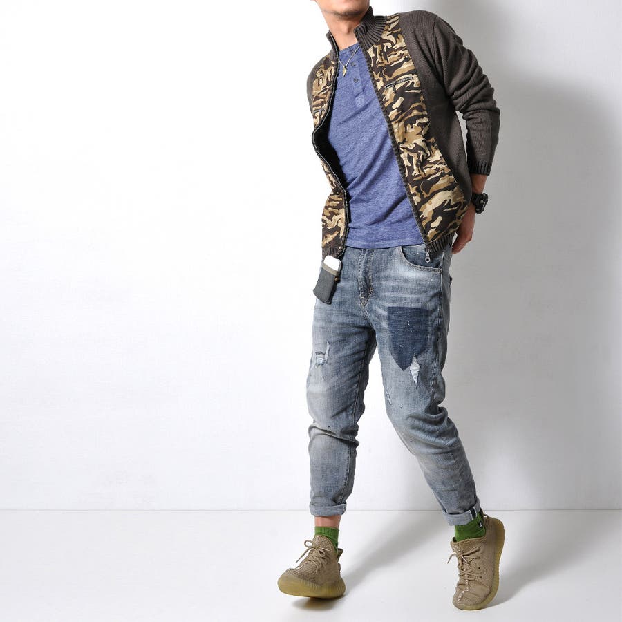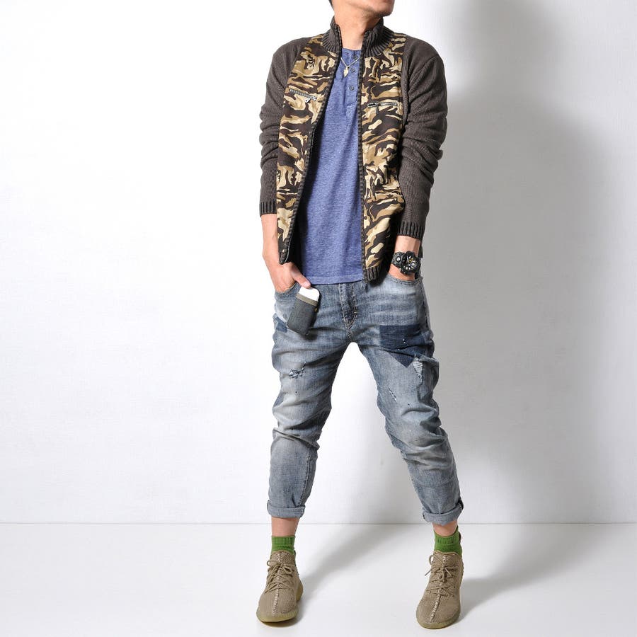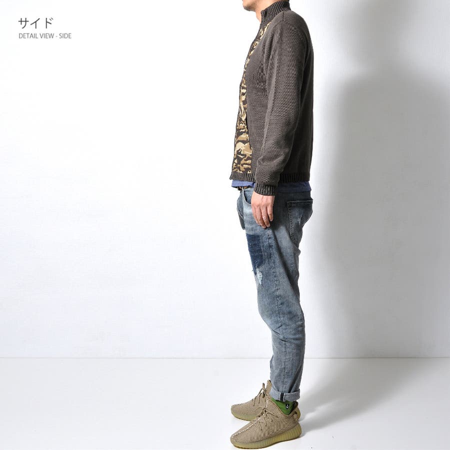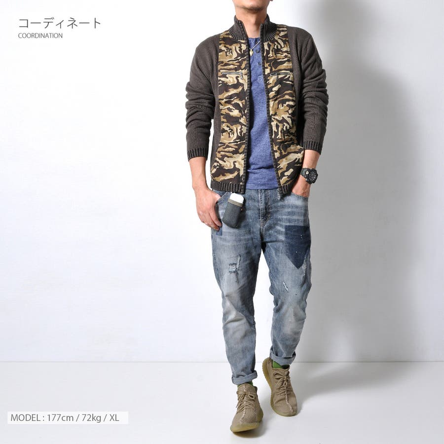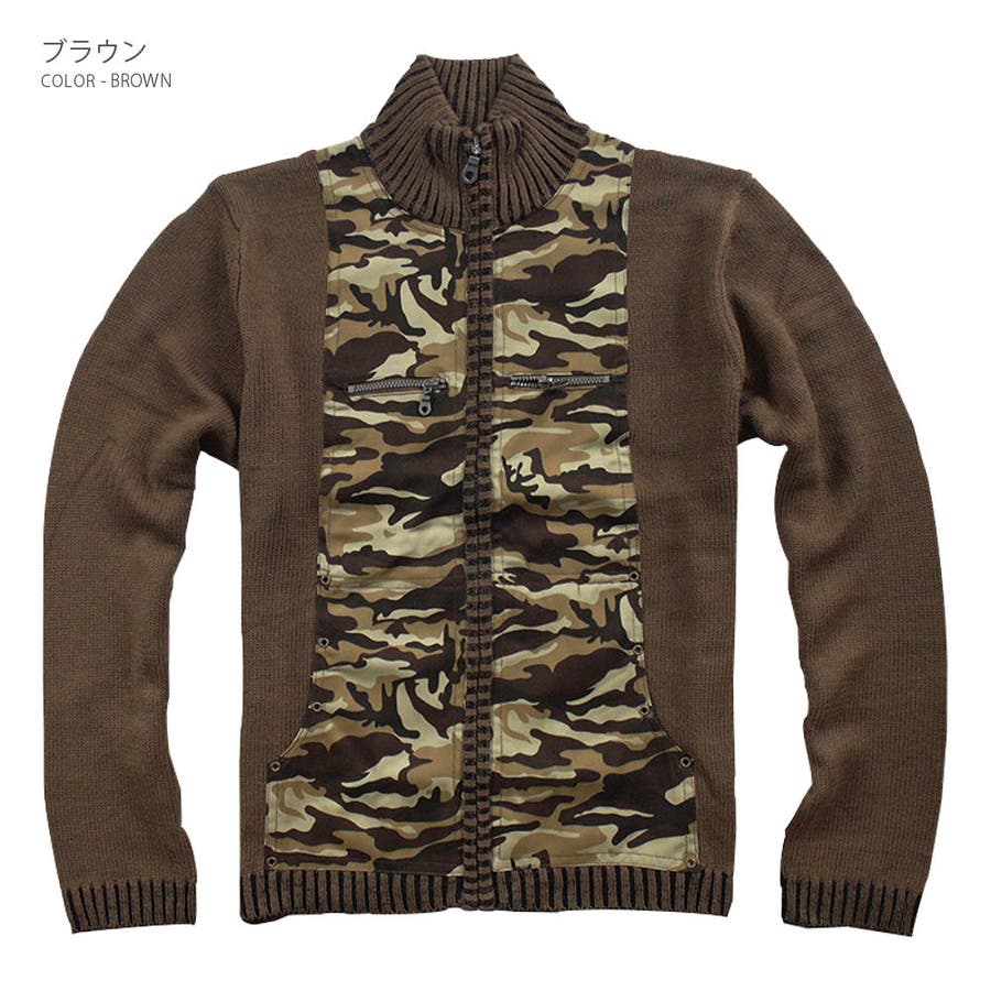 フロント部分がカモフラ柄のパネル切り替えデザインのジップアップ・ニット