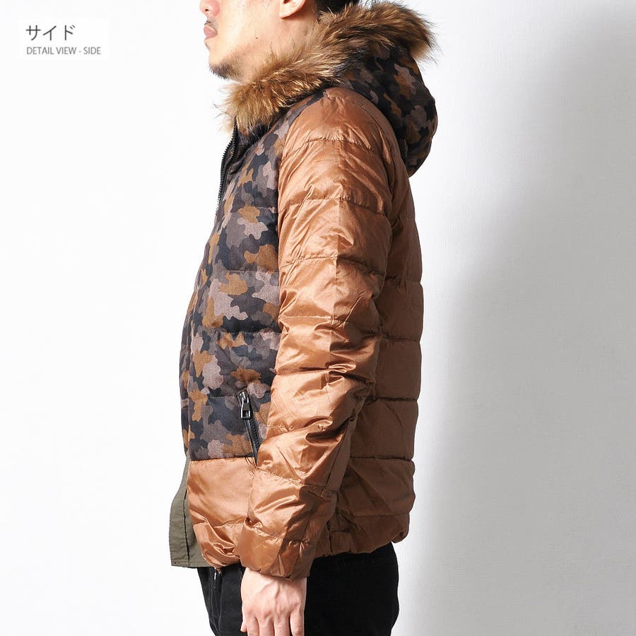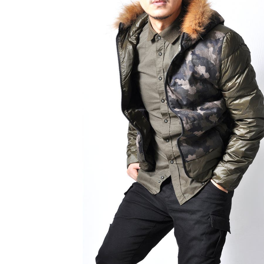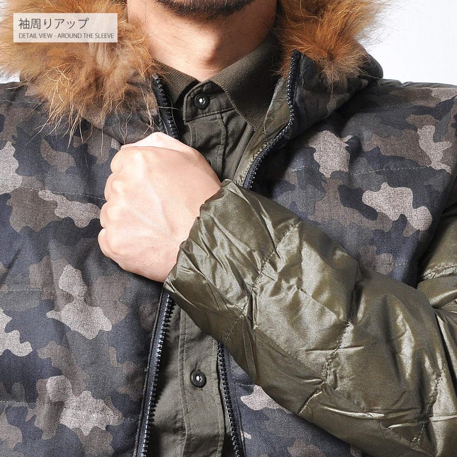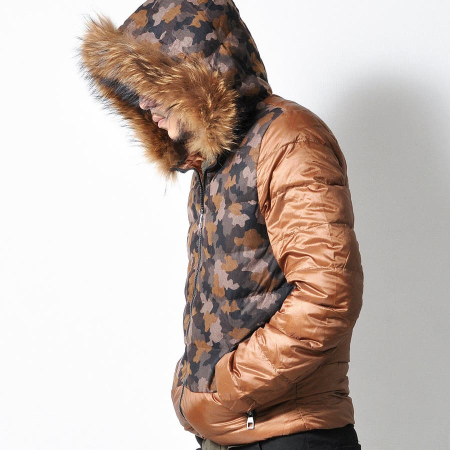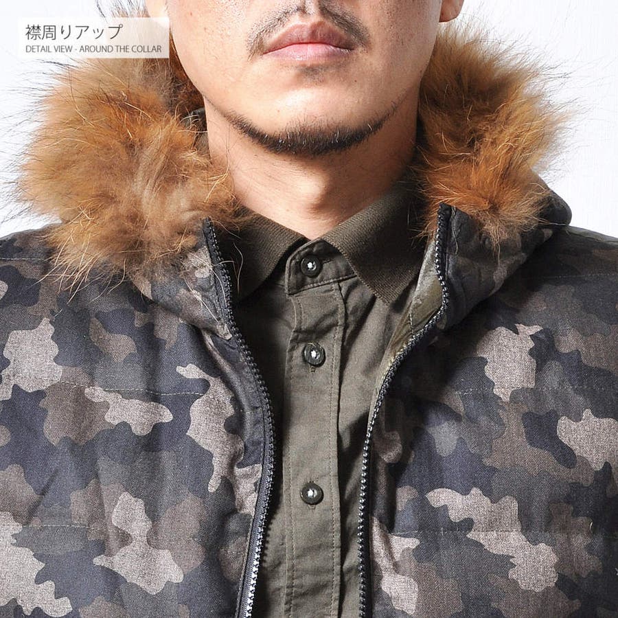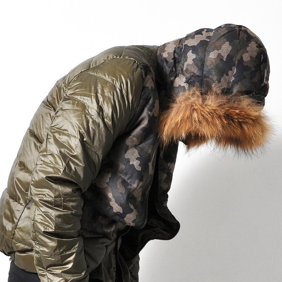フード付リアルファー 迷彩ダウンジャケット メンズ