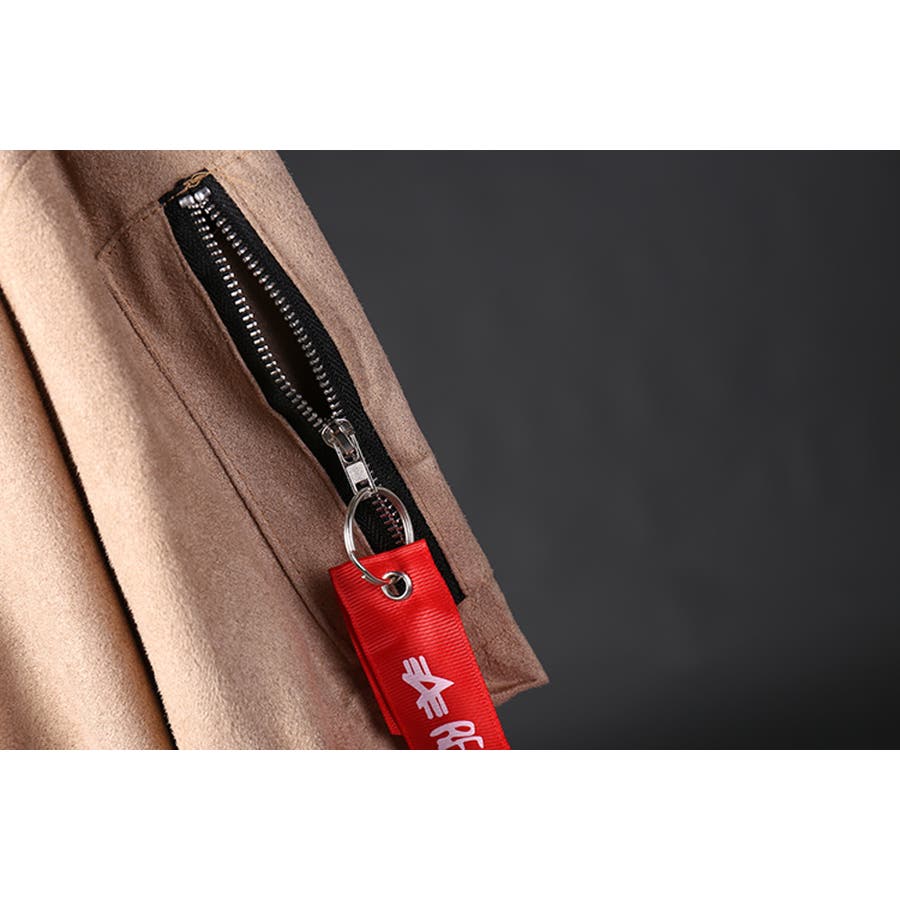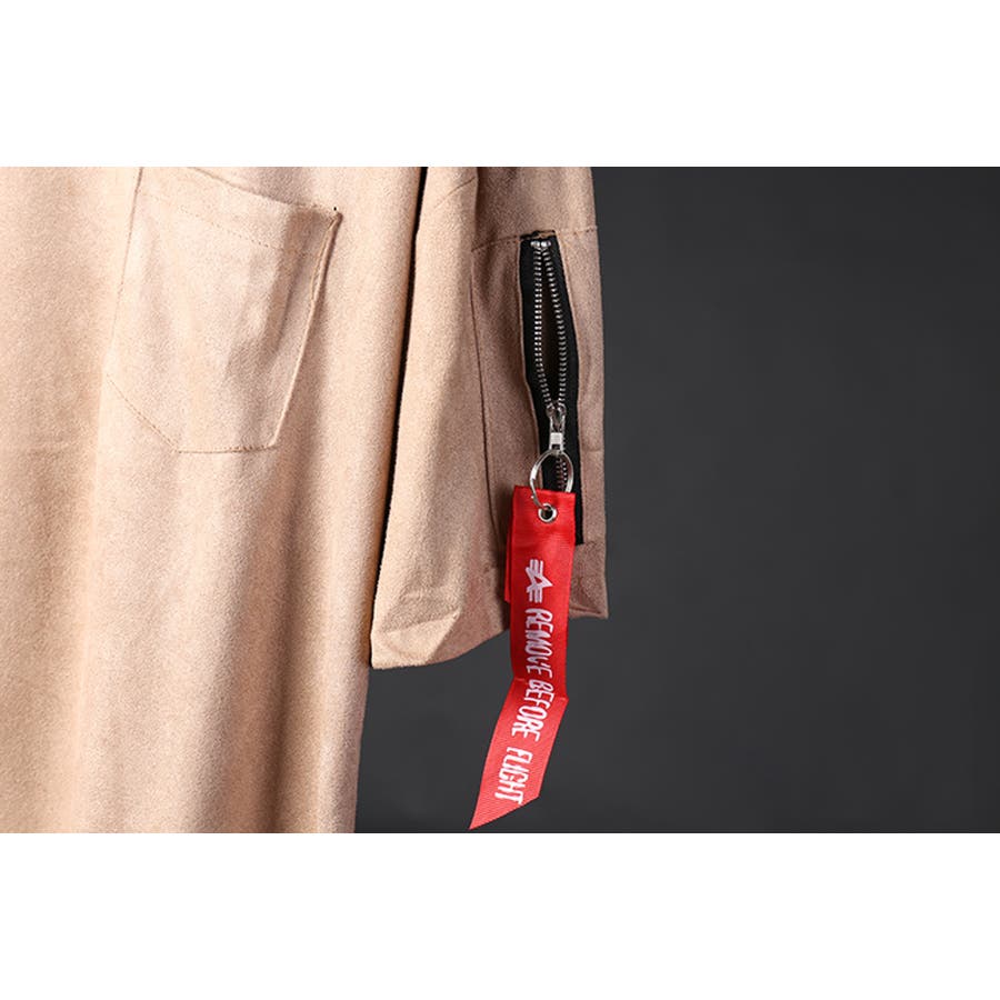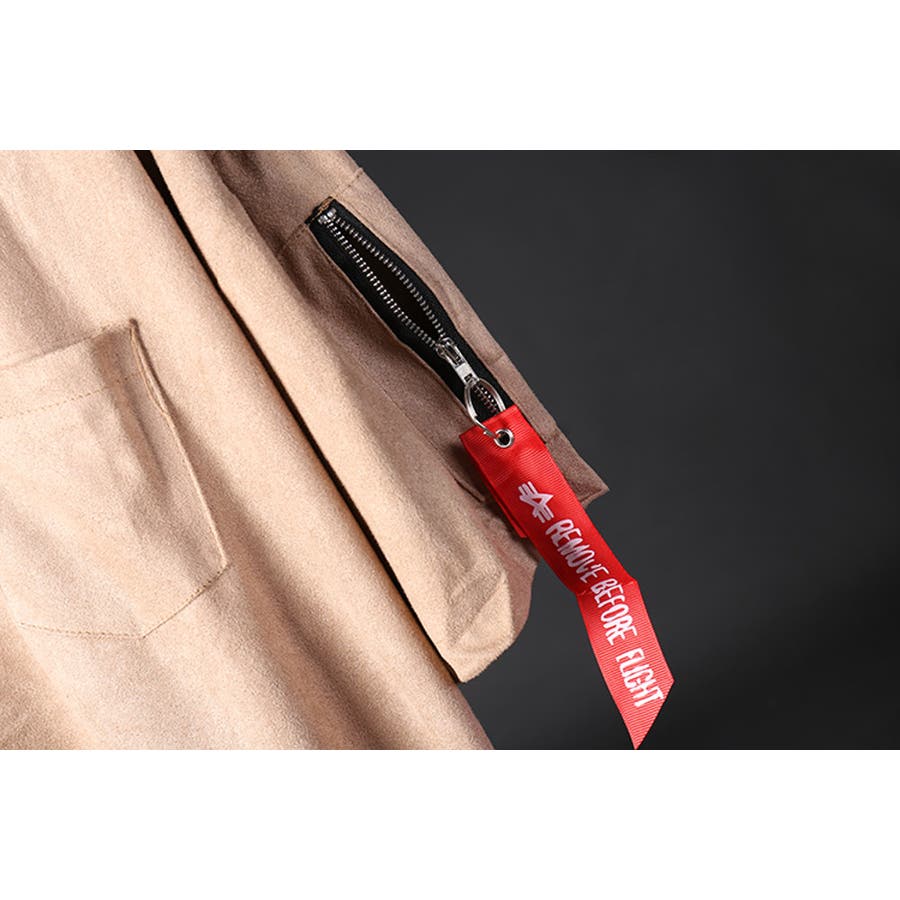 左袖にMA-1タイプのファスナーポケットが配置され、赤いストラップが