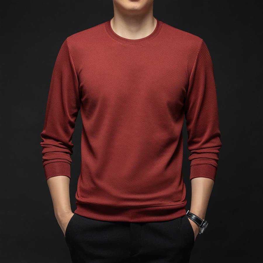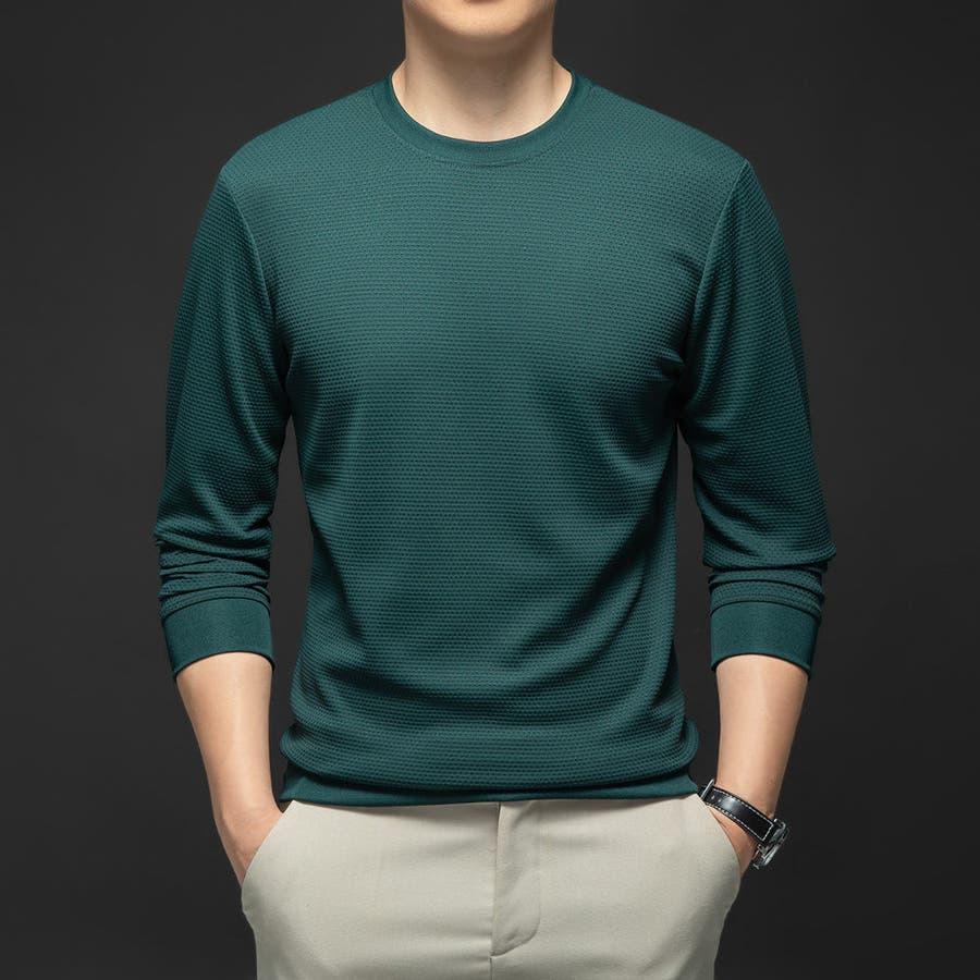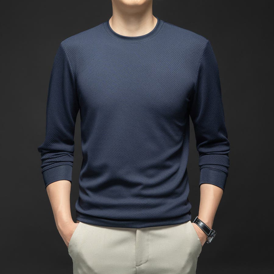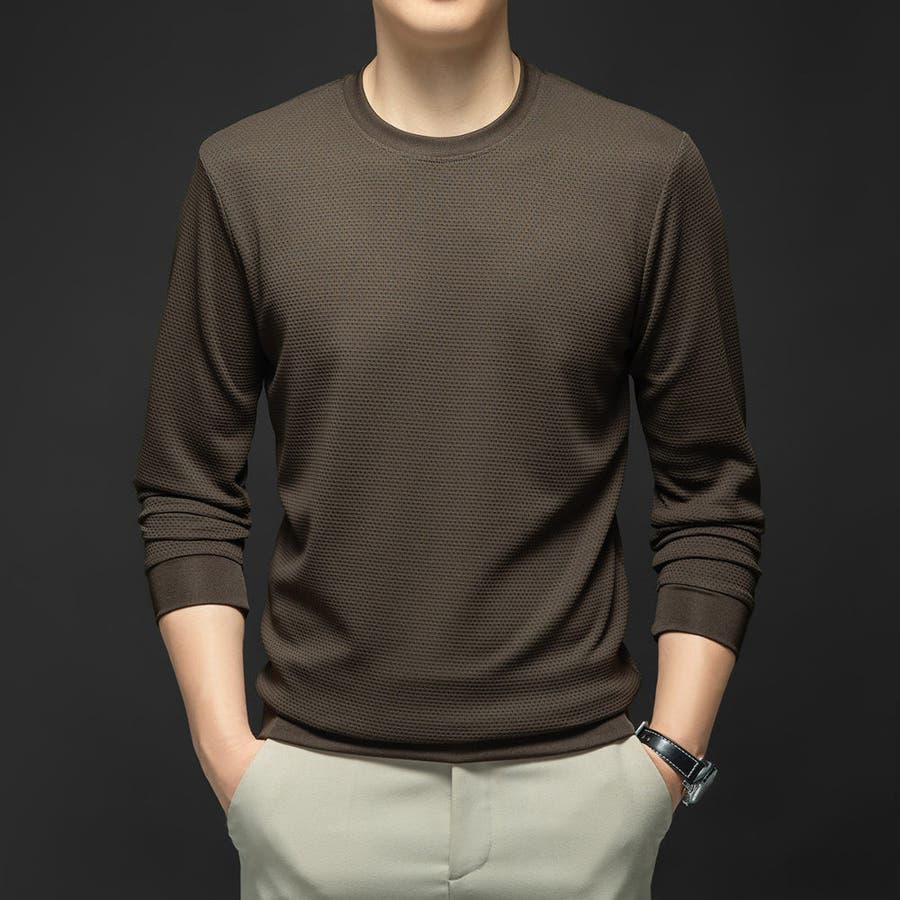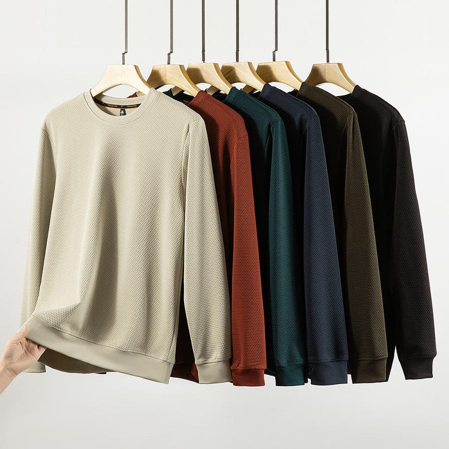 襟や袖、裾にあしらわれたリブが品のある印象に。