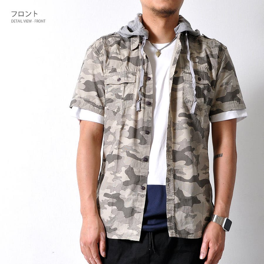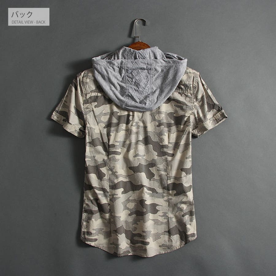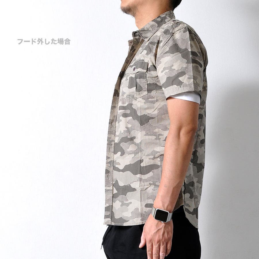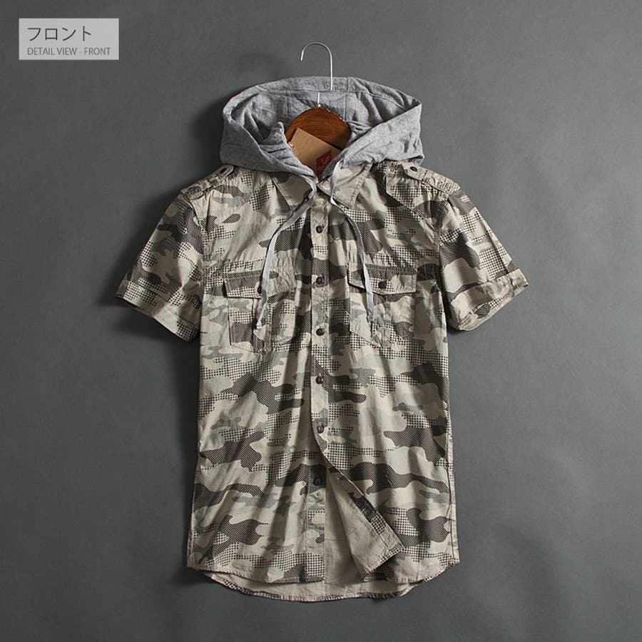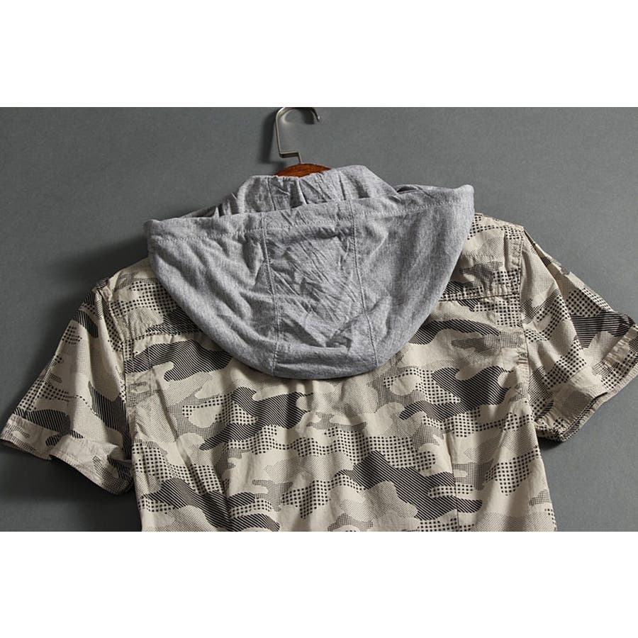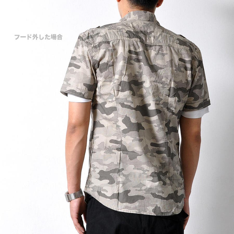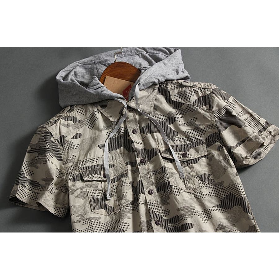 脱着可能なフードが付いた、カモフラ柄の半袖ミリタリーシャツ