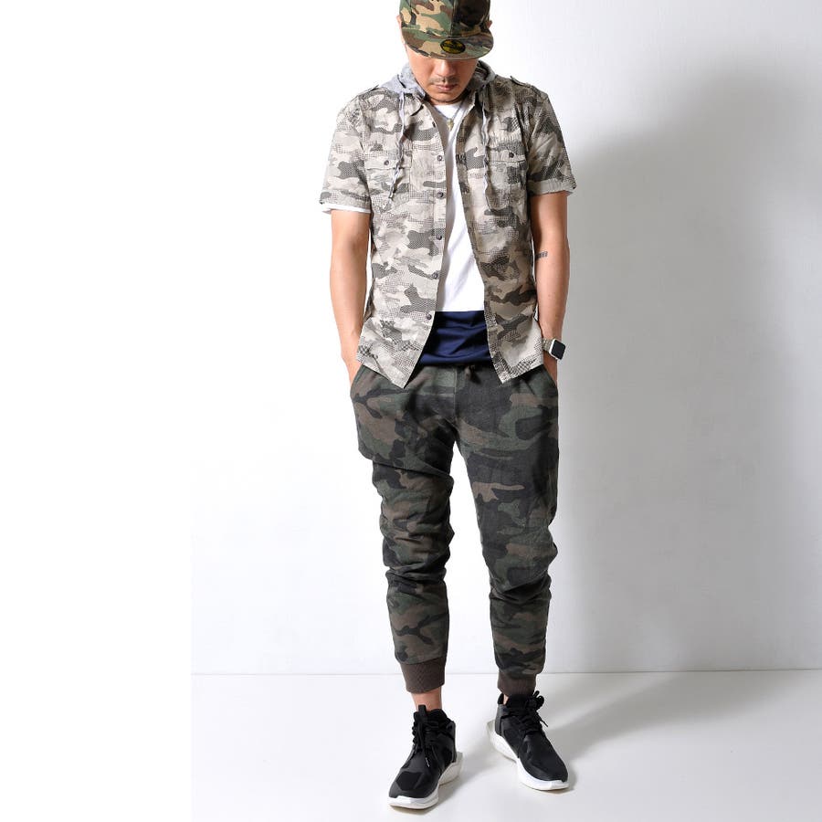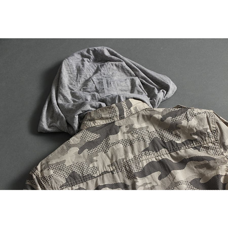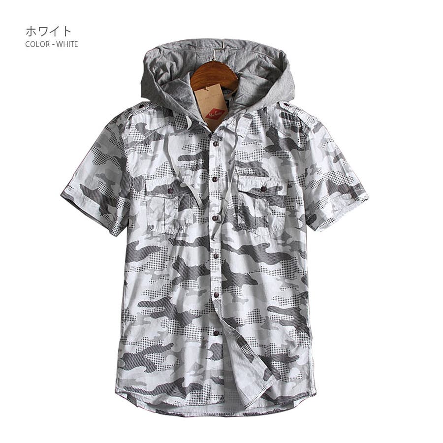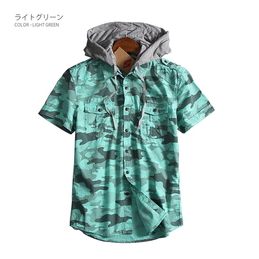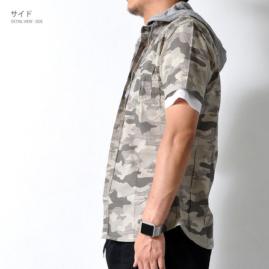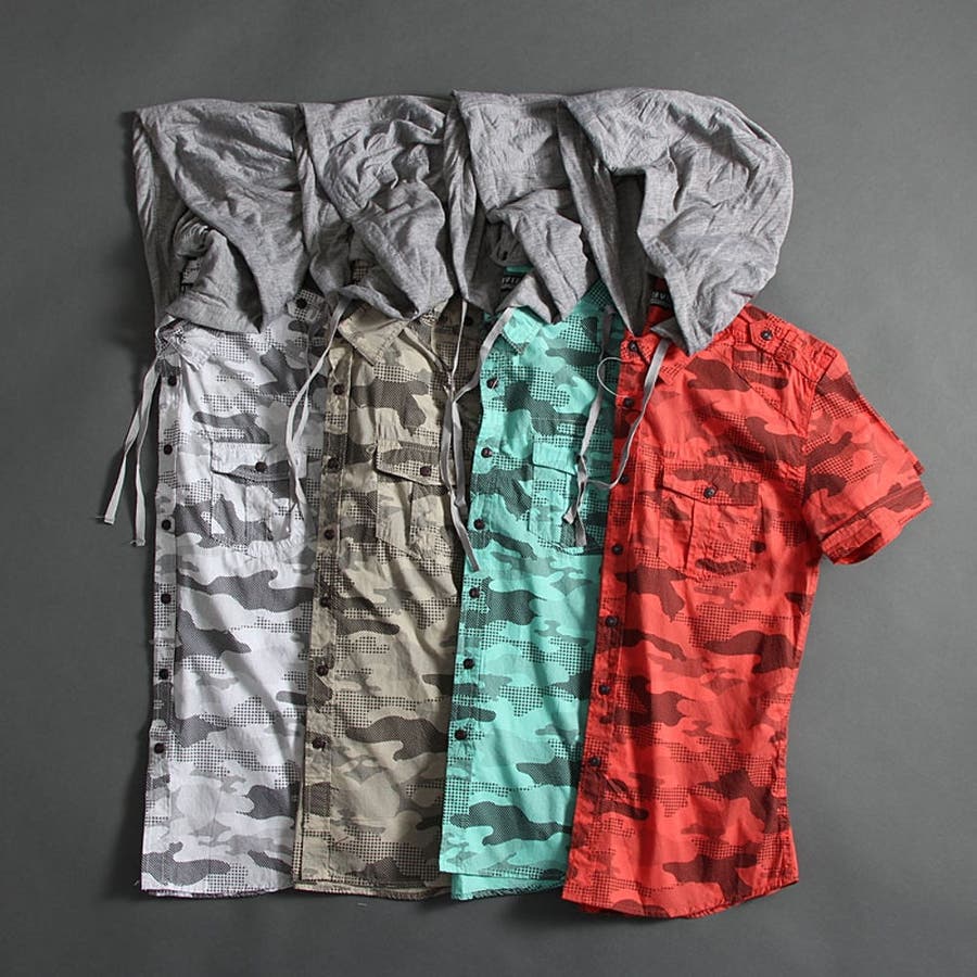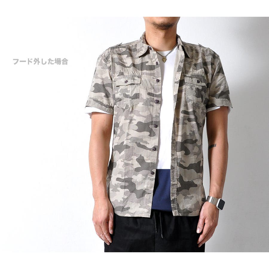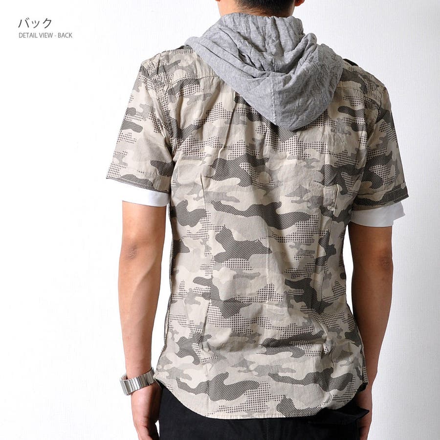 脱着可能なフードが付いた、カモフラ柄の半袖ミリタリーシャツ