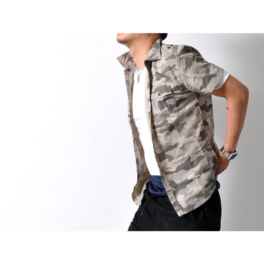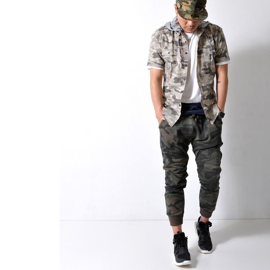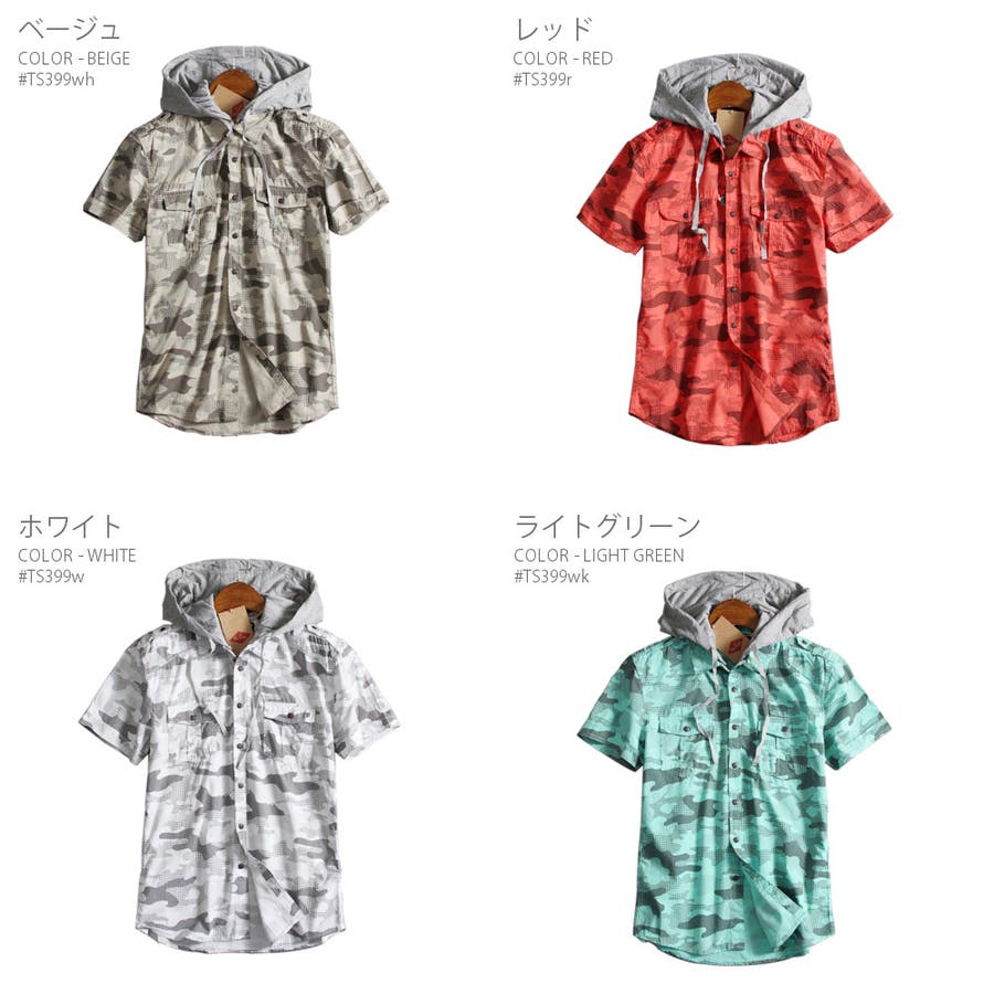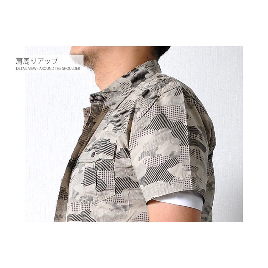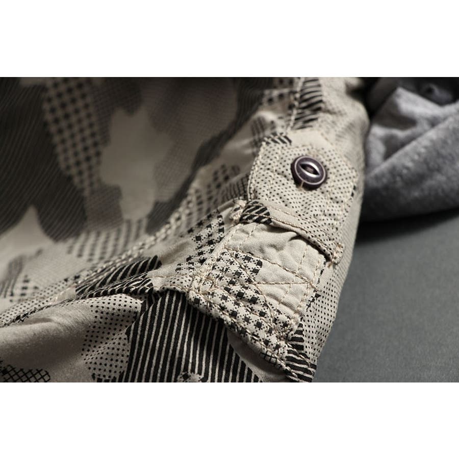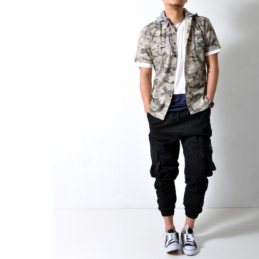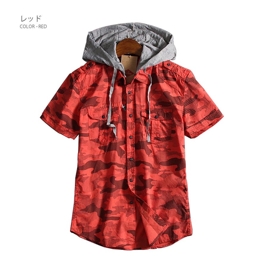 脱着可能なフードが付いた、カモフラ柄の半袖ミリタリーシャツ