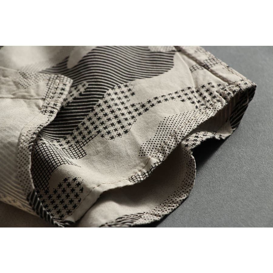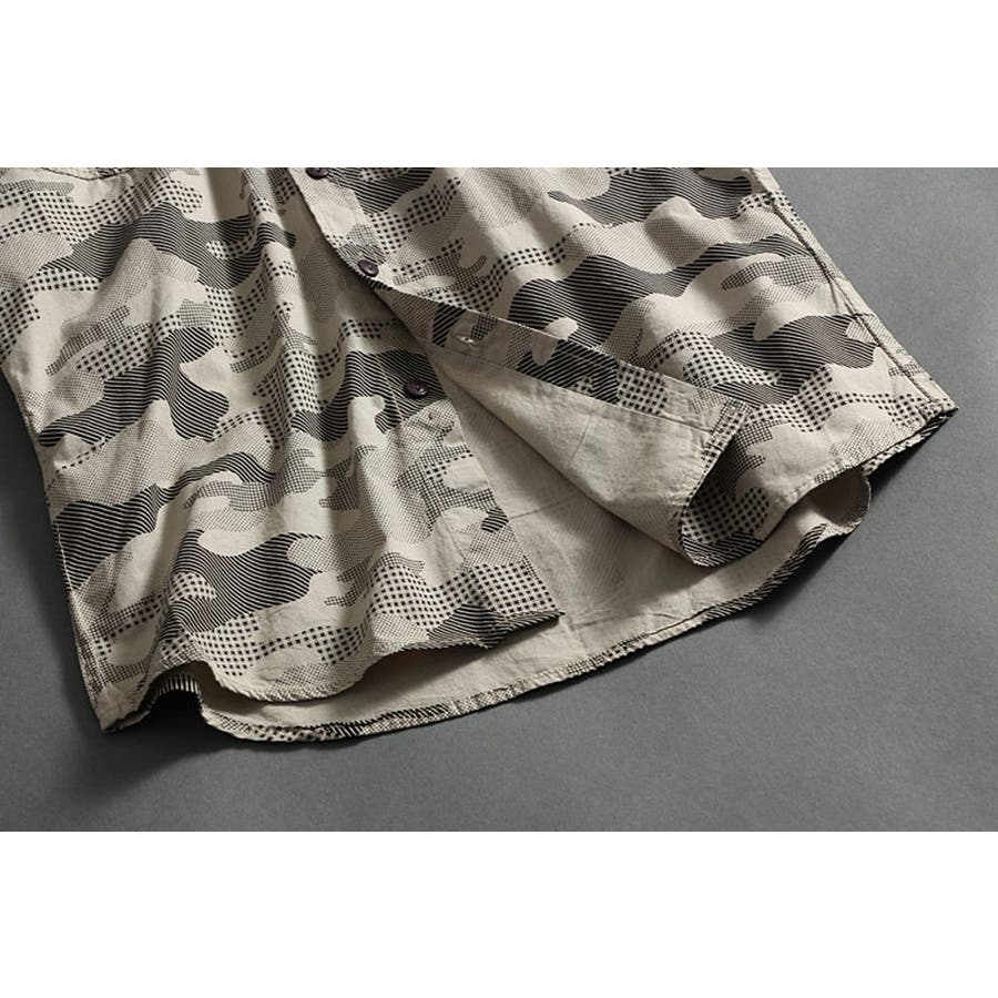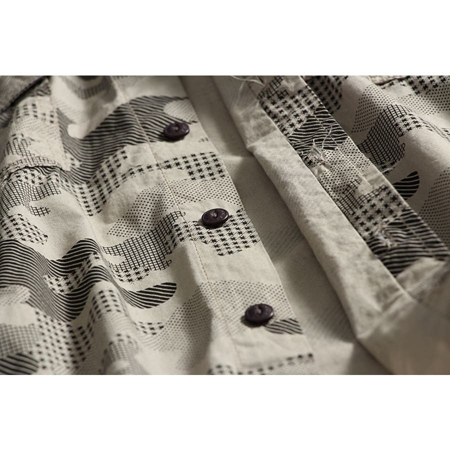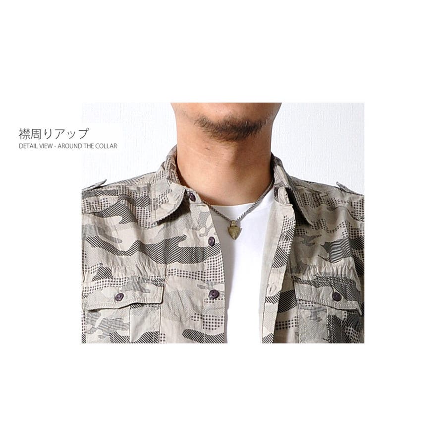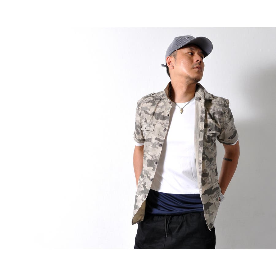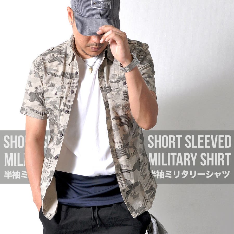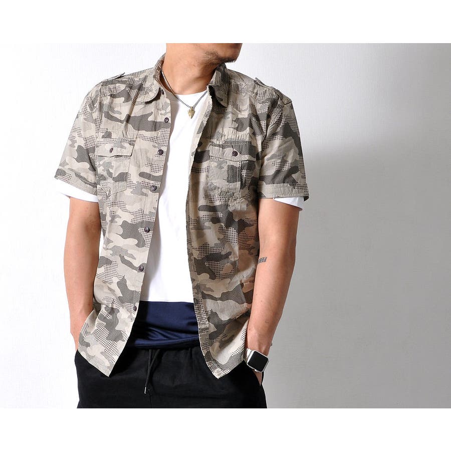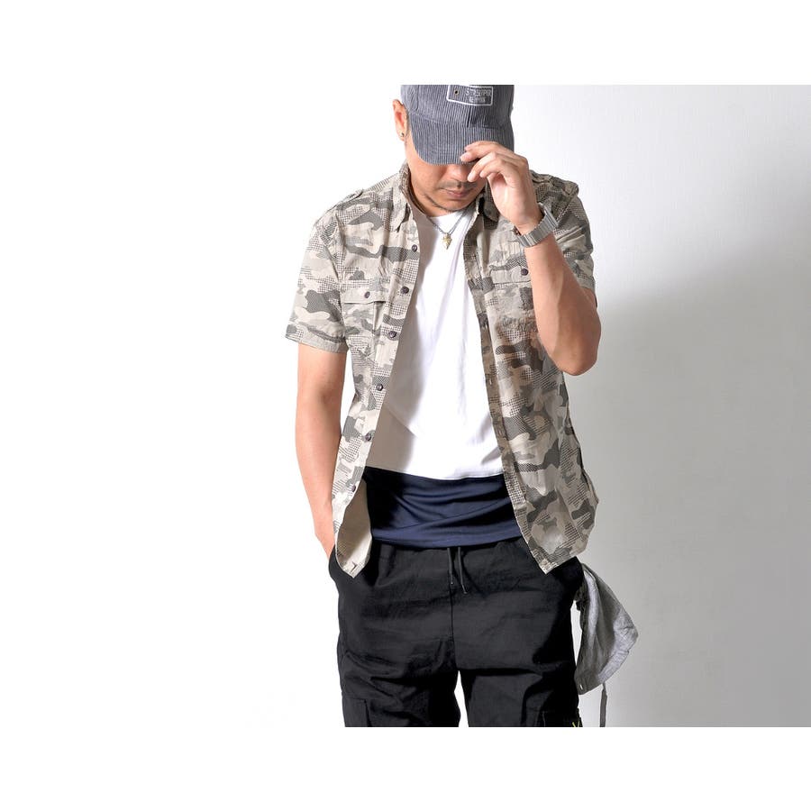 脱着可能なフードが付いた、カモフラ柄の半袖ミリタリーシャツ
