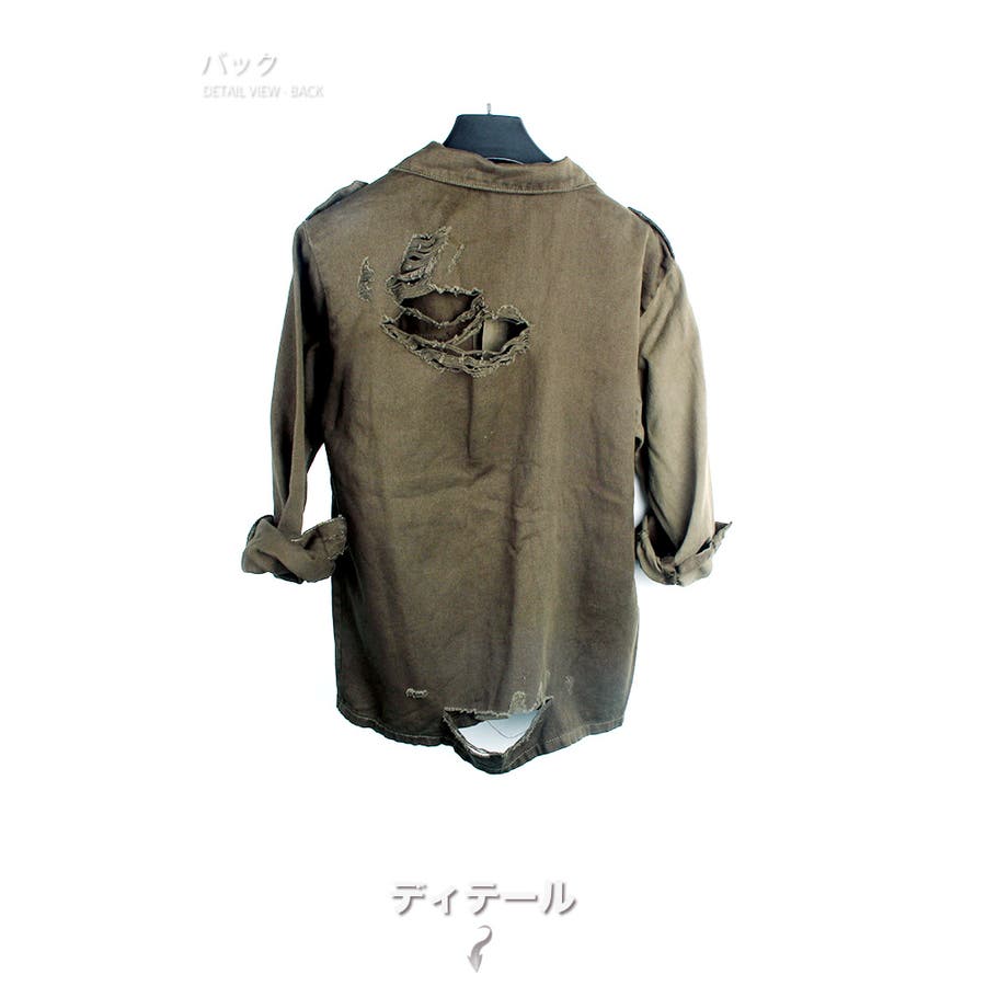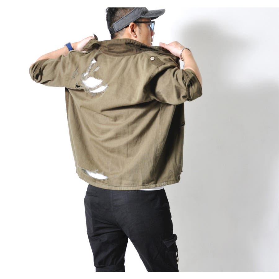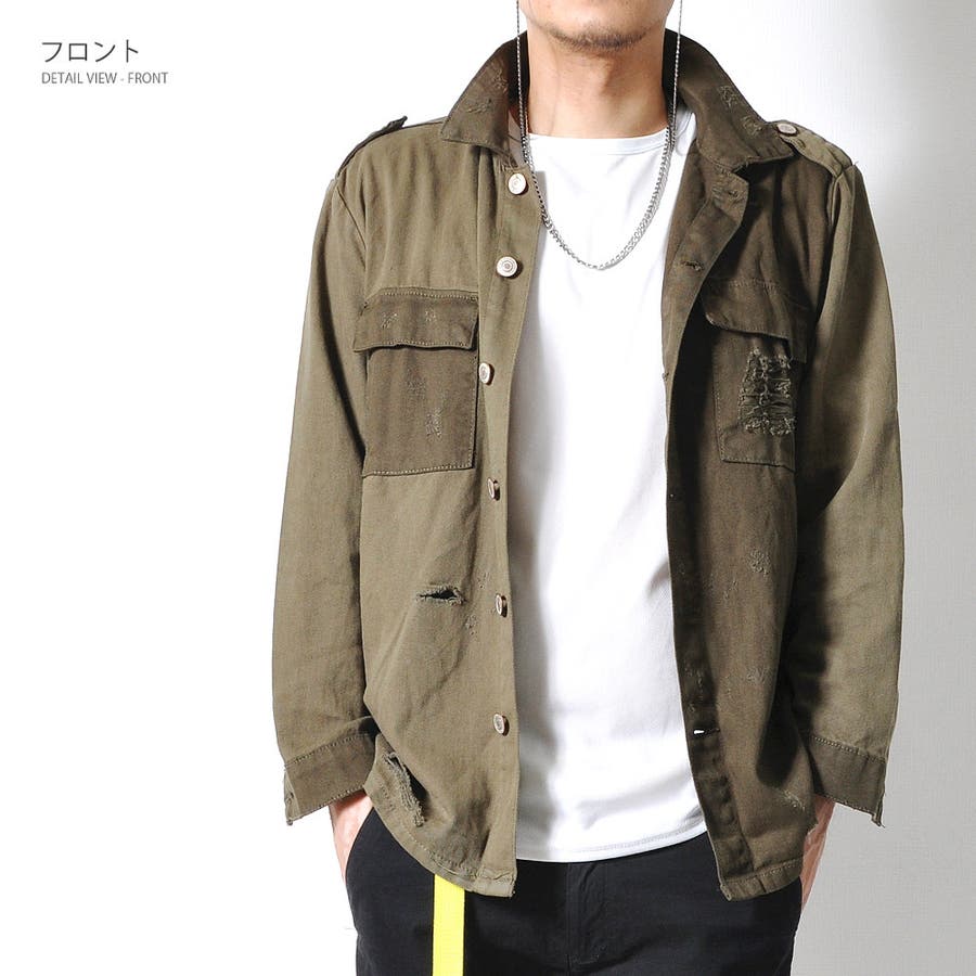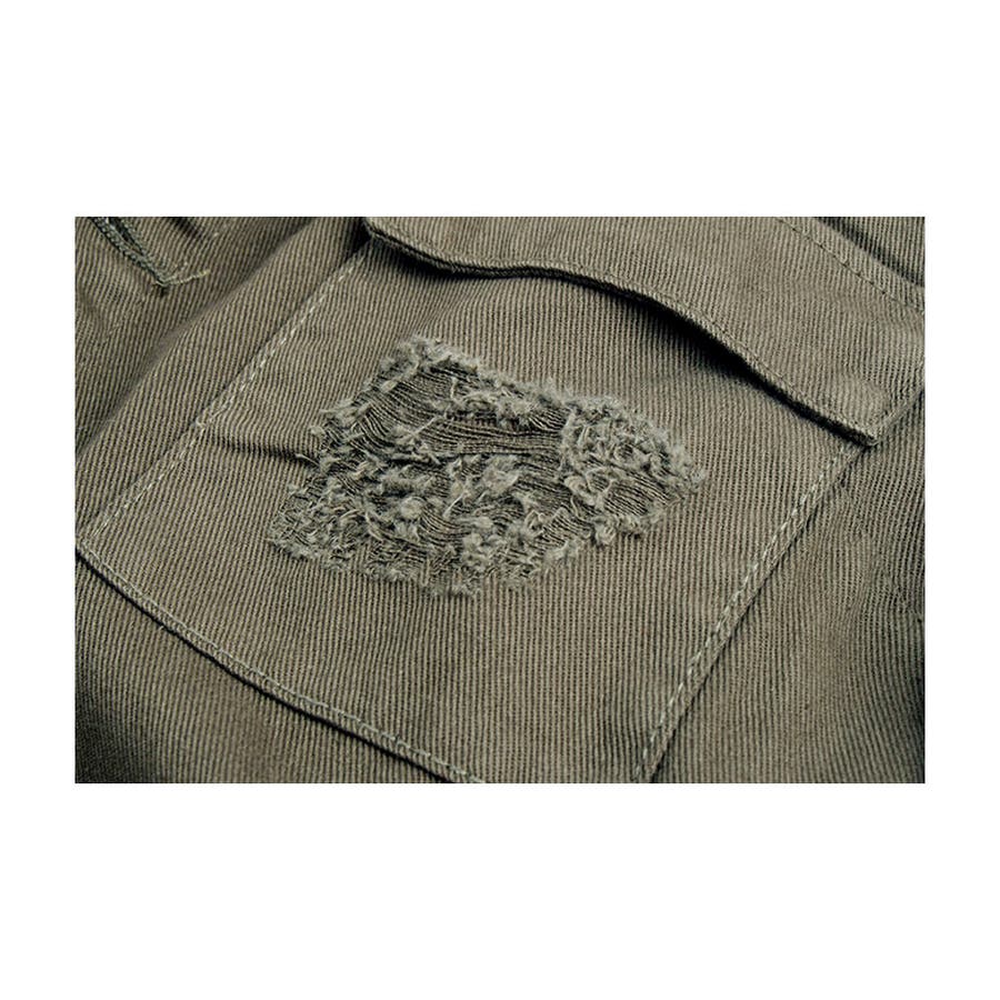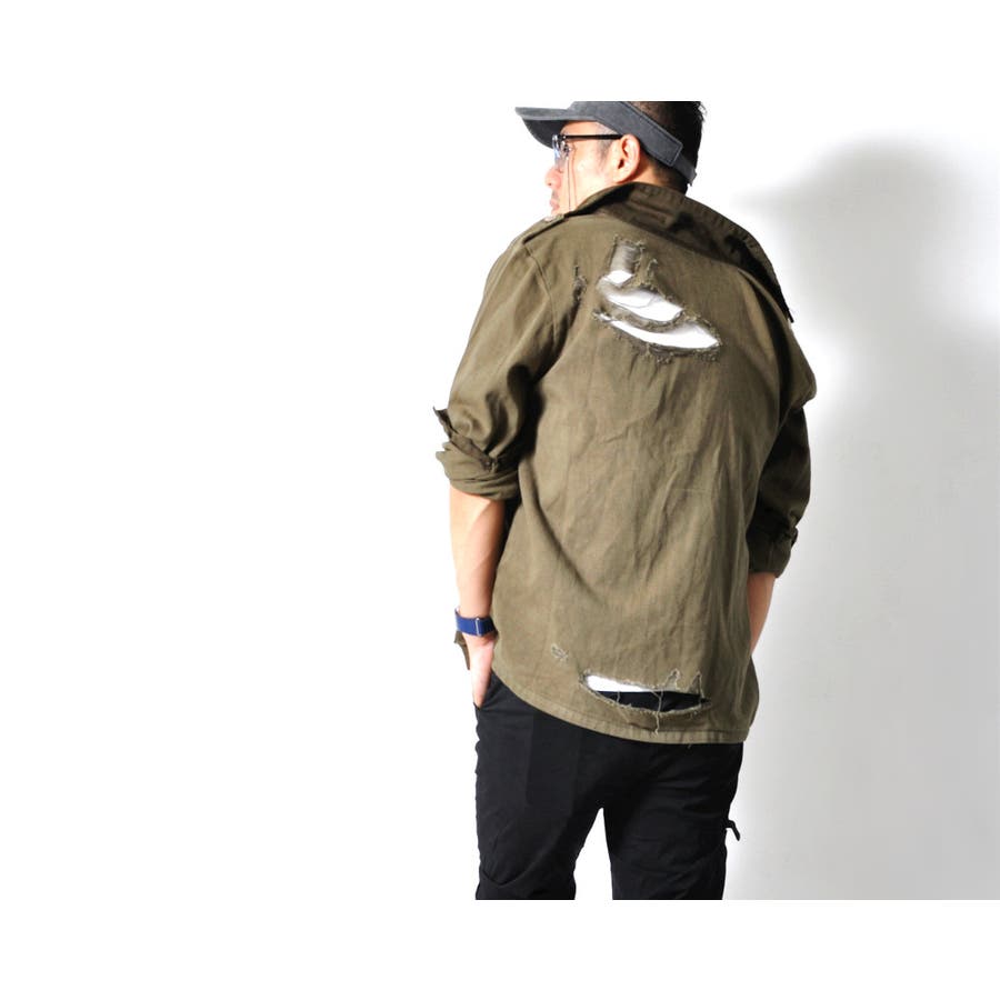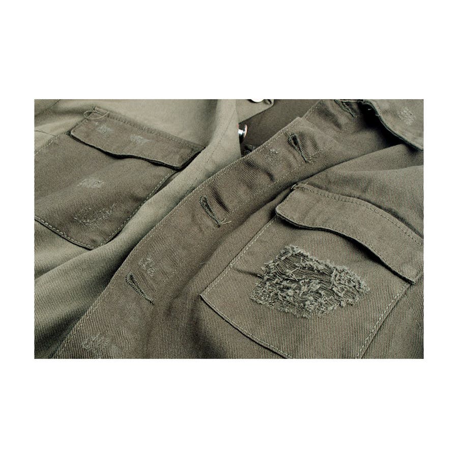 大胆なダメージ加工が目を惹くミリタリーシャツジャケット