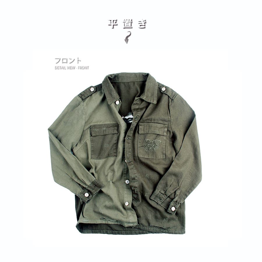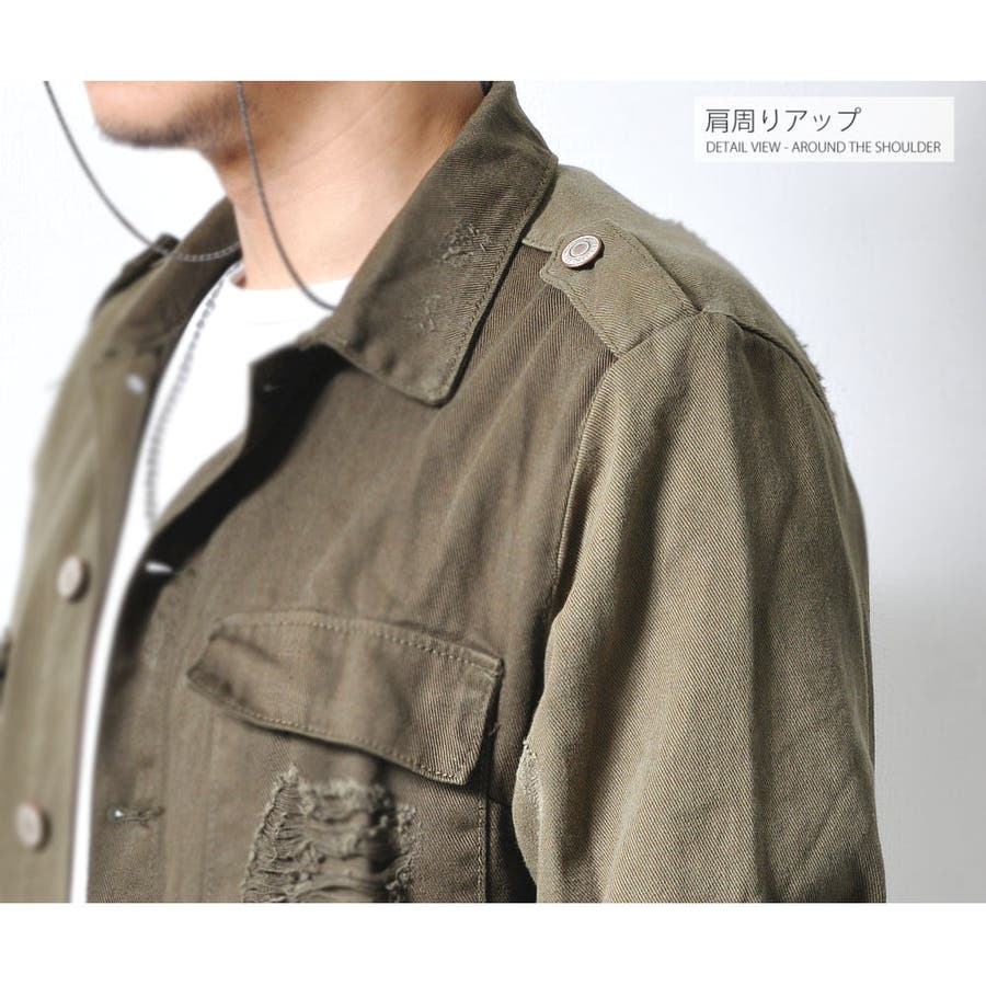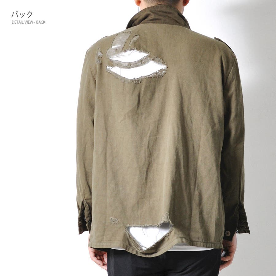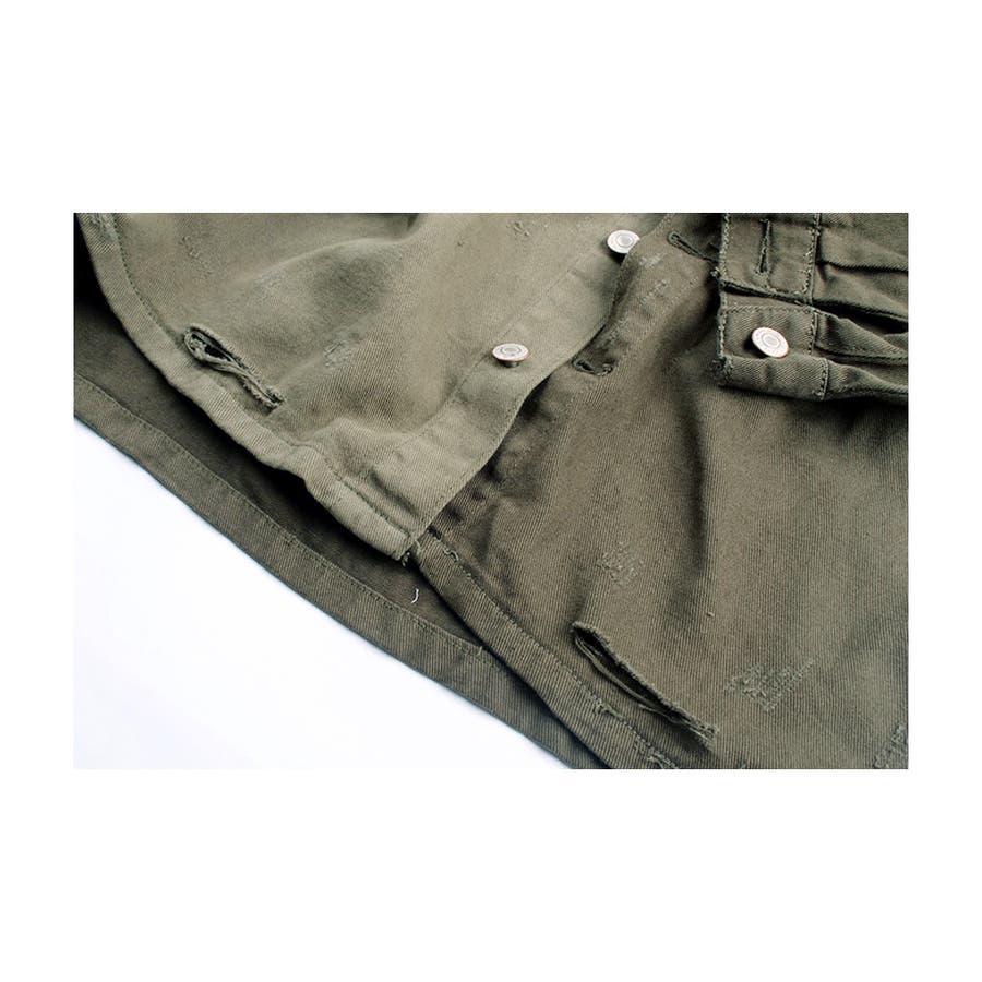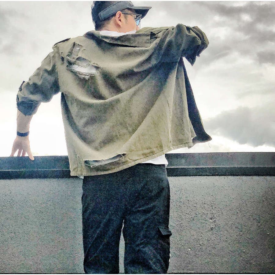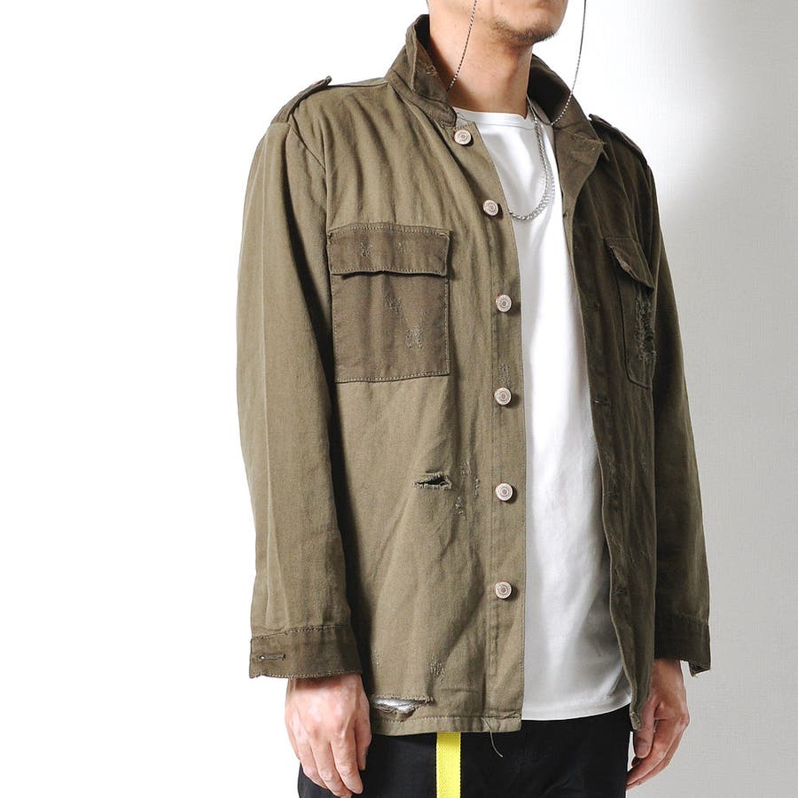大胆なダメージ加工が目を惹くミリタリーシャツジャケット