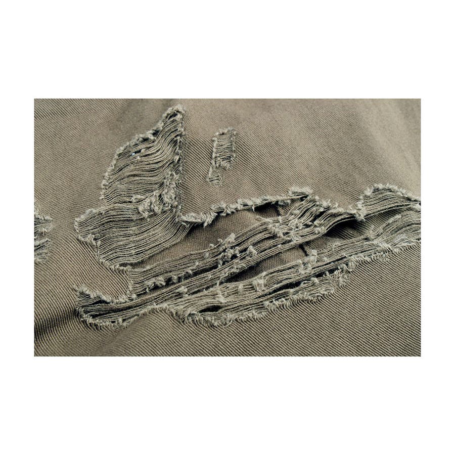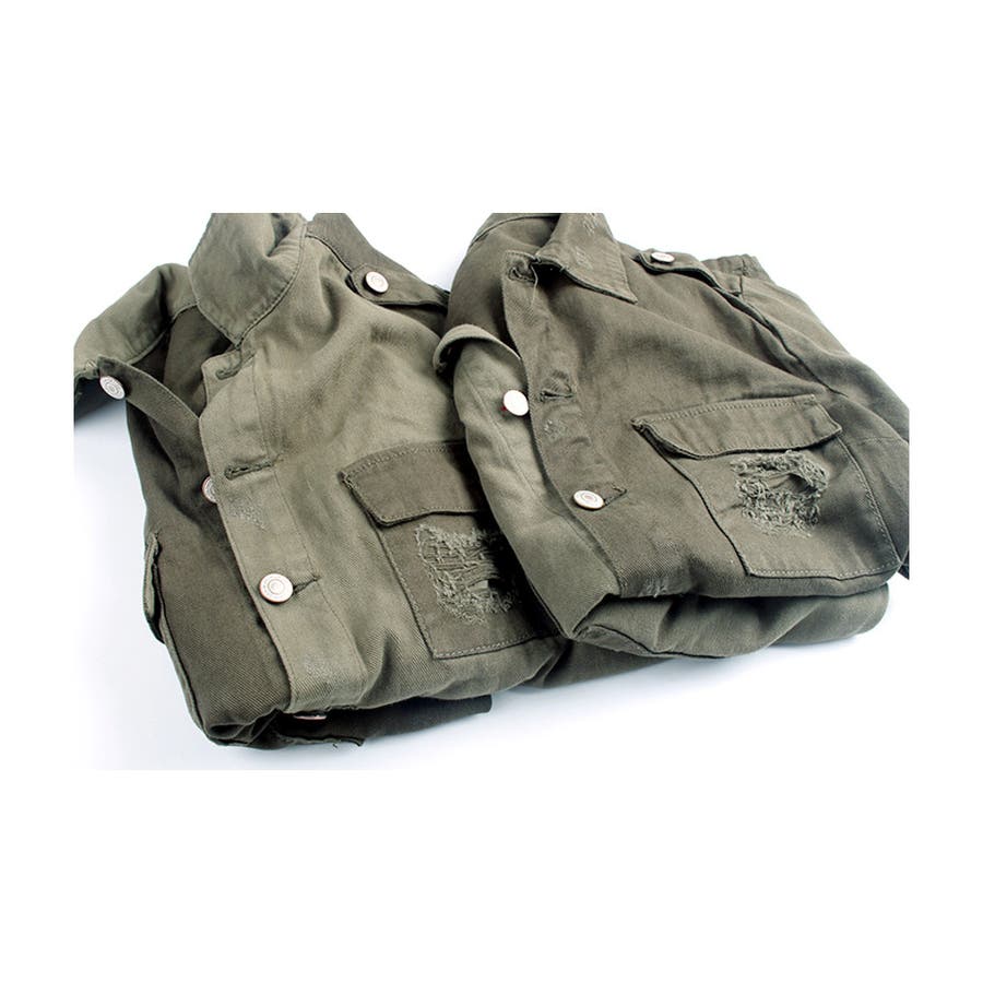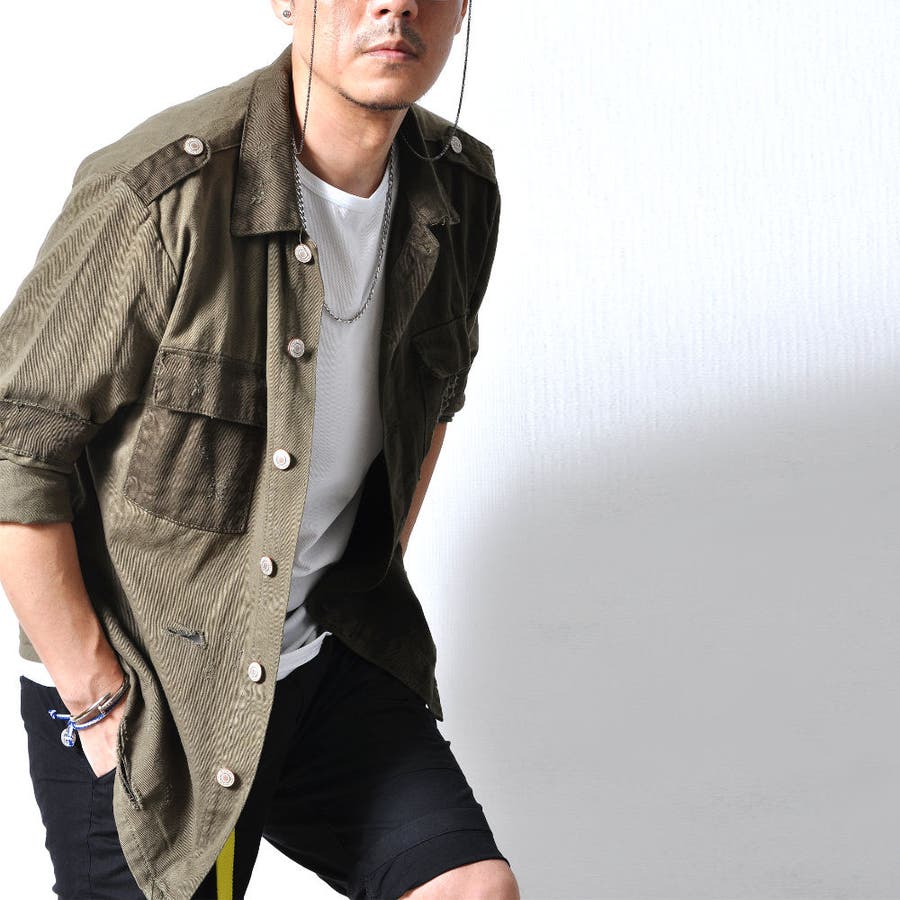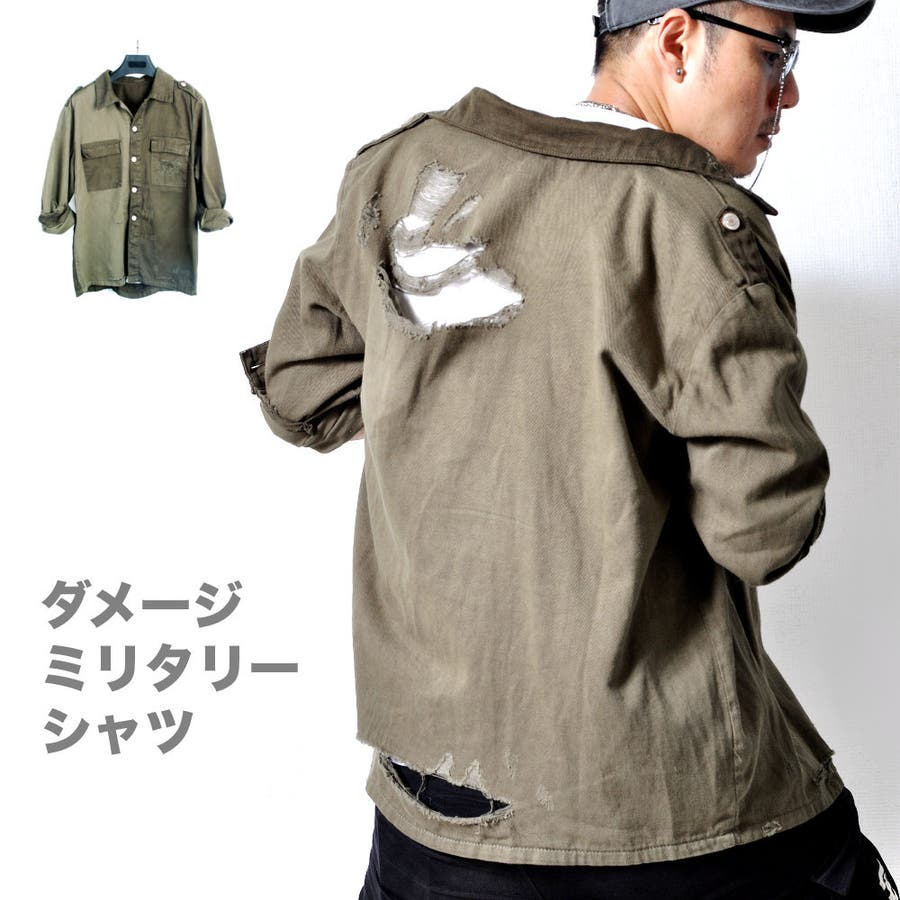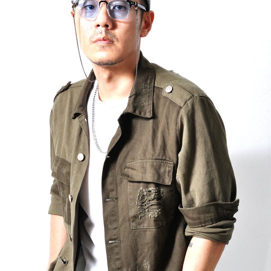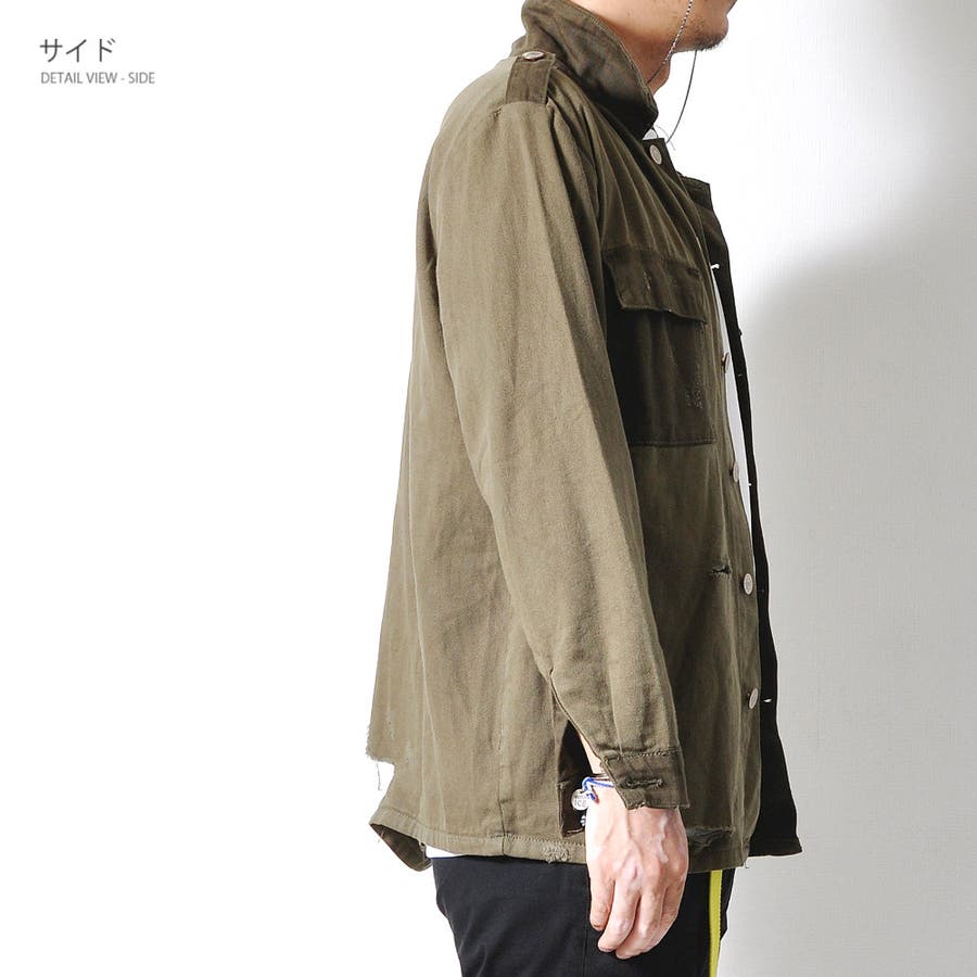 大胆なダメージ加工が目を惹くミリタリーシャツジャケット
