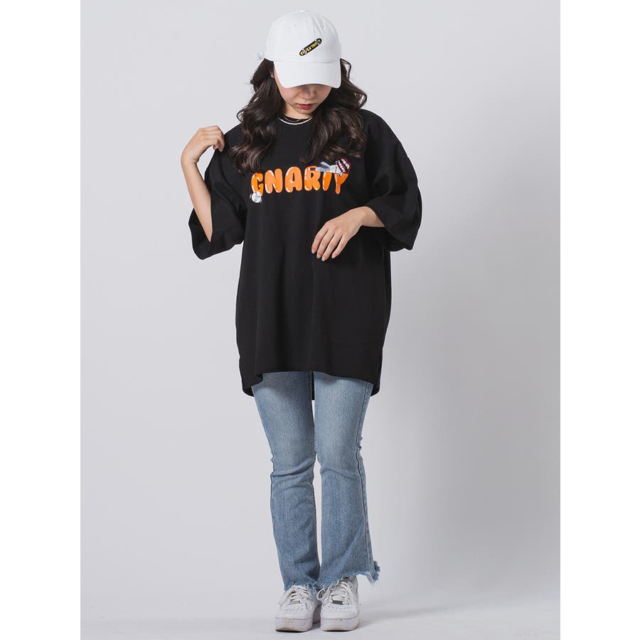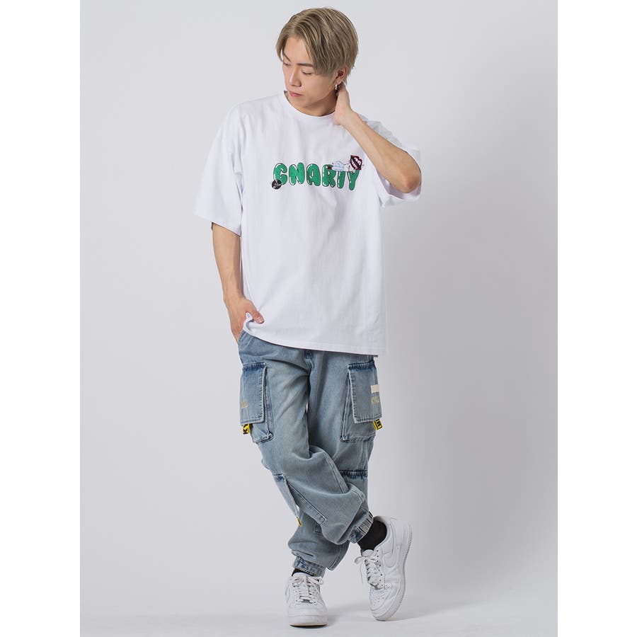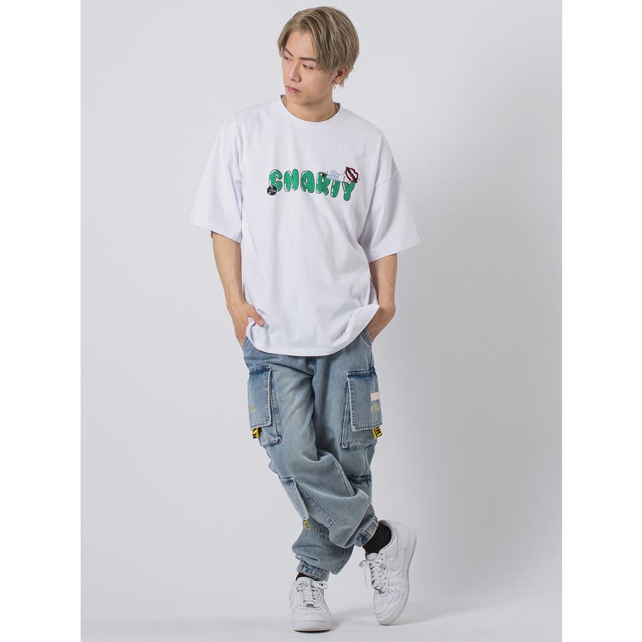 ドロップショルダーでワイドシルエットのルーズ感と太番手の糸を空気圧でソフトに撚り合わせた生地は、その粗野な風合いとボリューム感がストリート系のスタイルにぴったりで、可愛い印象の胸のロゴに寝そべる「なみおくん」は余裕さえ感じさせる。