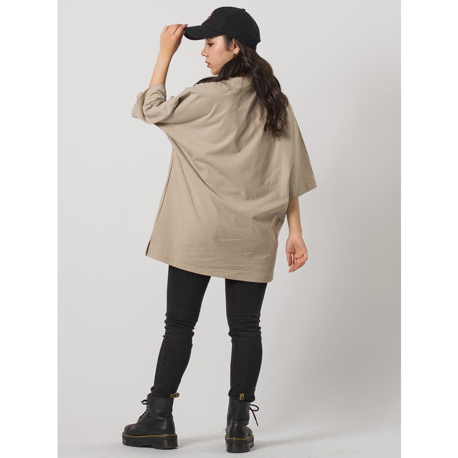Lサイズの着用で袖丈は肘より少し長めで身幅はゆとりあり。着丈はヒップが隠れる長さです。Mサイズでも十分にオーバーサイズの着こなしが出来ます。