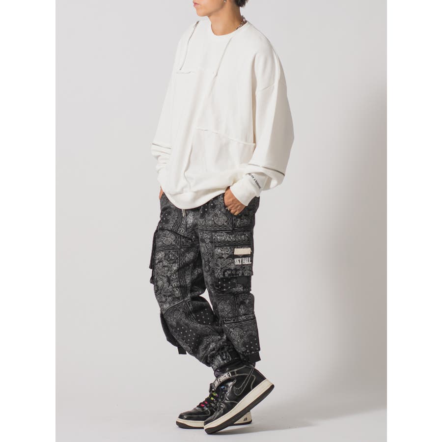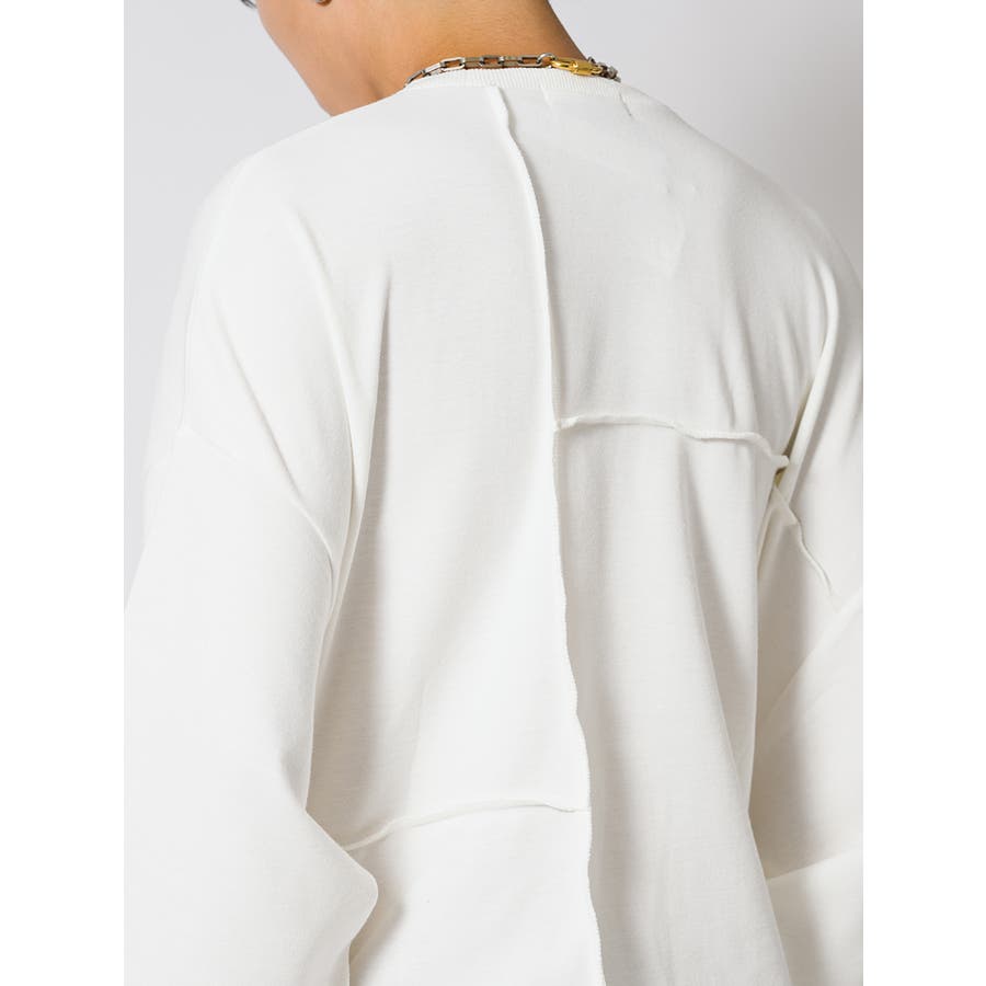 ランダムな大きさにセパレートされたパーツを縫い合わせたボディは、その縫代が切り替えとなって個性的なデザインを表現している。肩付近の切り替え部分に設置したファスナーがさりげないアクセントになっていてクール。そしてその生地は肌触りがソフトで滑らか、軽くて膨らみがあるから着やすいのは勿論、ゆったりしたワイドシルエットが人気のシルエットです。