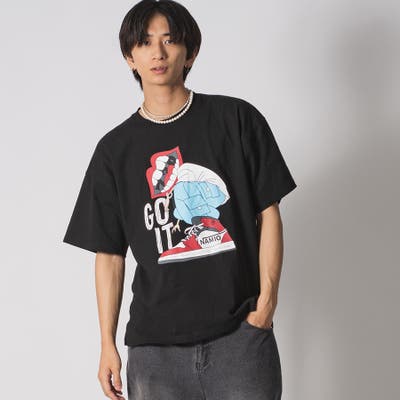 正にスケボーに乗ってる姿に感じるポージング。フロントの大きなイラストとバックの裾のプリントがバランス良く、一枚で着ても様になるTEEシャツ。