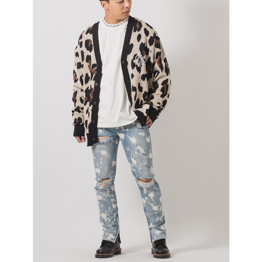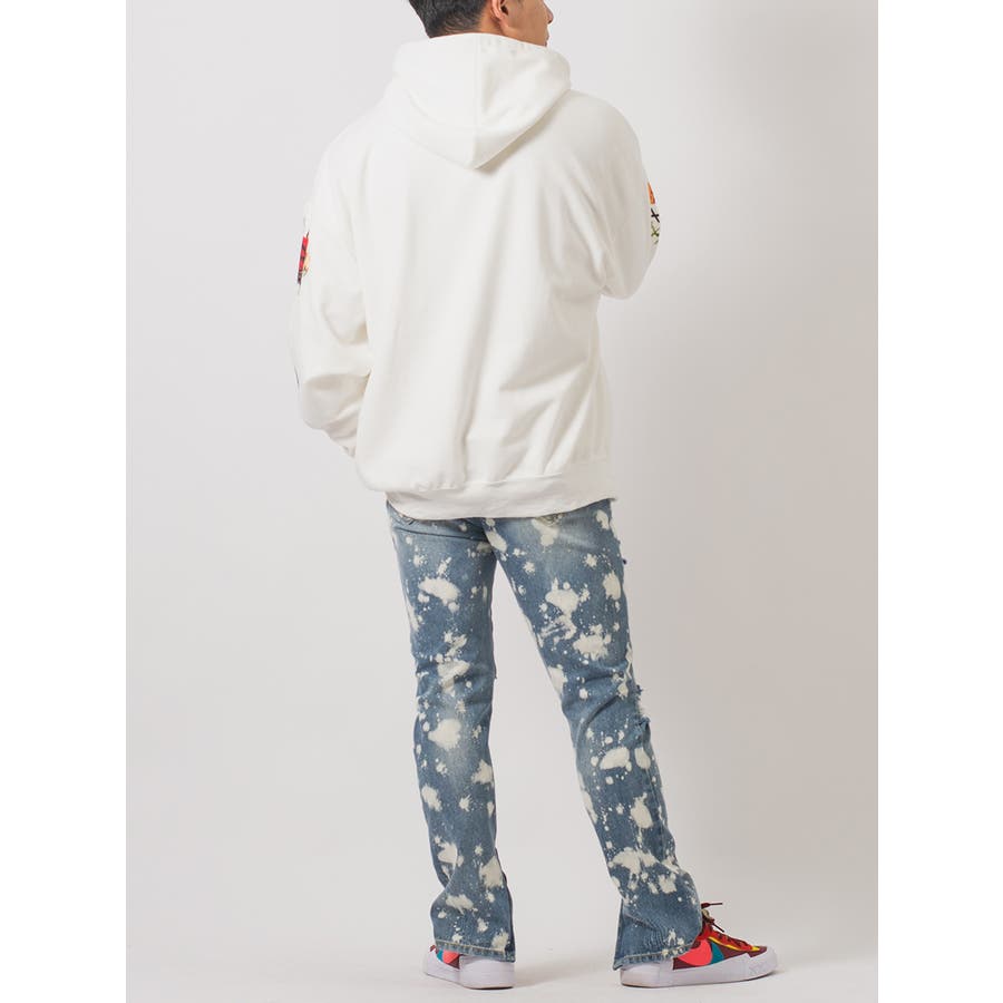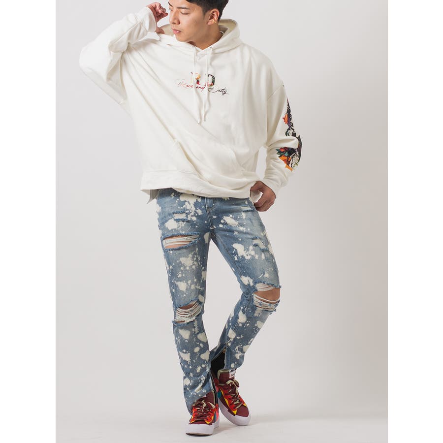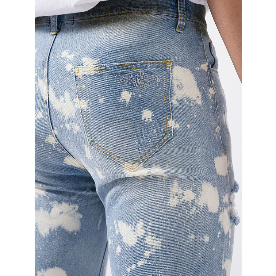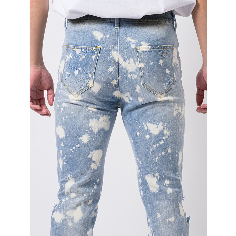 ボディ全体をブリーチ加工によって脱色し、大胆なクラッシュ加工によるダブルダメージが、その存在感を際立てる。腰回りにはゆとりを持たせつつも膝下からはタイトなスリムシルエットが印象的で、脱着がしやすい様に裾部分に配置したファスナーはアクセントにもなっています。