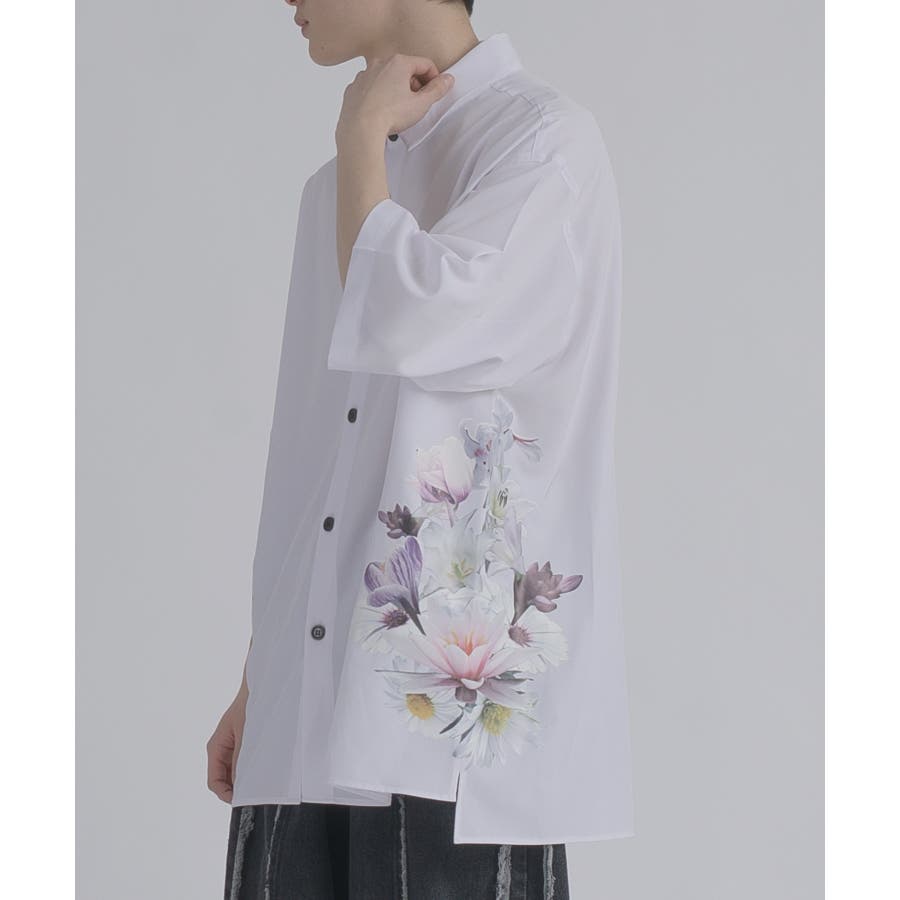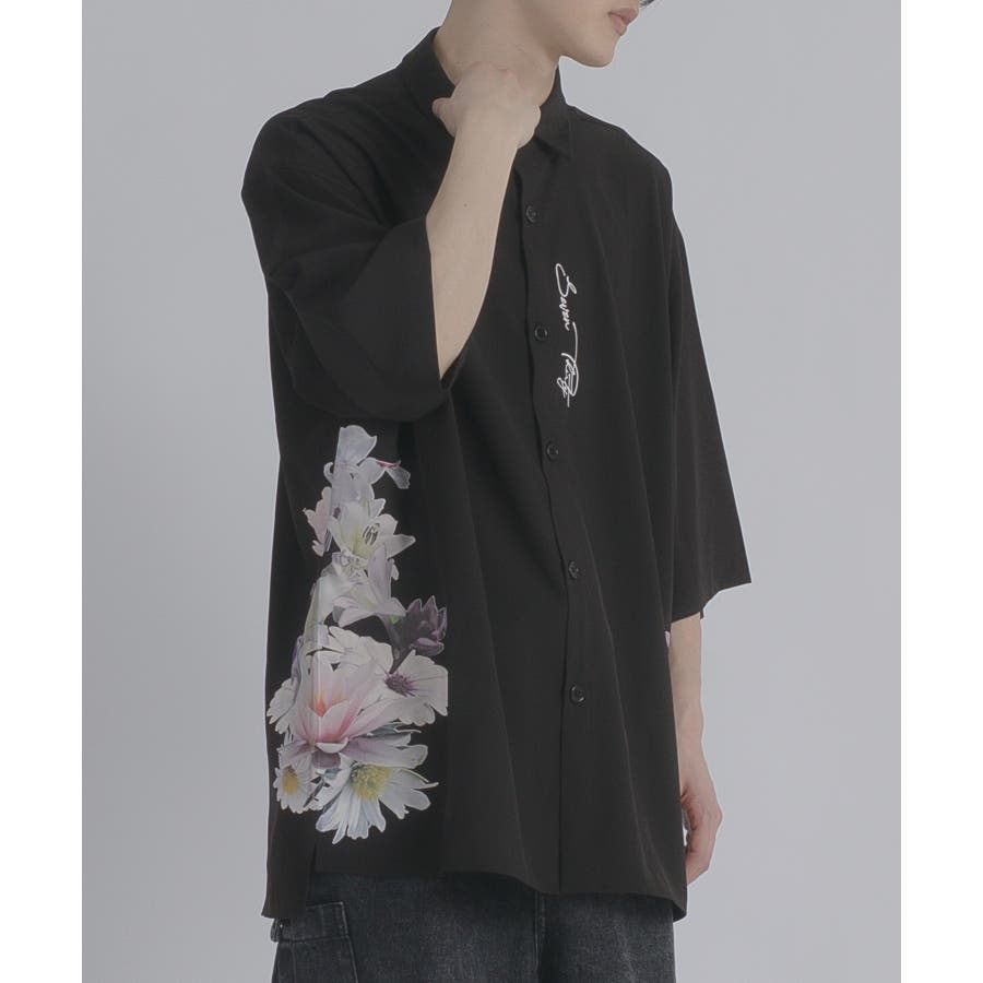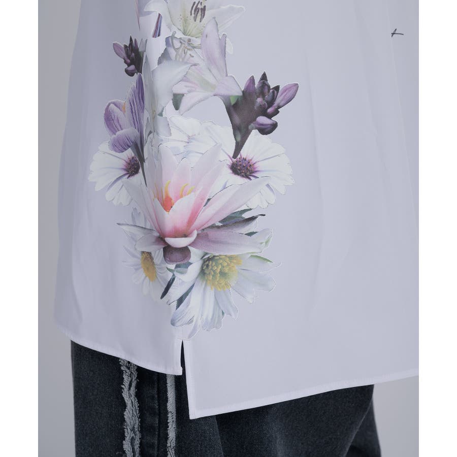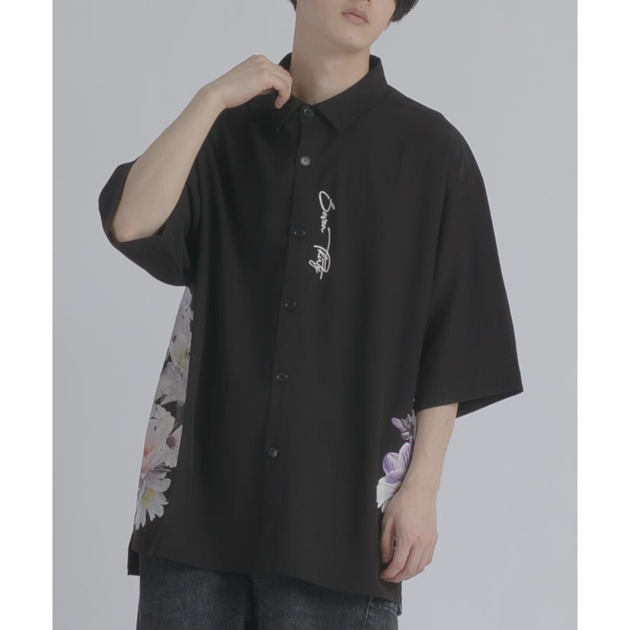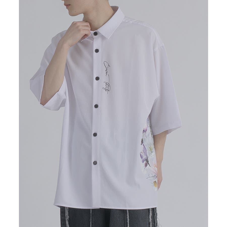 ボディ脇にフラワーコラージュのプリントを配置した半袖のブシャツ。