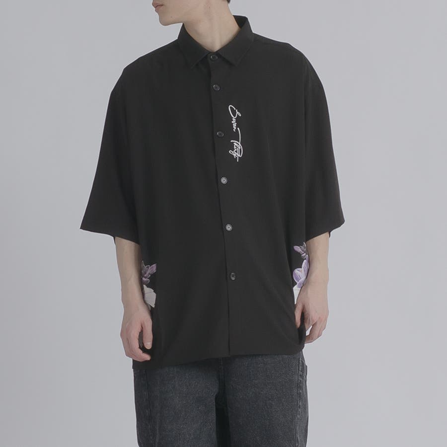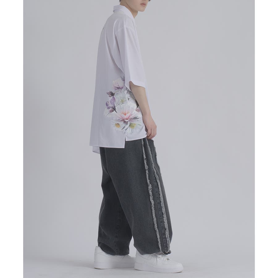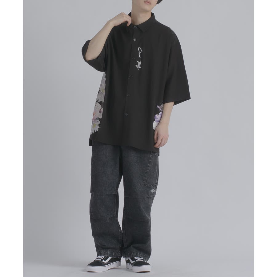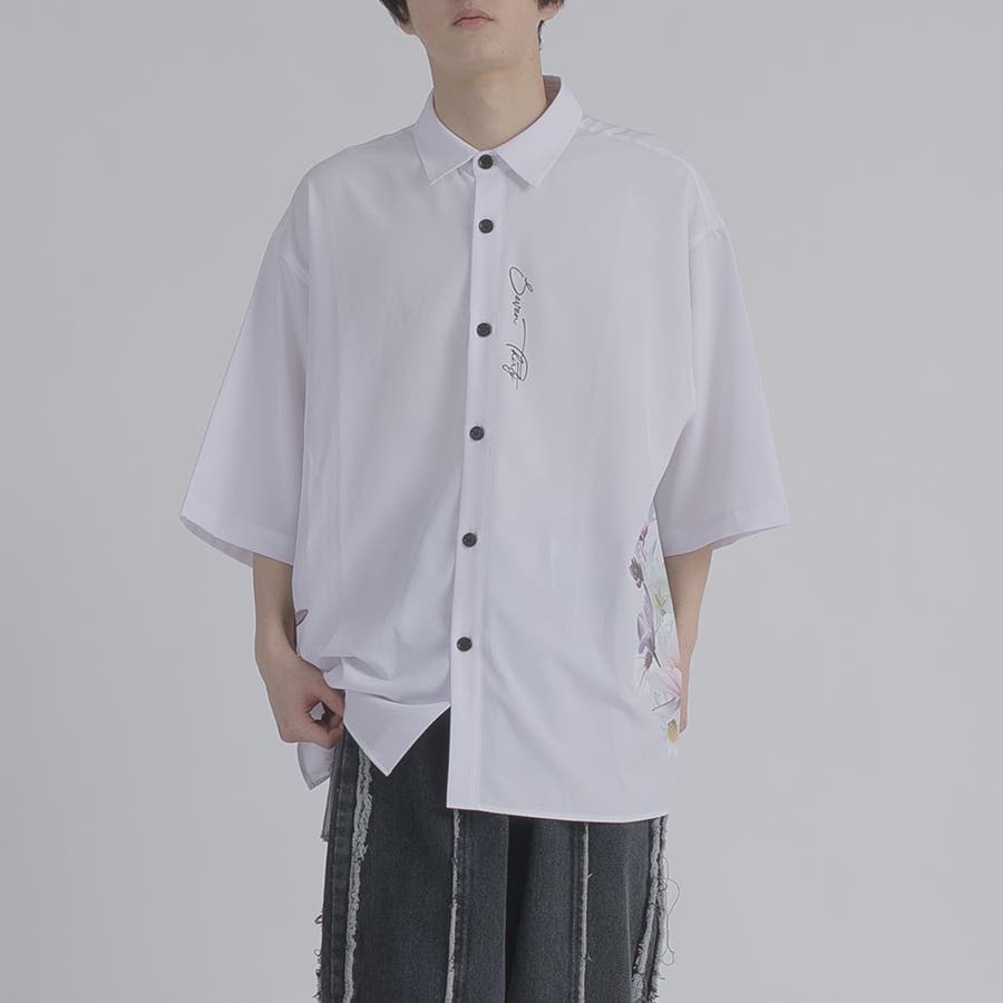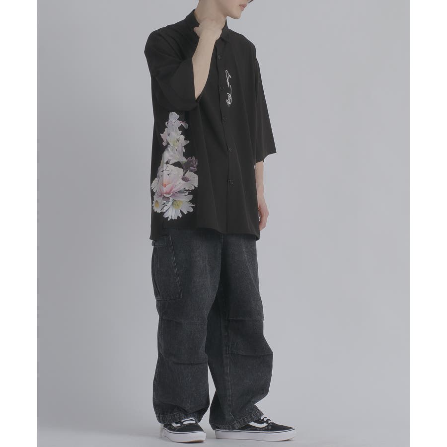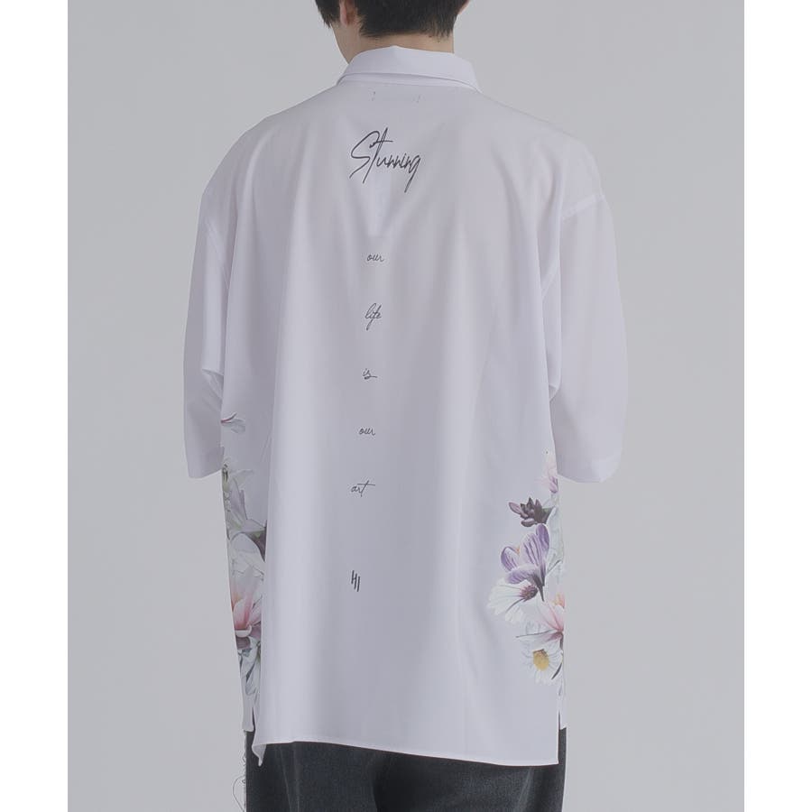ボディ脇にフラワーコラージュのプリントを配置した半袖のブシャツ。