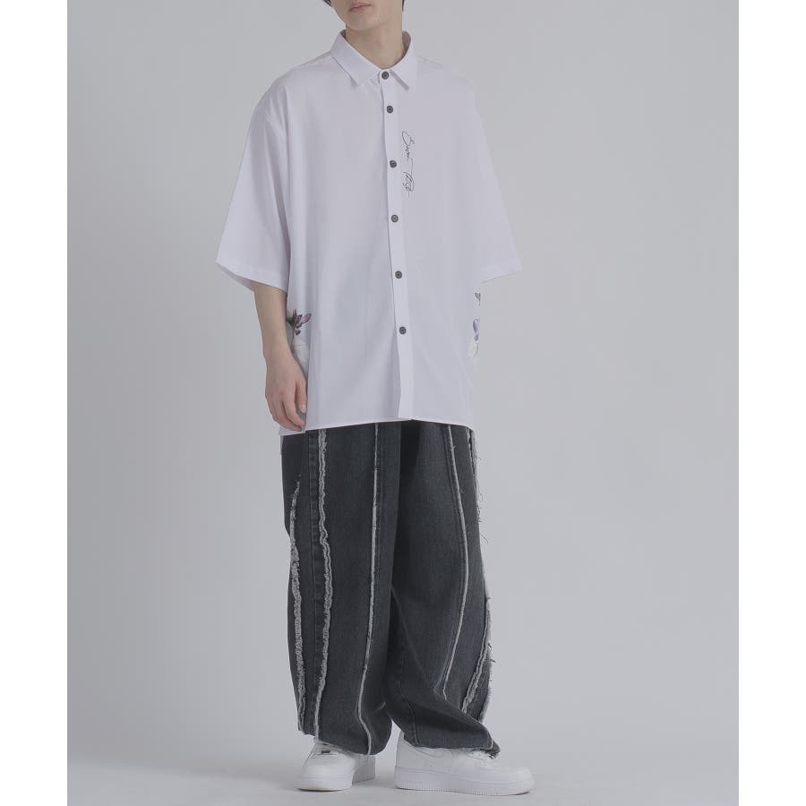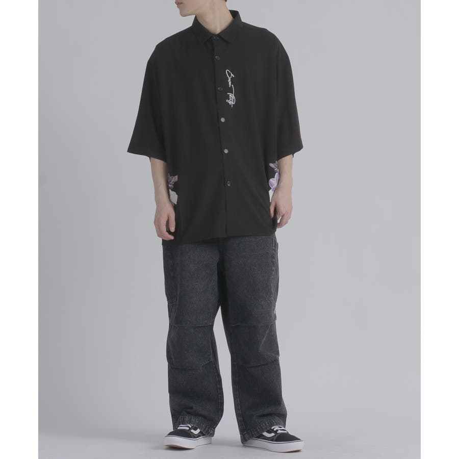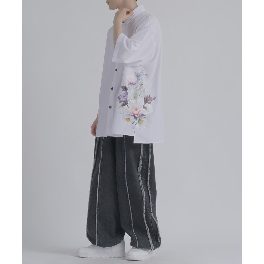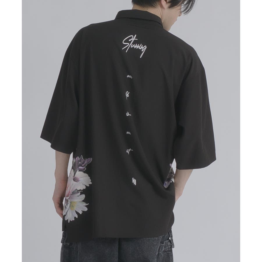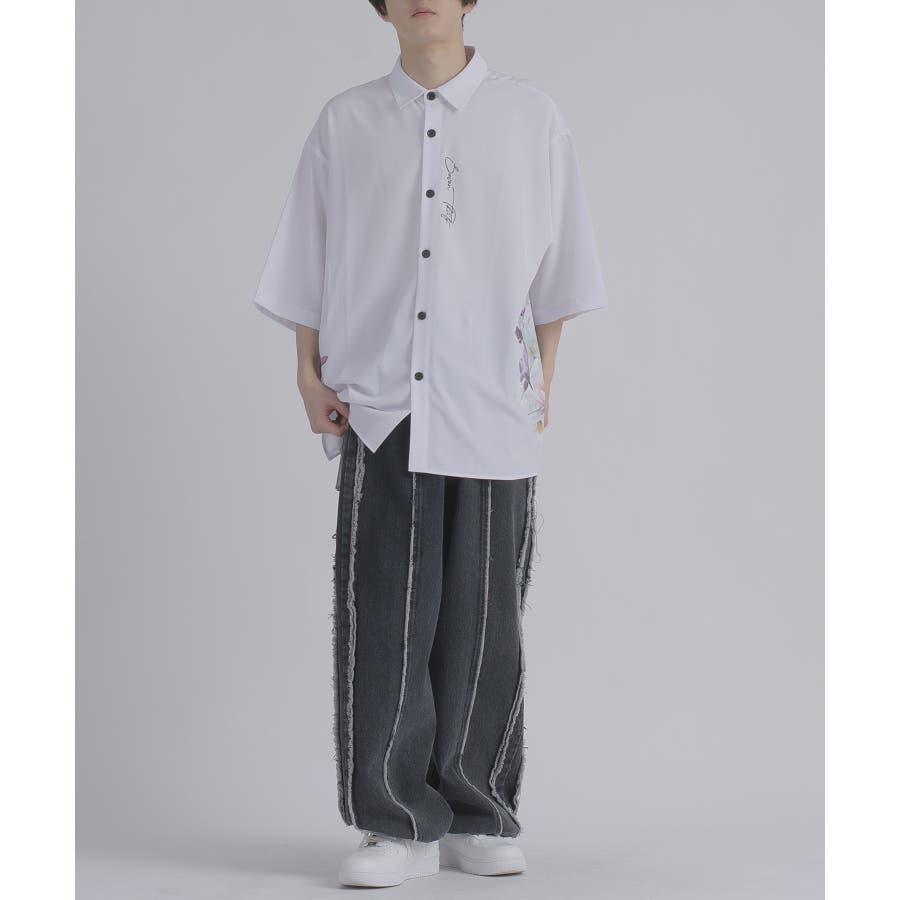 ボディ脇にフラワーコラージュのプリントを配置した半袖のブシャツ。