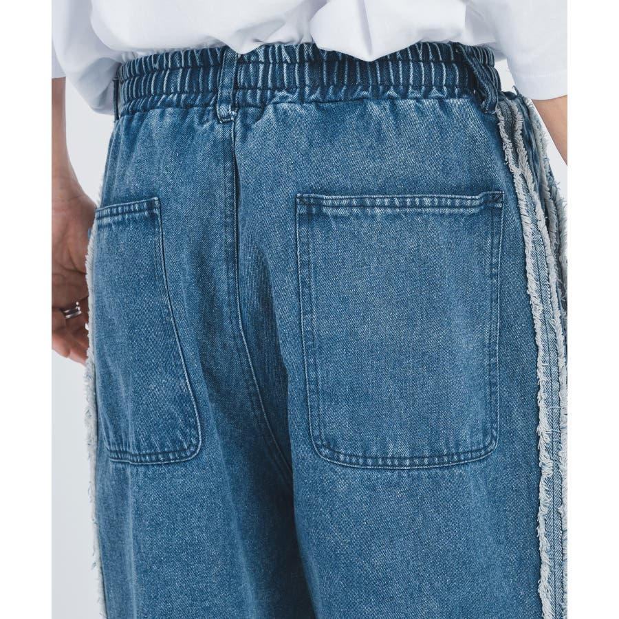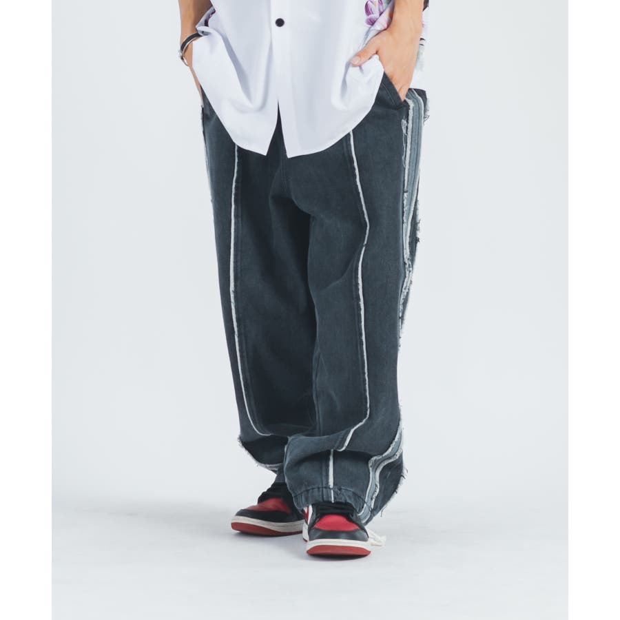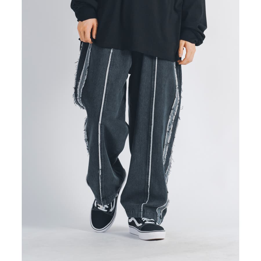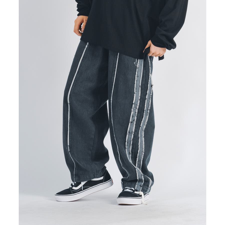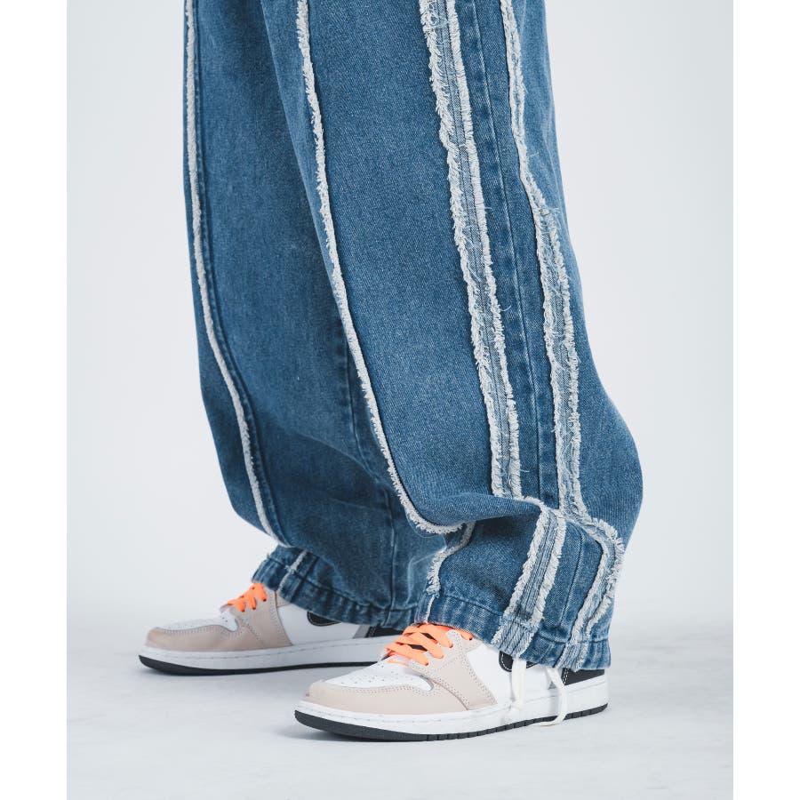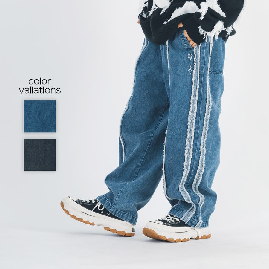 縦に入ったライン状のフリンジが印象的なワイドデニムパンツ。