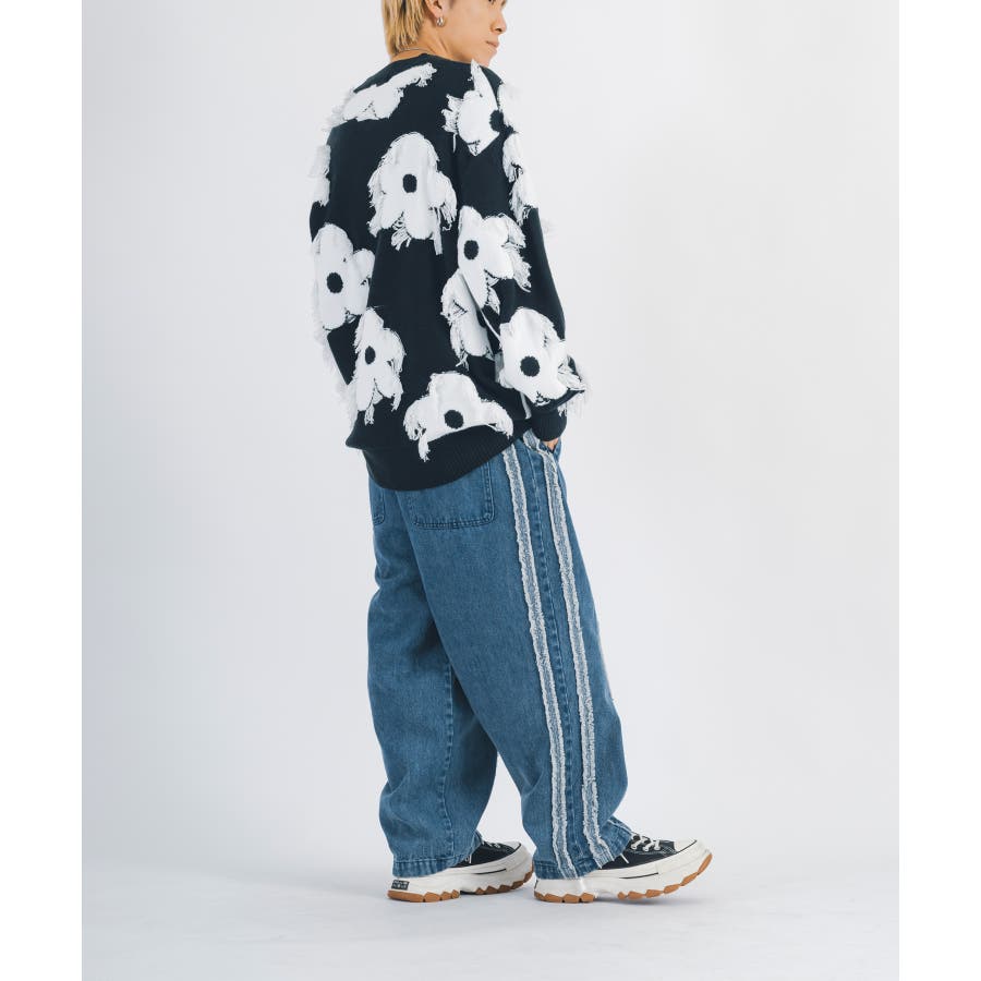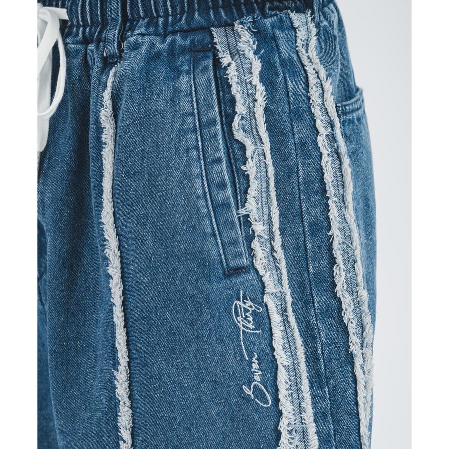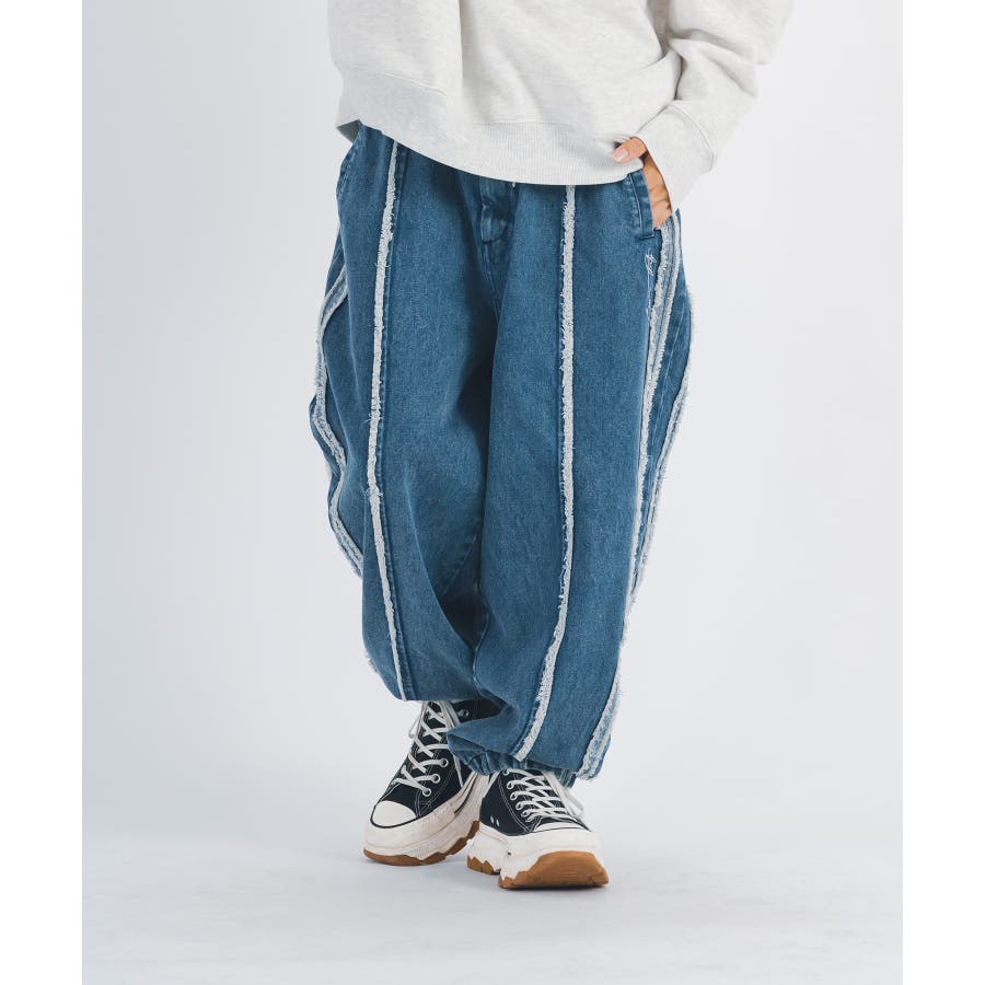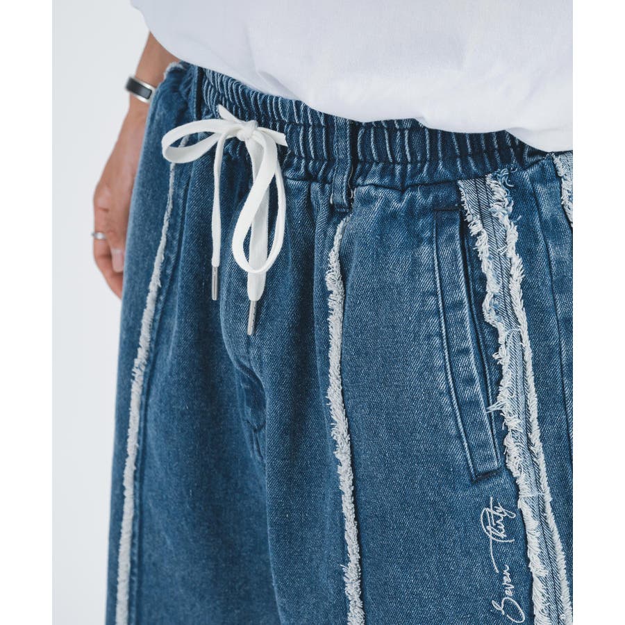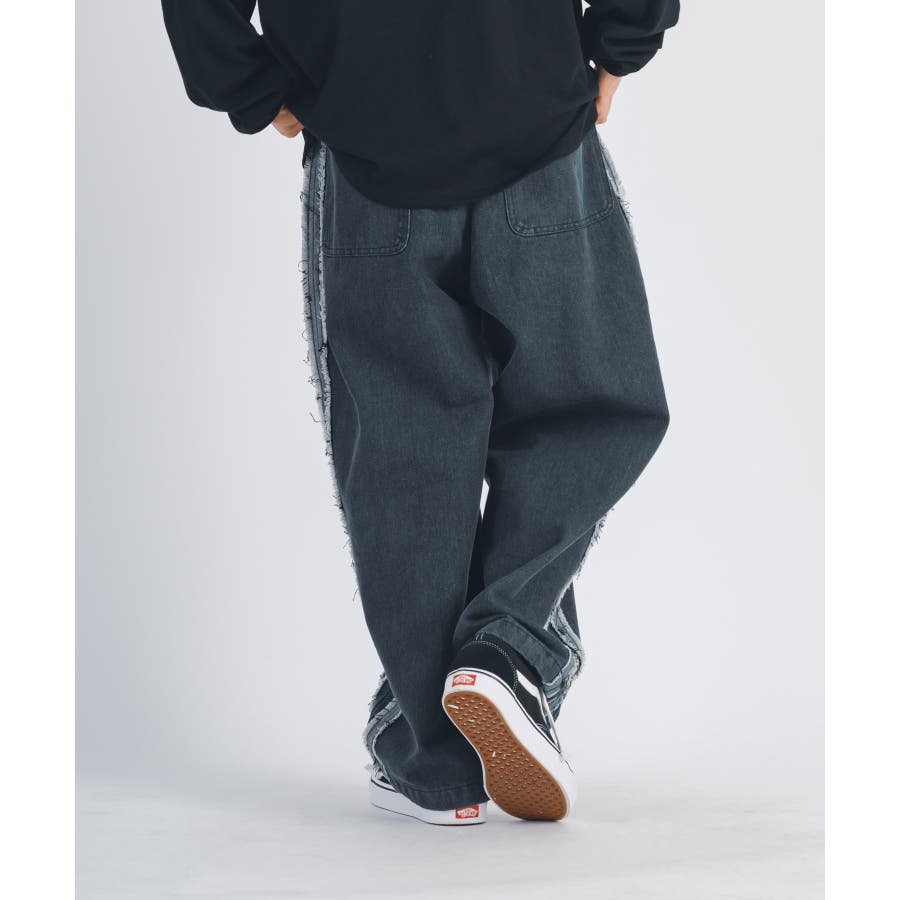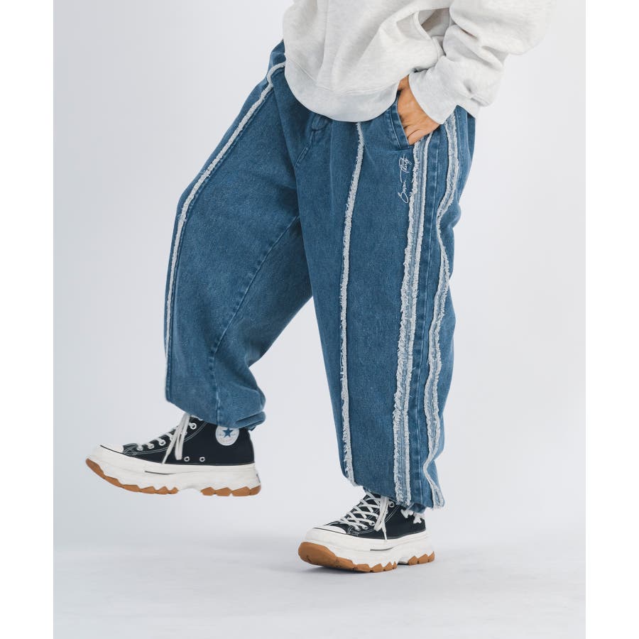 縦に入ったライン状のフリンジが印象的なワイドデニムパンツ。