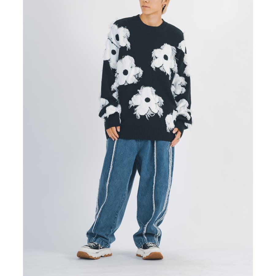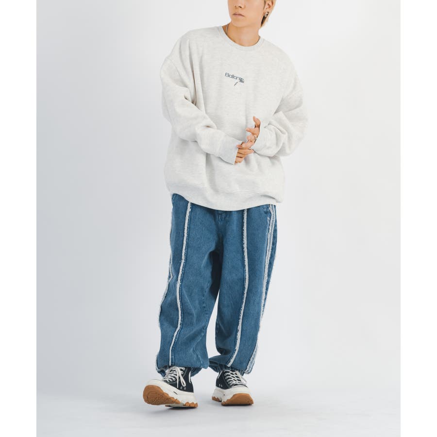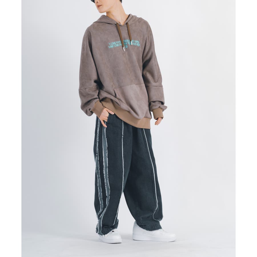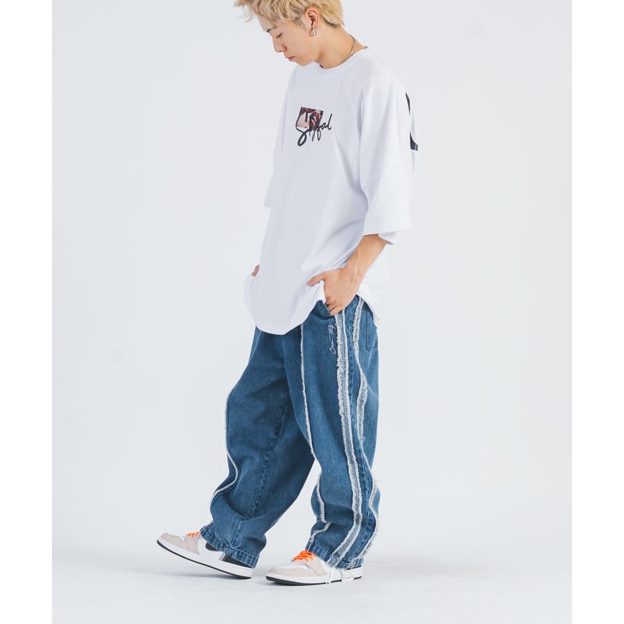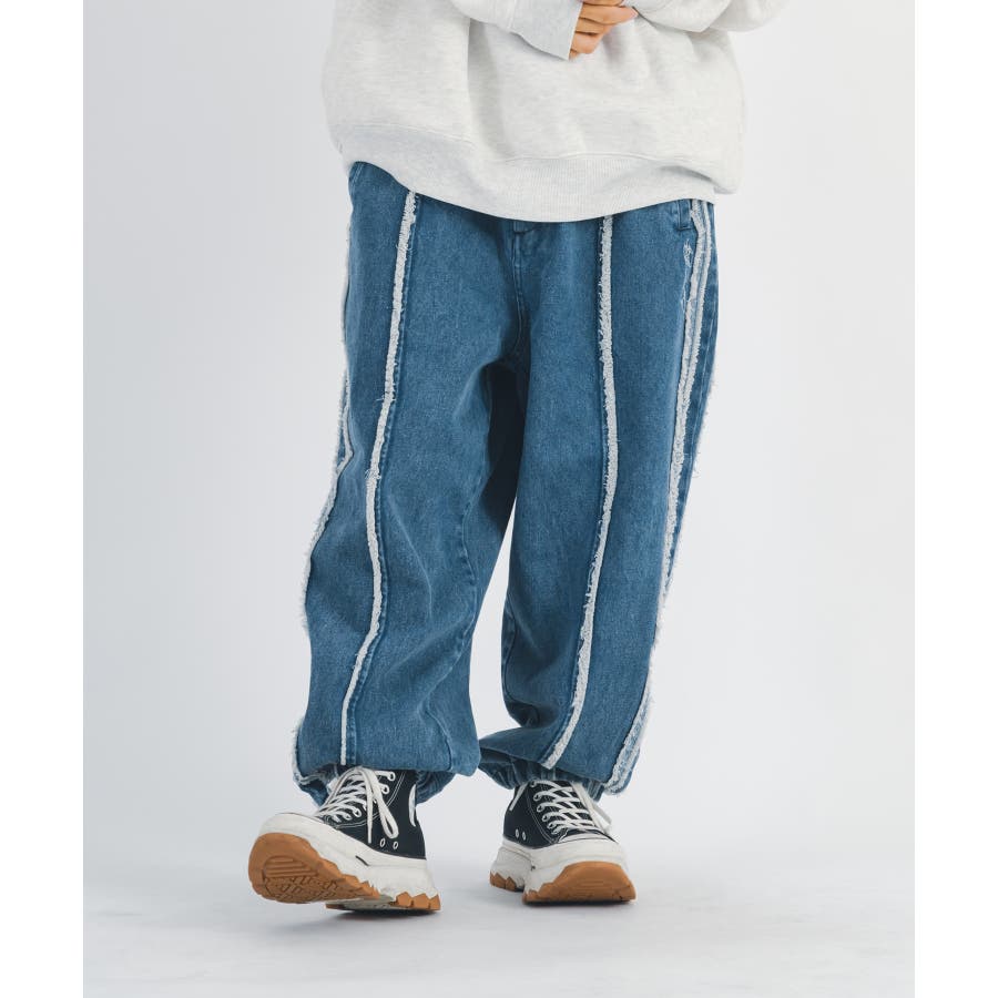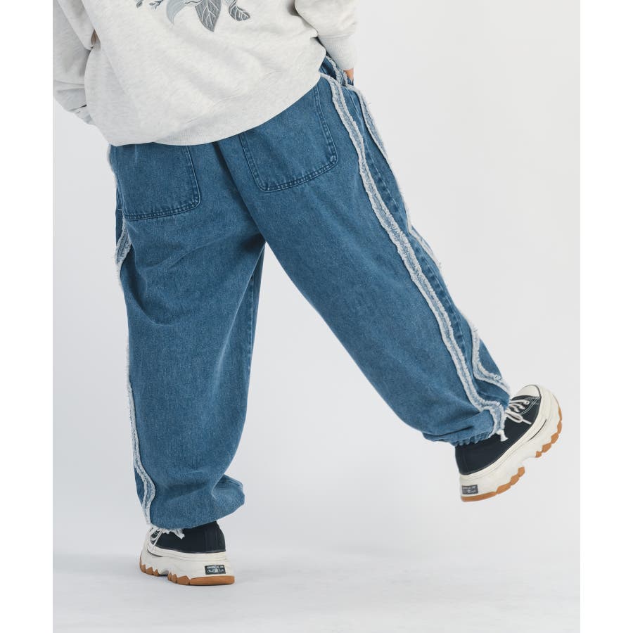 縦に入ったライン状のフリンジが印象的なワイドデニムパンツ。