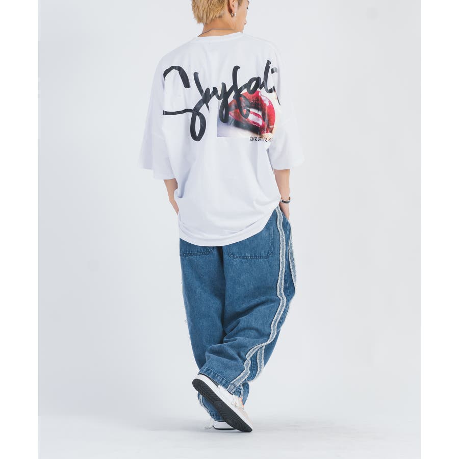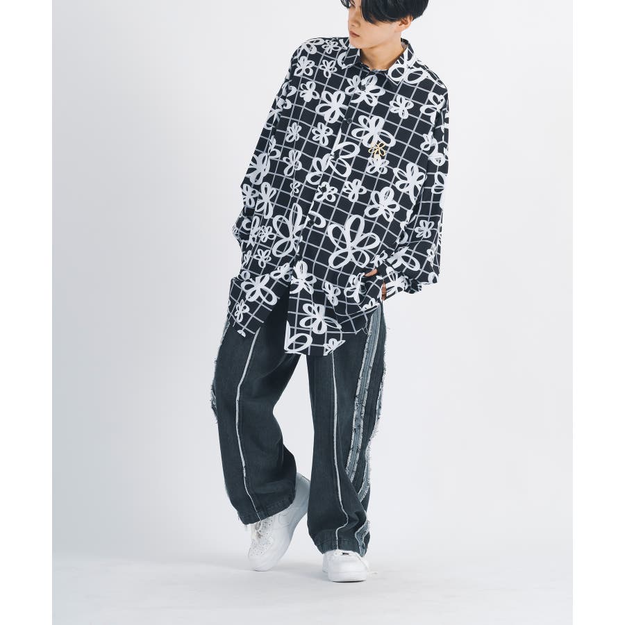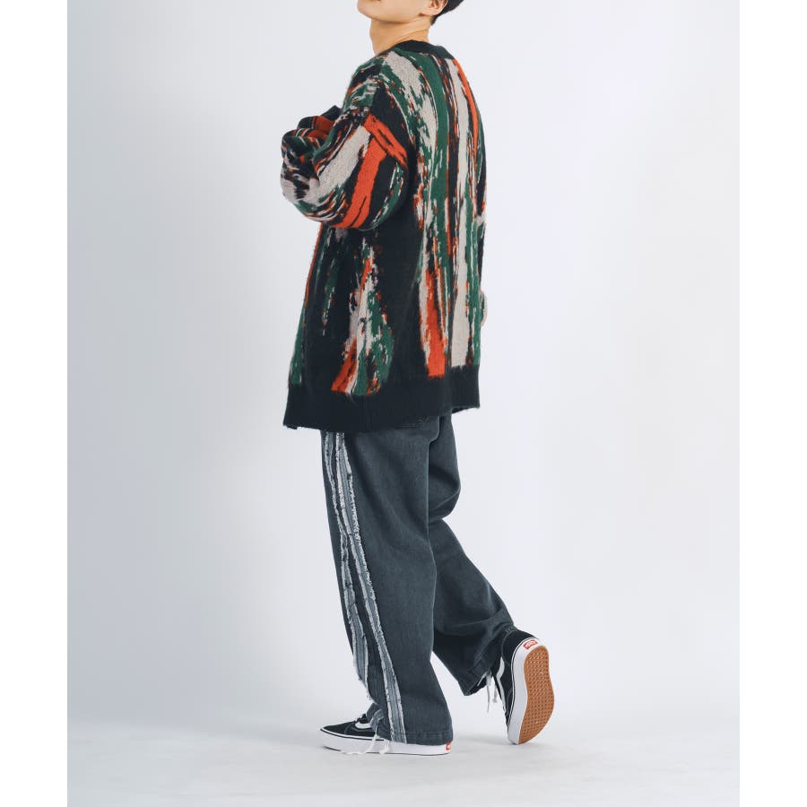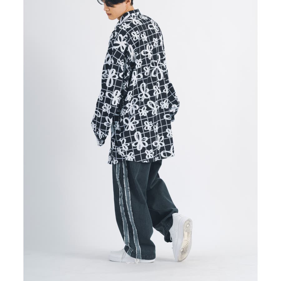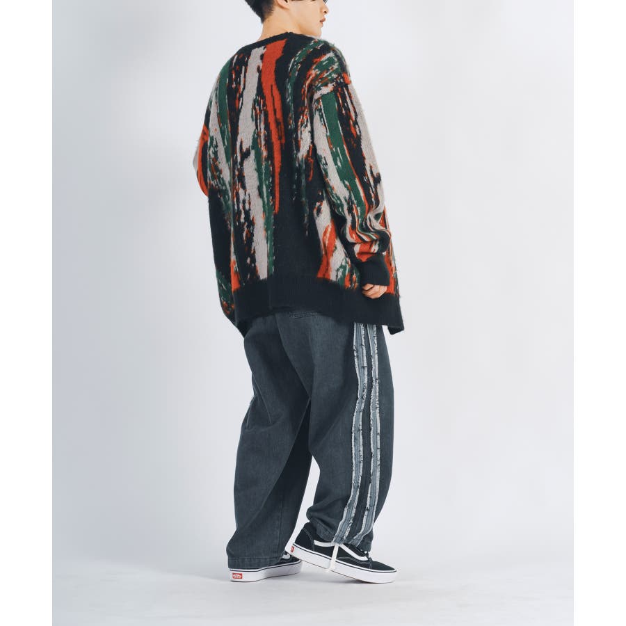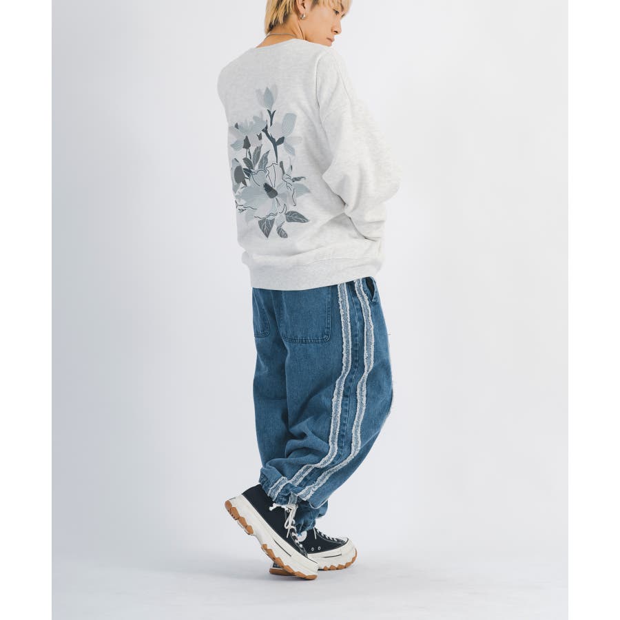 縦に入ったライン状のフリンジが印象的なワイドデニムパンツ。