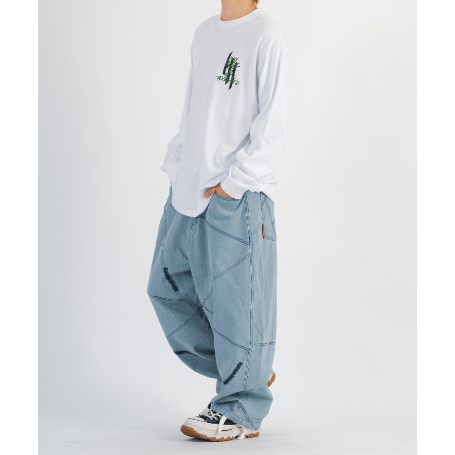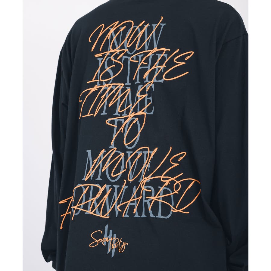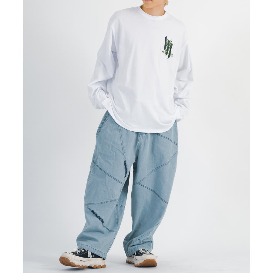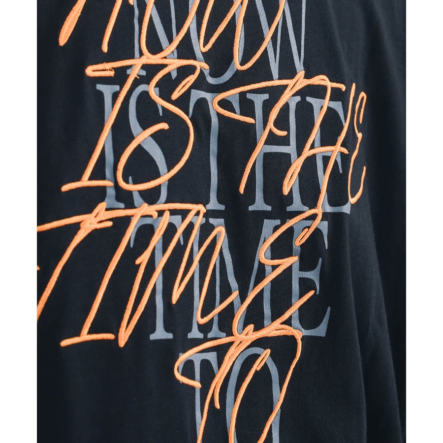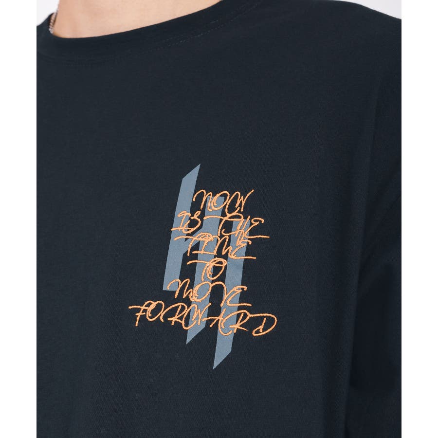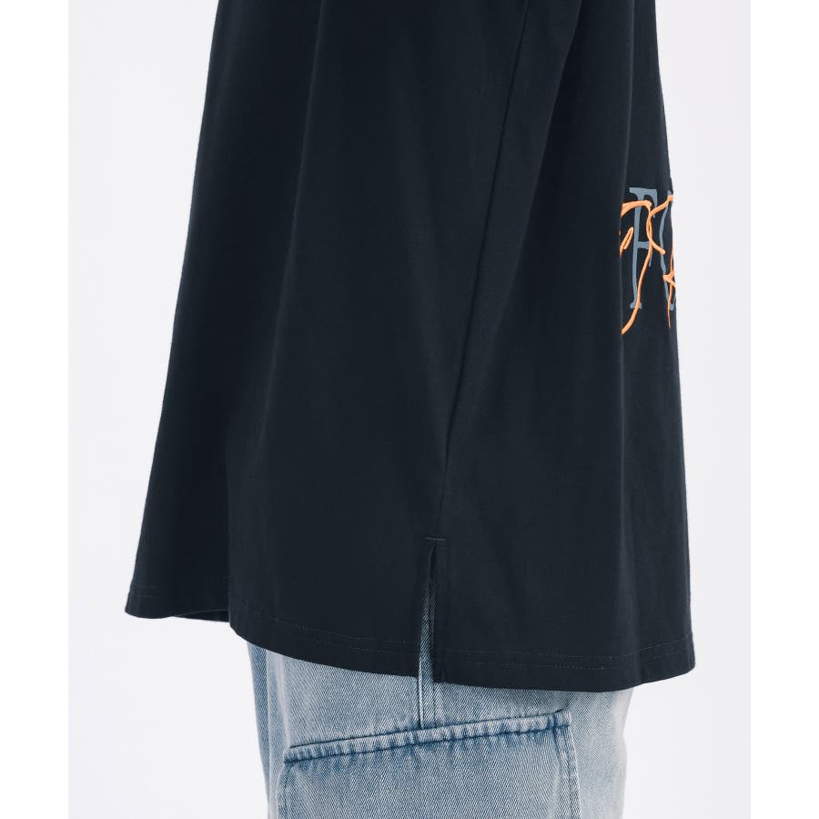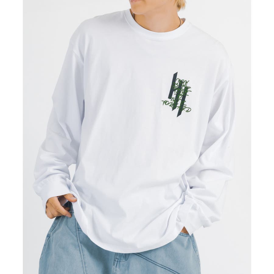 プリントと刺繍で重ねたデザインは奥行きのある立体感が一味違う。フロントも胸にワンポイントの刺繍を施し一枚で着ても様になる。袖にリブを設けたオーバーサイズのシルエットがストリート感を演出。