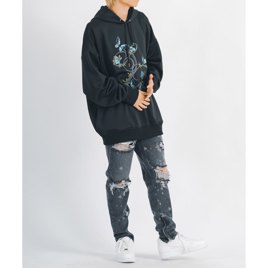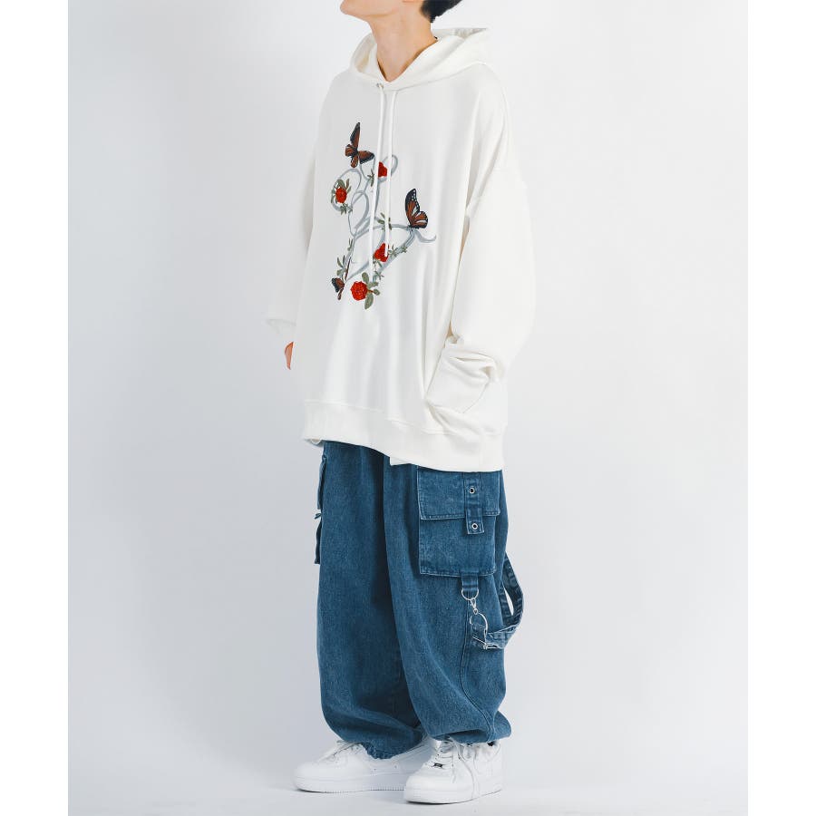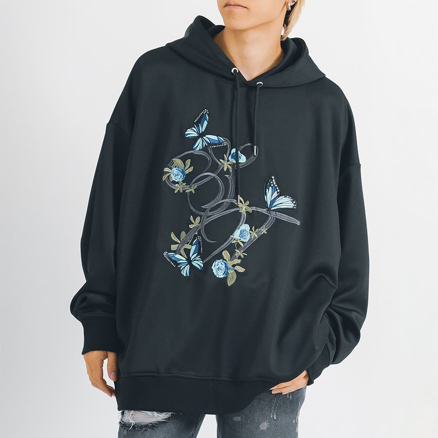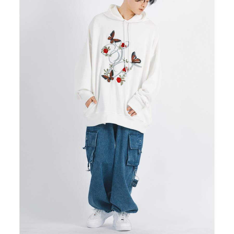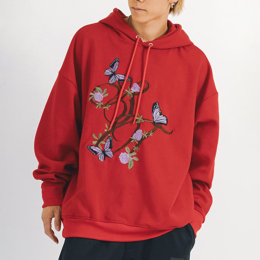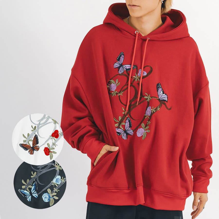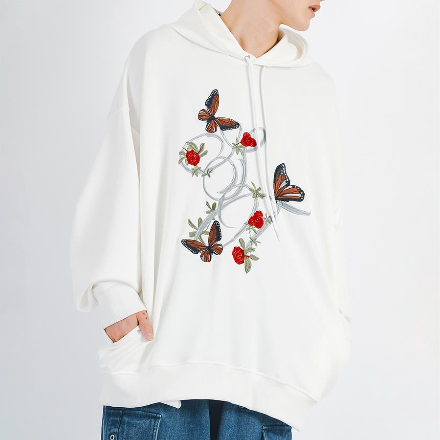 バタフライ刺繍 パーカー メンズ ストリート系 ビッグシルエット