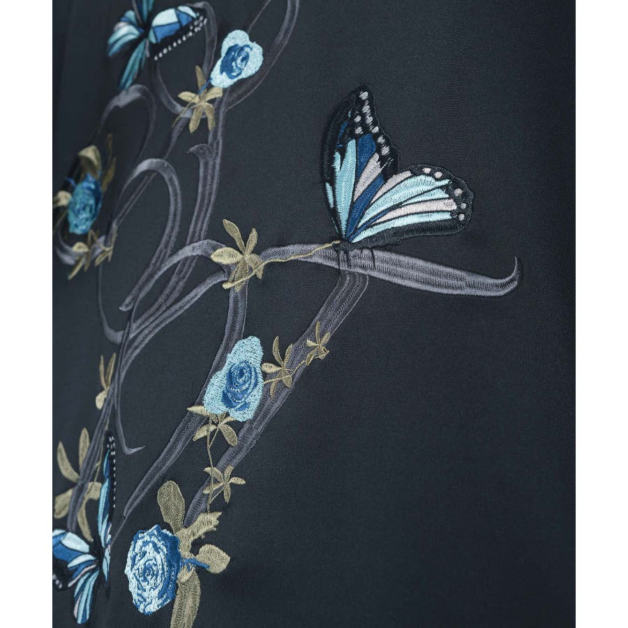 バタフライと薔薇の刺繍にプリントを組み合わせたフロントのデザインが特徴的。ポケットをサイドの縫い目に合わせた配置でフロントがすっきりしたデザイン。