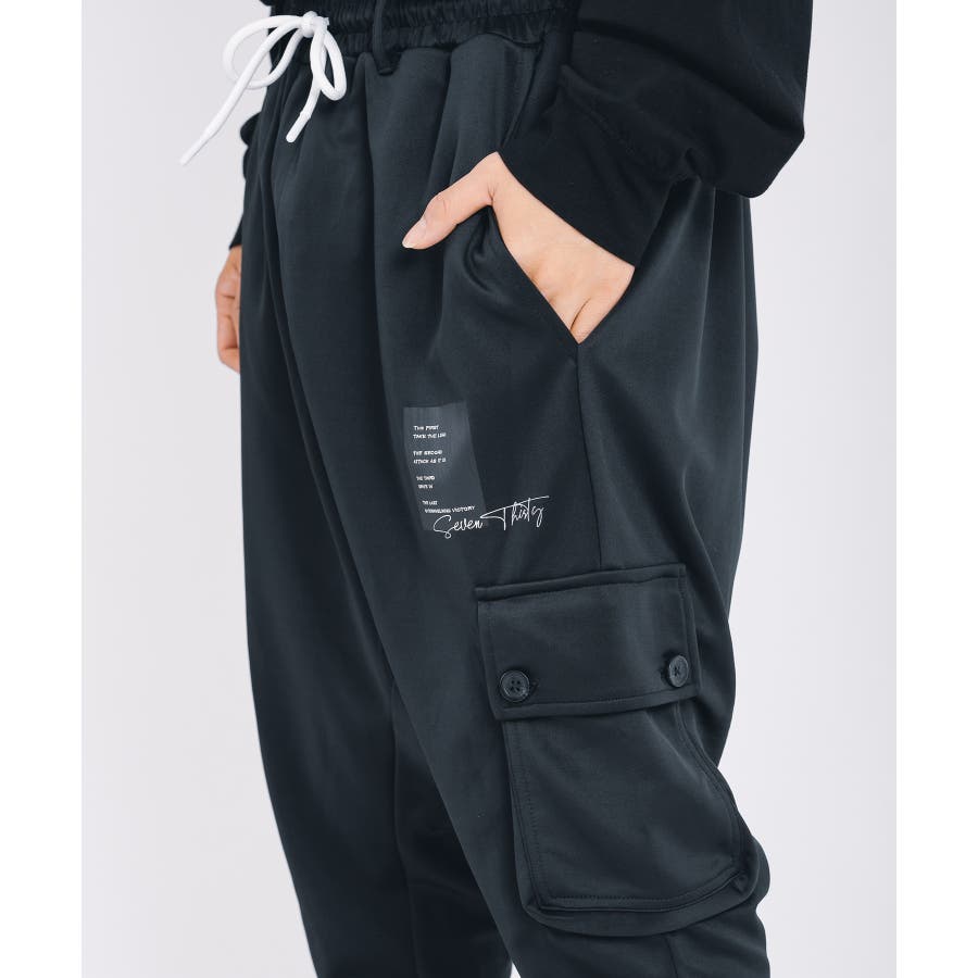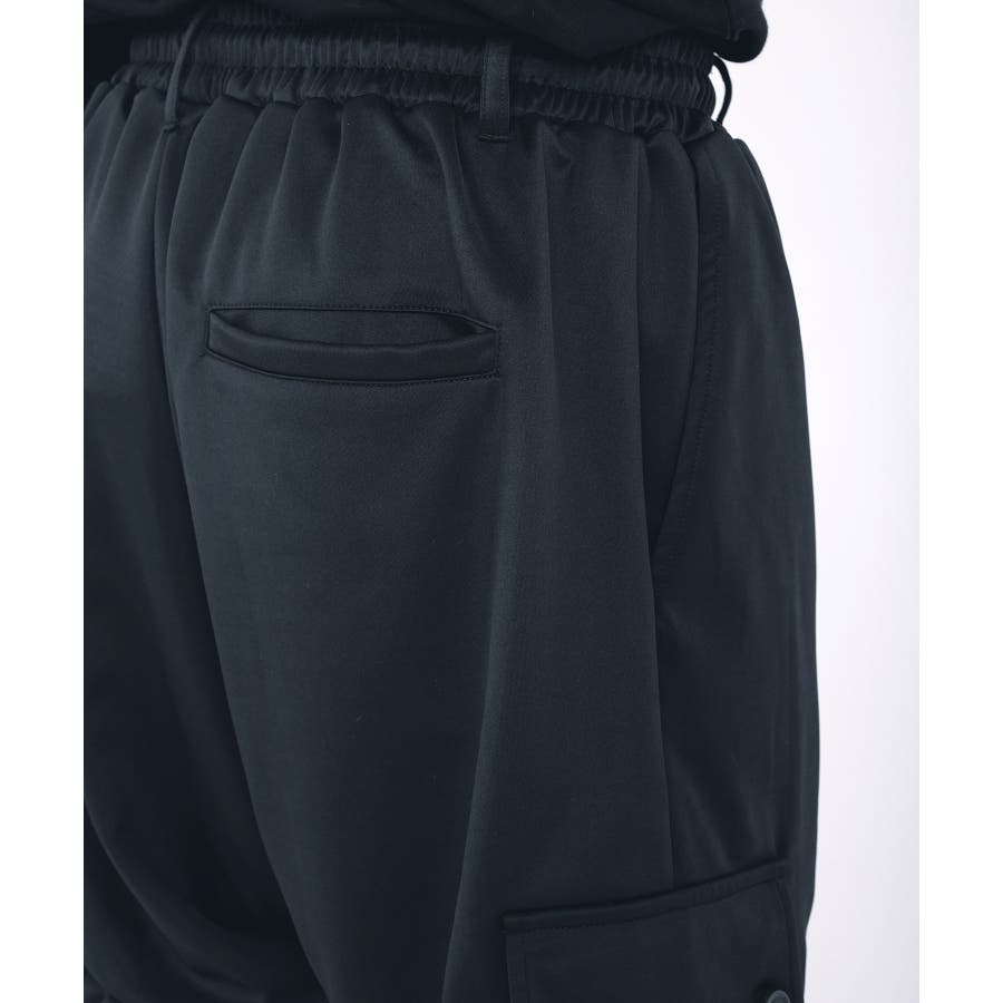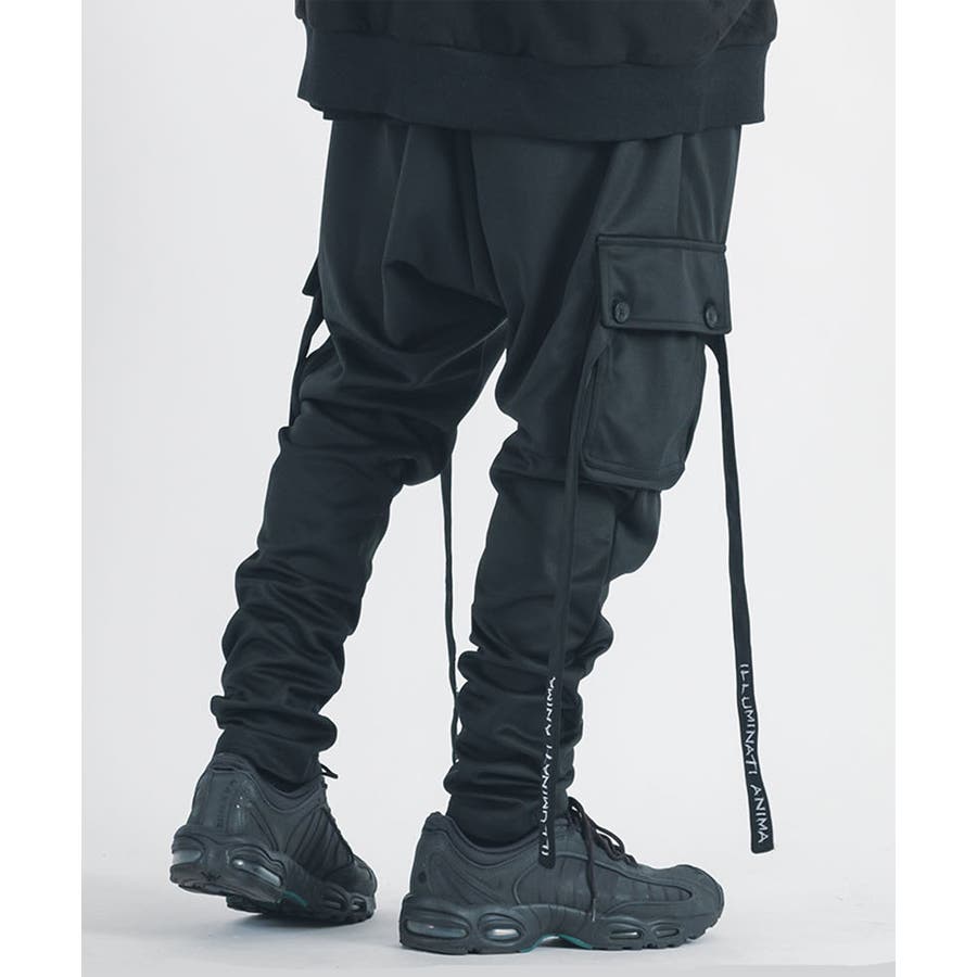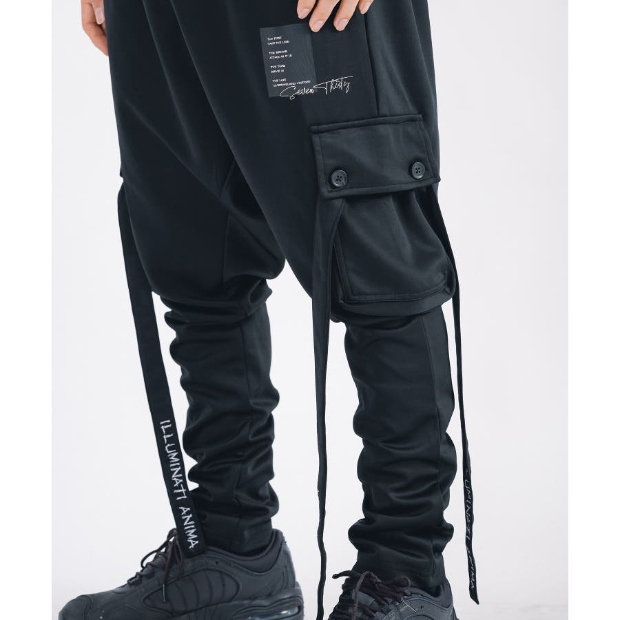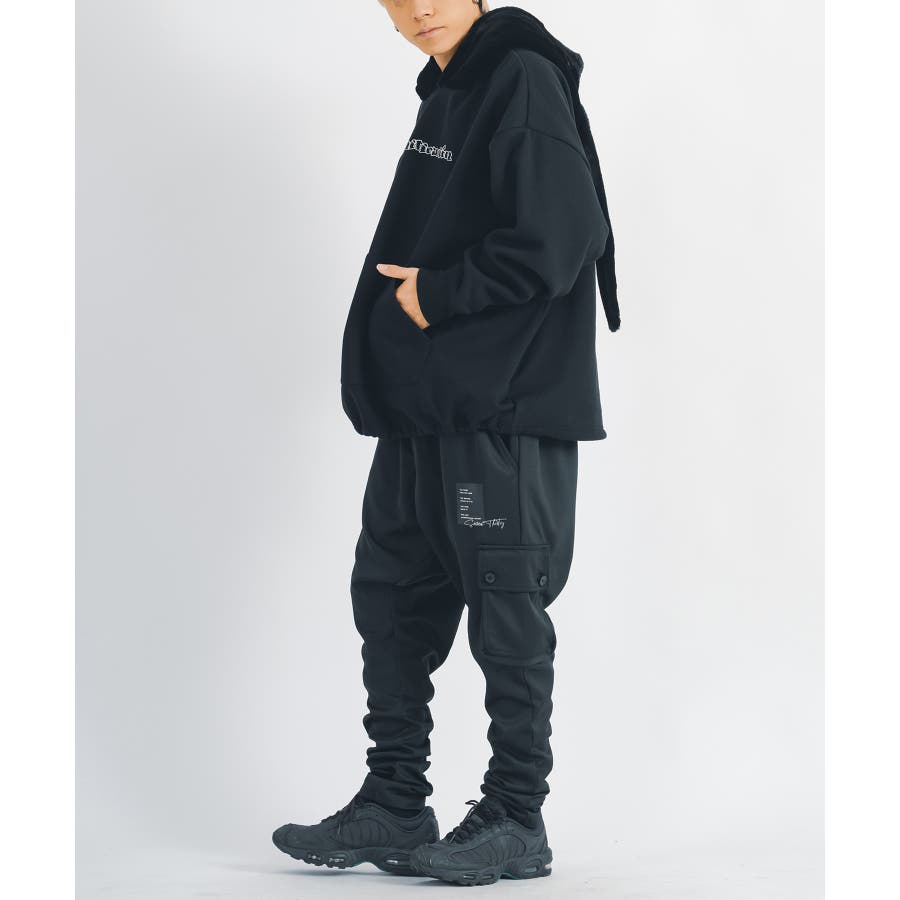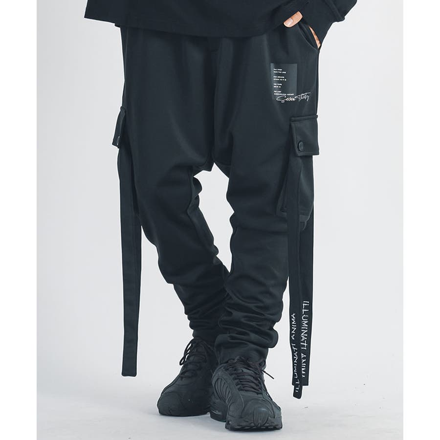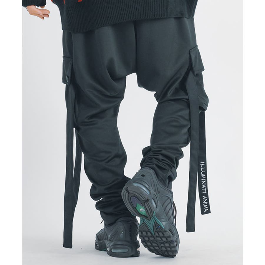 股上が深く太腿はゆったり膝下から裾にかけて細くなるサルエル仕様で、カーゴポケットに付属しているテープは脱着可能なアクセント。