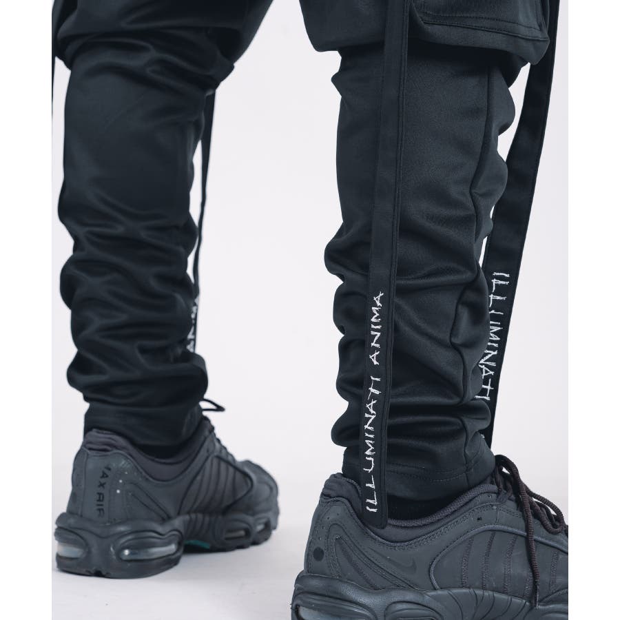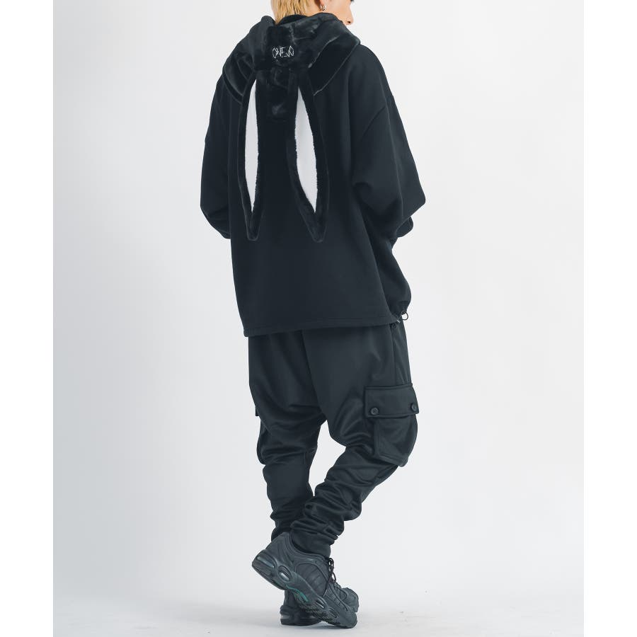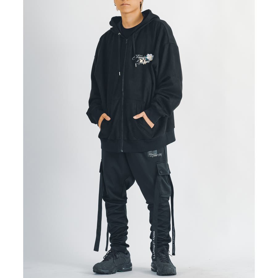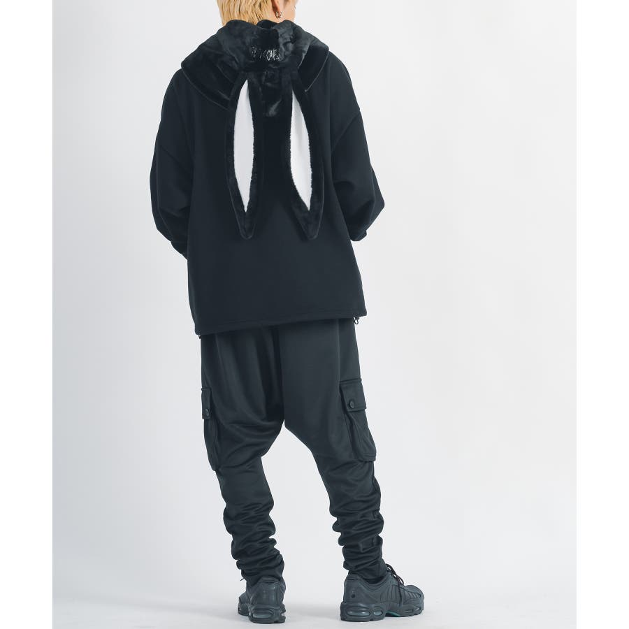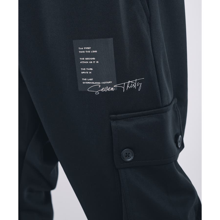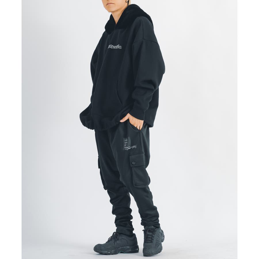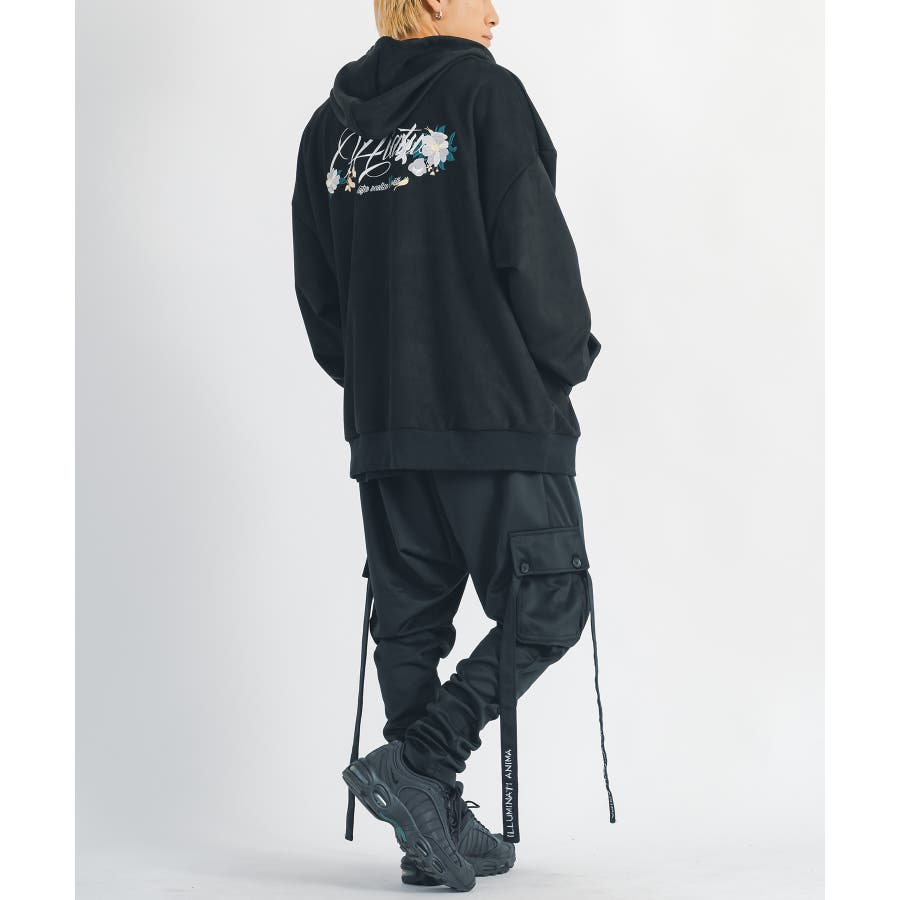 股上が深く太腿はゆったり膝下から裾にかけて細くなるサルエル仕様で、カーゴポケットに付属しているテープは脱着可能なアクセント。