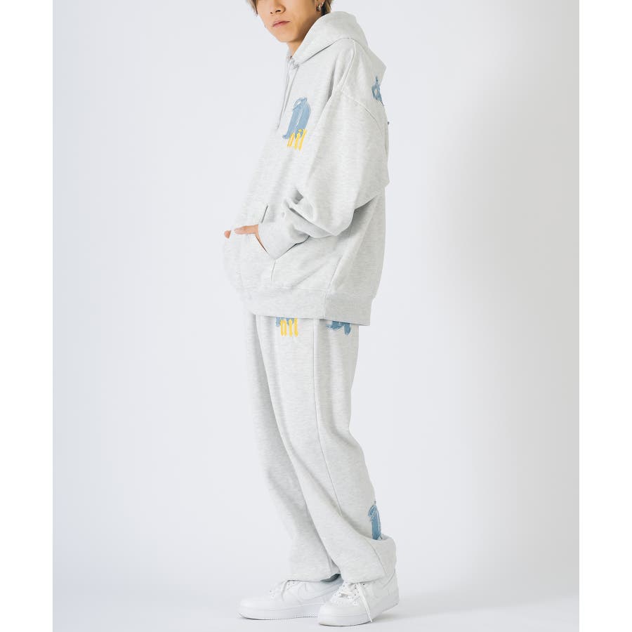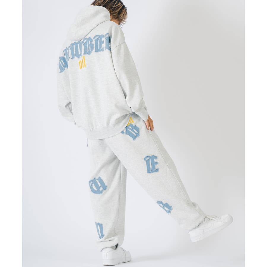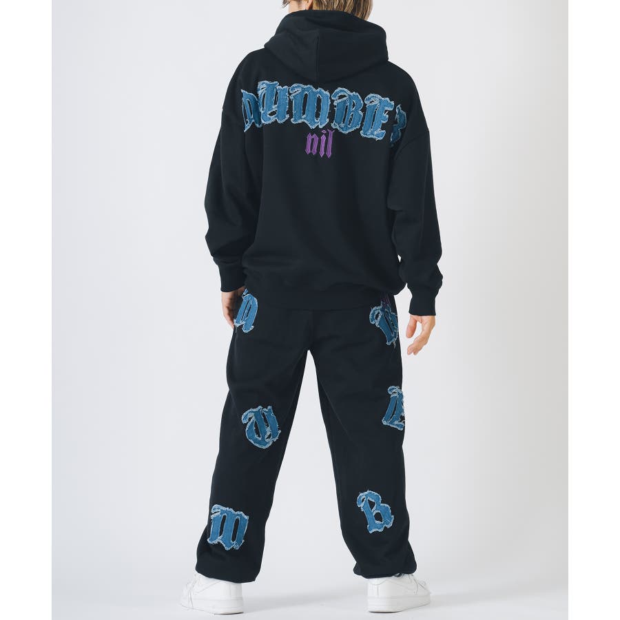 胸と背中に配置したロゴは、フリンジ加工されたデニム生地のアップリケで表現。プリントの文字では感じられないクラフト感があり、また着るほどにそのデニムアップリケの変化も楽しめる。お腹にはプルパーカーに定番のマフポケットを採用。