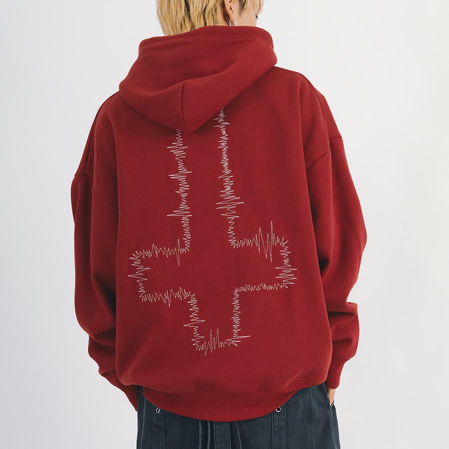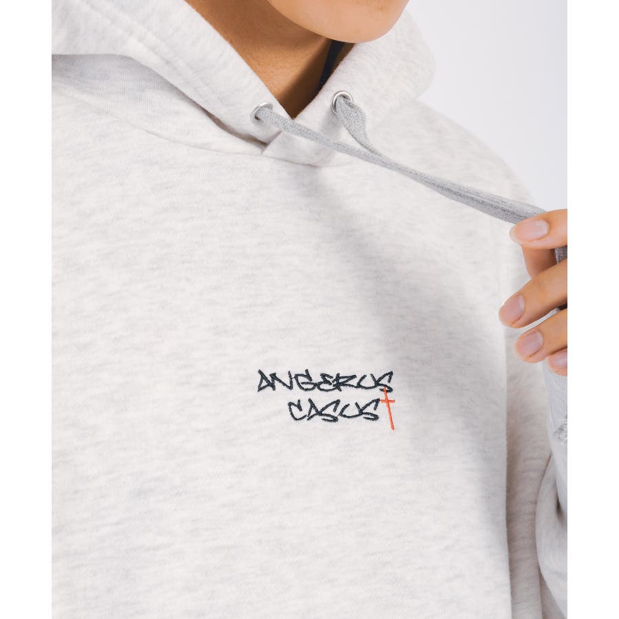 クラフト感のある背中のクロスのアップリケがクールなデザイン。胸のワンポイント刺繍が可愛く、お腹にはプルパーカーに定番のマフポケットを採用。